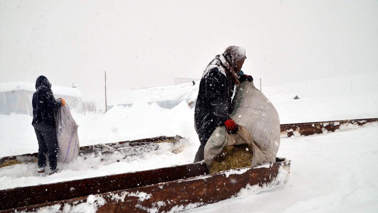 Karla kaplı ahırların çevresini temizleyen besiciler, yazın biriktirdikleri otları ezdikleri karın üzerinde sererek hayvanları besliyor.