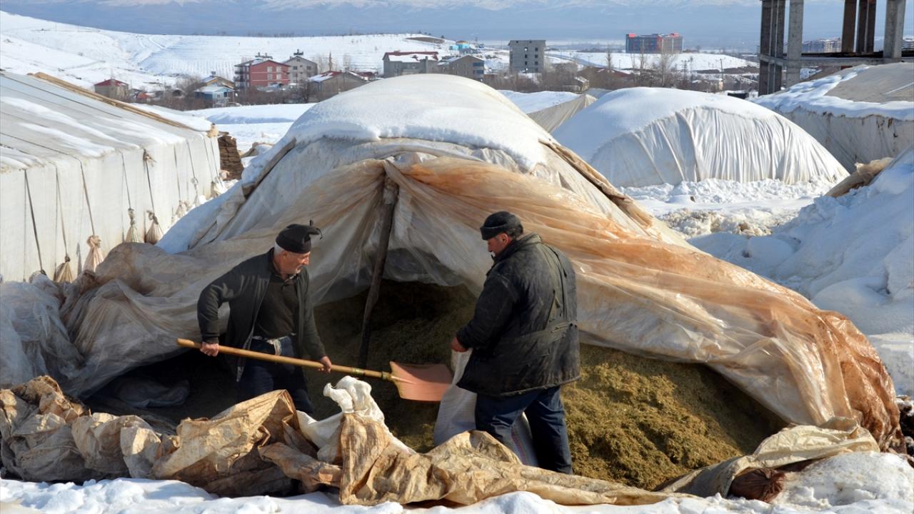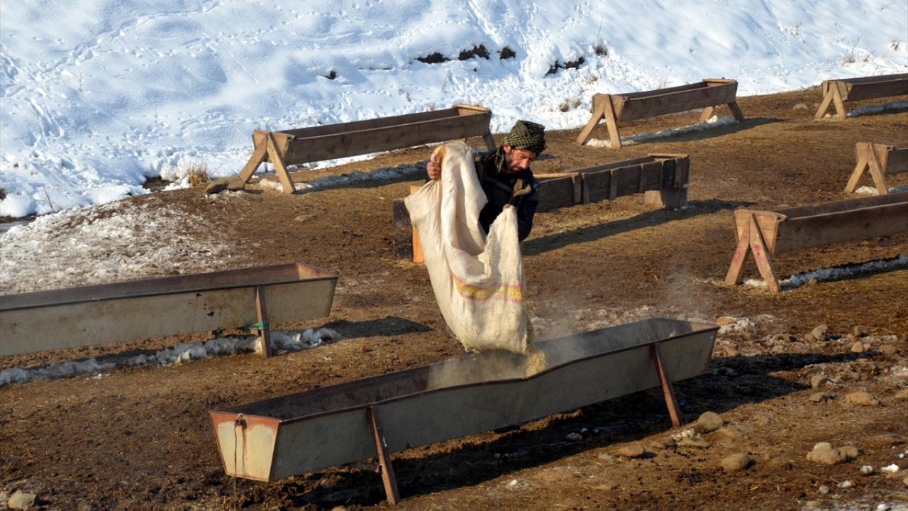 Yazın yaylalarda otlattıkları hayvanlarına kış boyunca ahır ve naylon çadırlarda bakan besiciler, gün içerisinde buradan çıkardıkları hayvanlarına kar üzerinde yem veriyor.