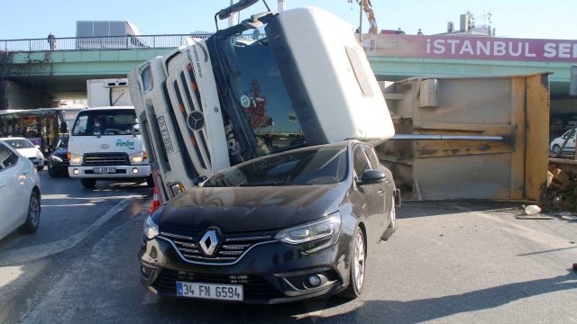 Otomobilin üzerine hafriyat kamyonu devrildi