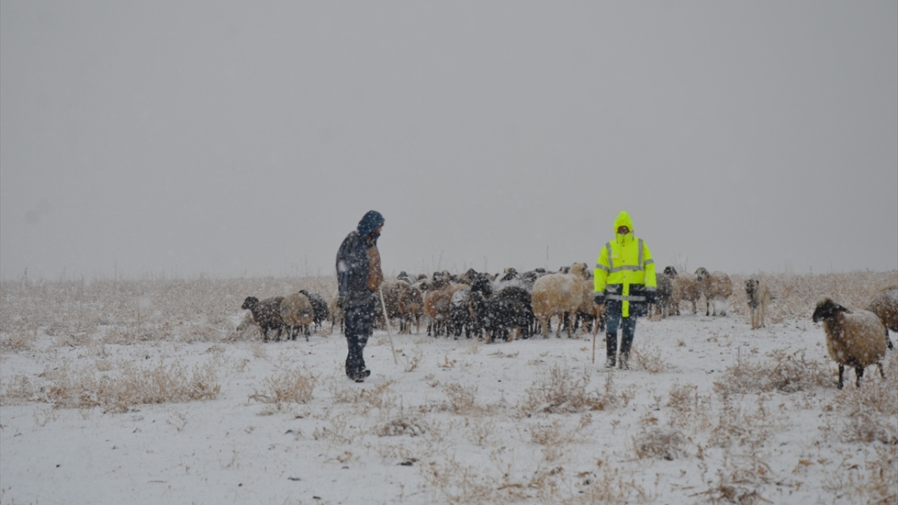 Muş'ta kırsal alanda koyun otlatırken kar yağışına yakalanan çobanlar hayvanları yerleşim alanlarına götürdü.