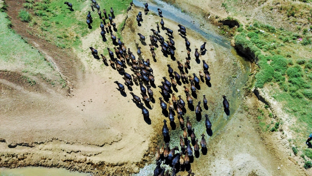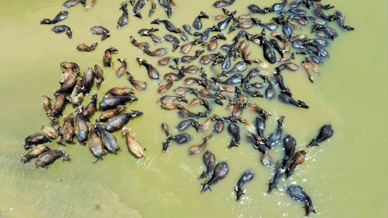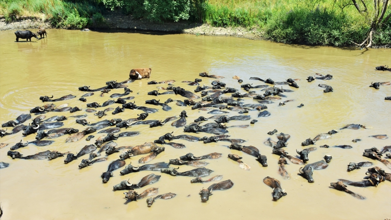 Muş'ta mandaların nehirde serinlemesi renkli görüntüler oluşturdu