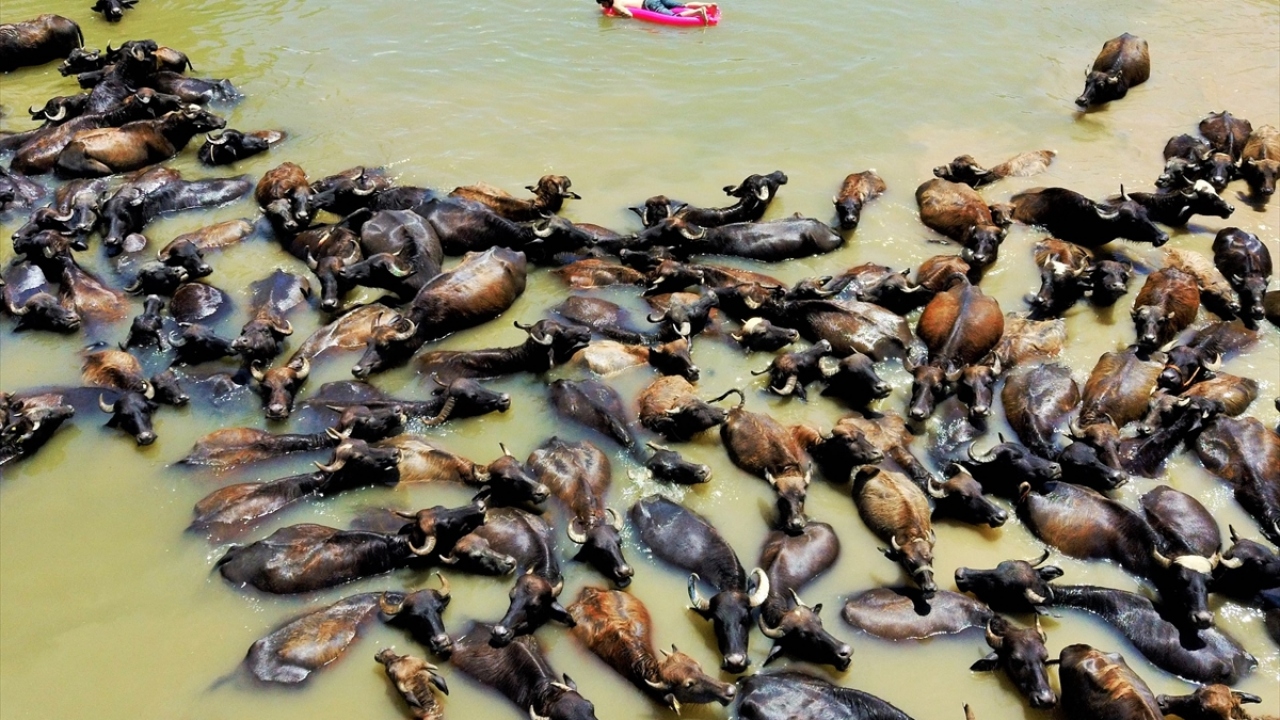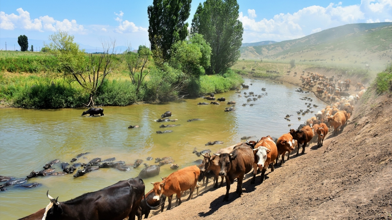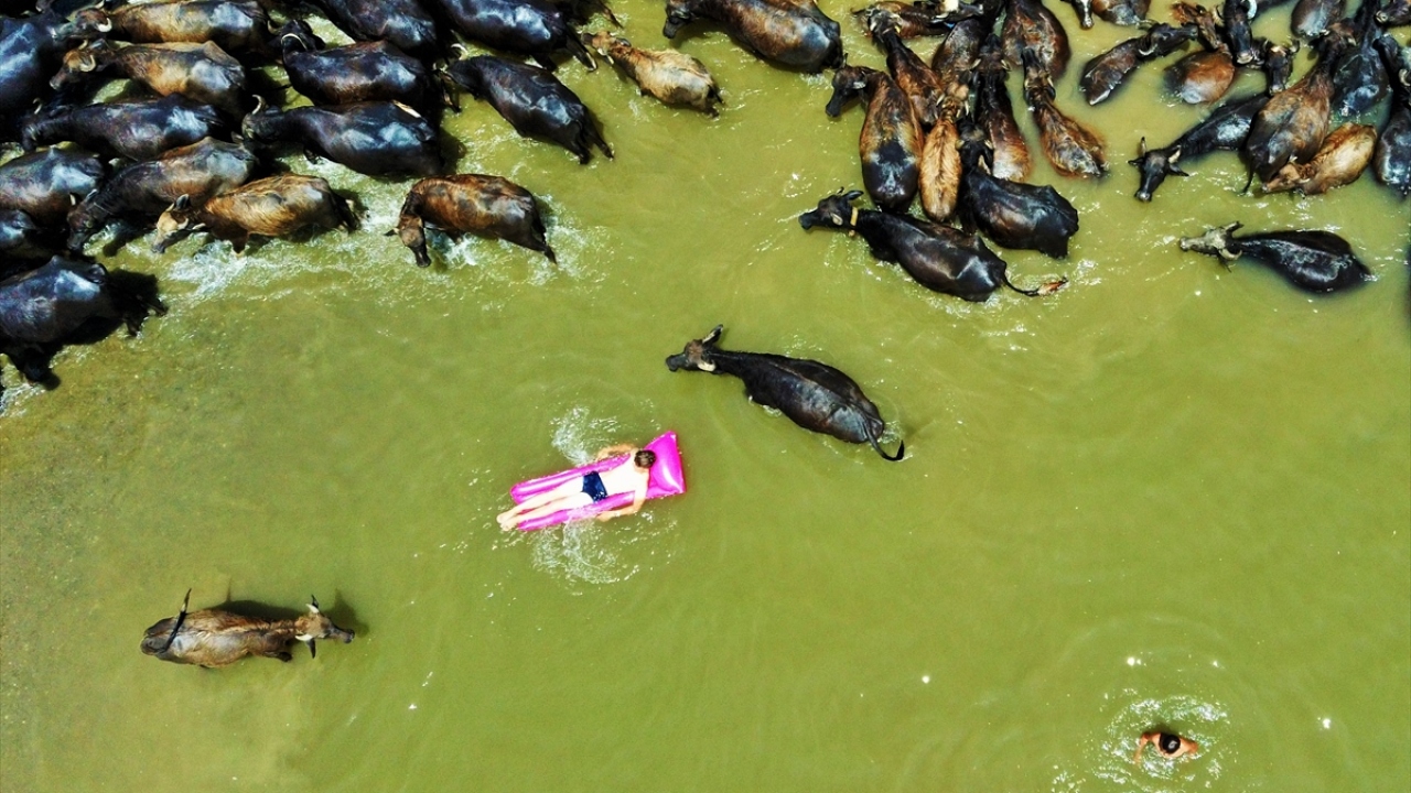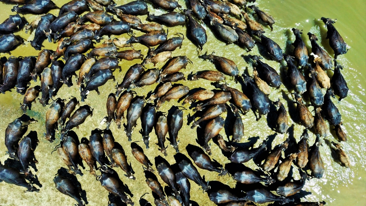 Muş'ta mandaların nehirde serinlemesi renkli görüntüler oluşturdu