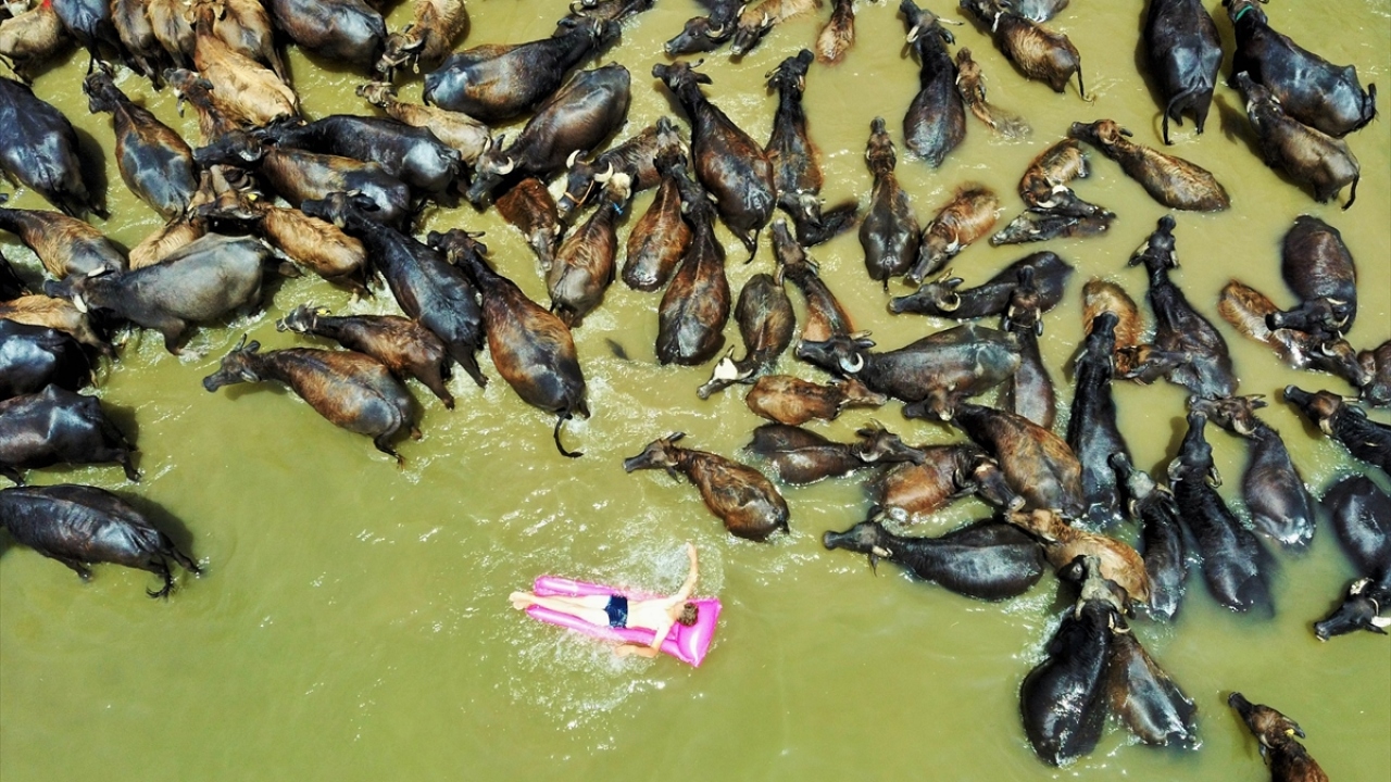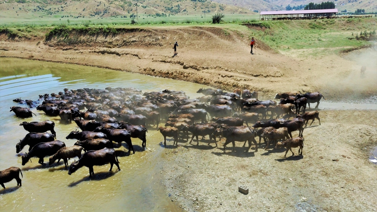 Muş'un Hasköy ilçesinde çobanların, sıcaktan etkilenen manda sürüsünü nehirde serinletmesi renkli görüntüler oluşturdu.
