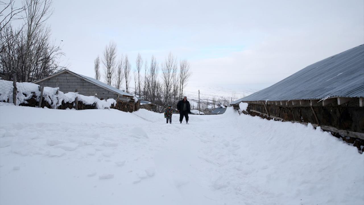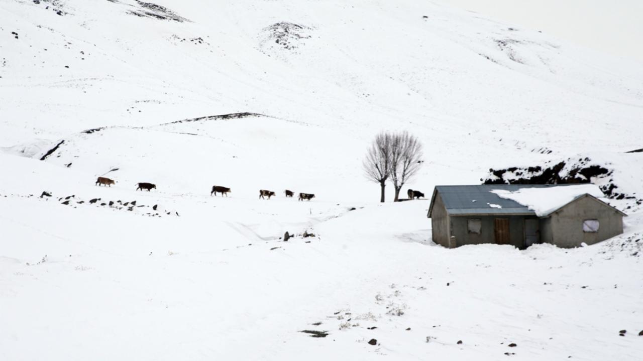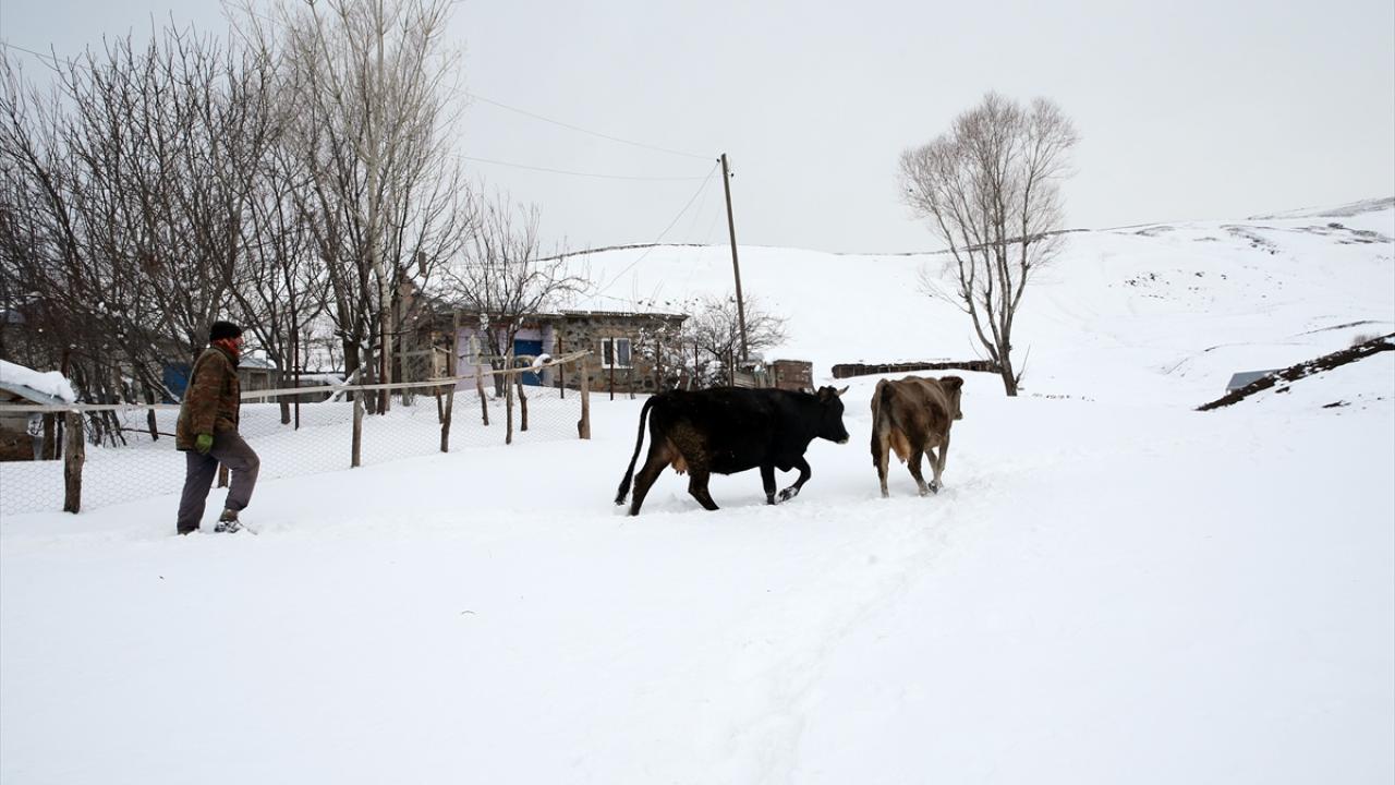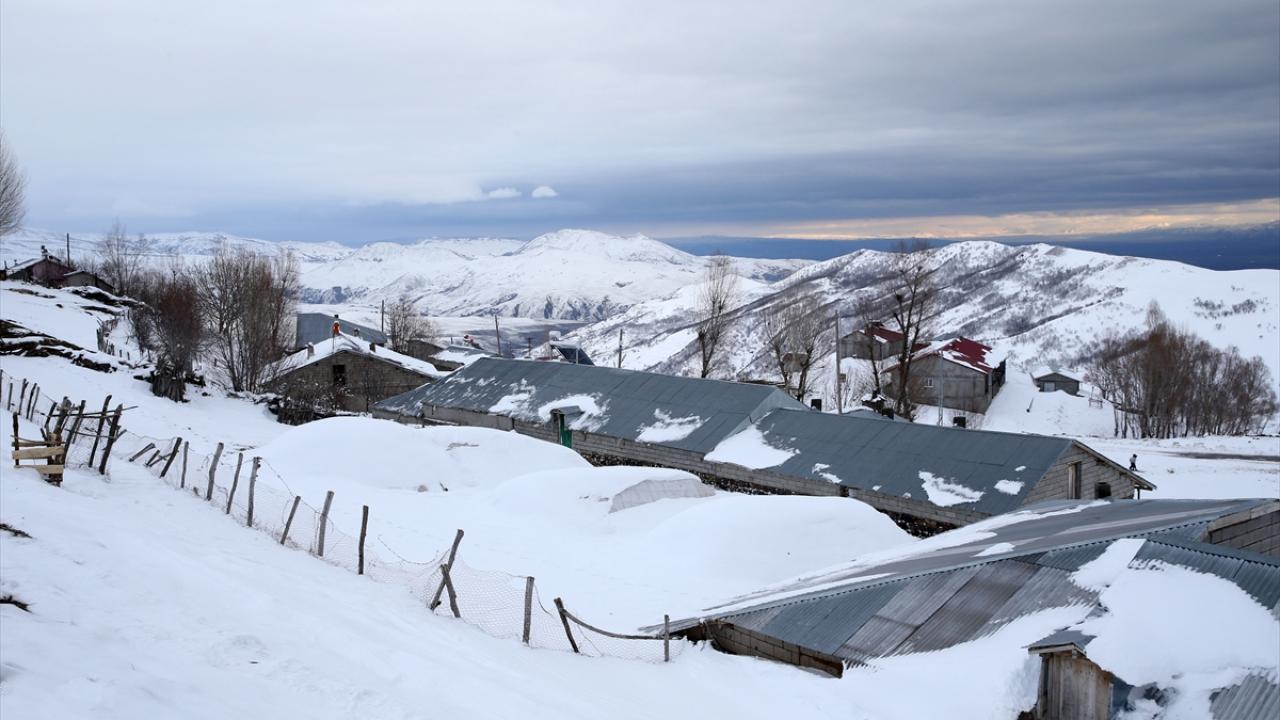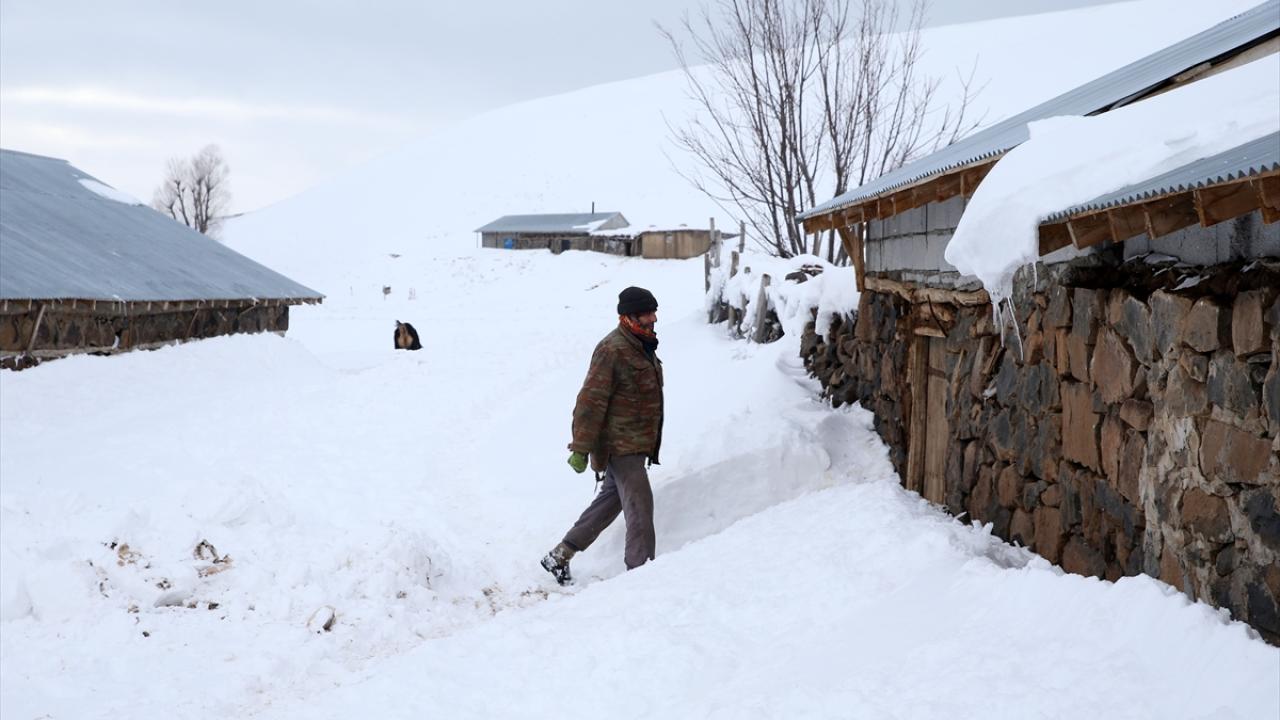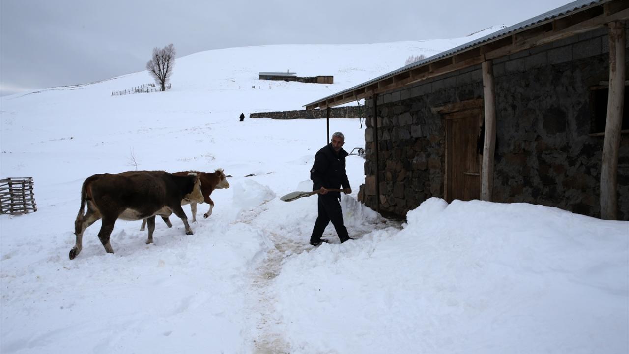 Yüksek rakımlı dağların yamaçlarına kurulan köylerde de etkili olan kar yağışının ardından vatandaşlar, ev ve ahırların önünde biriken karları temizliyor.