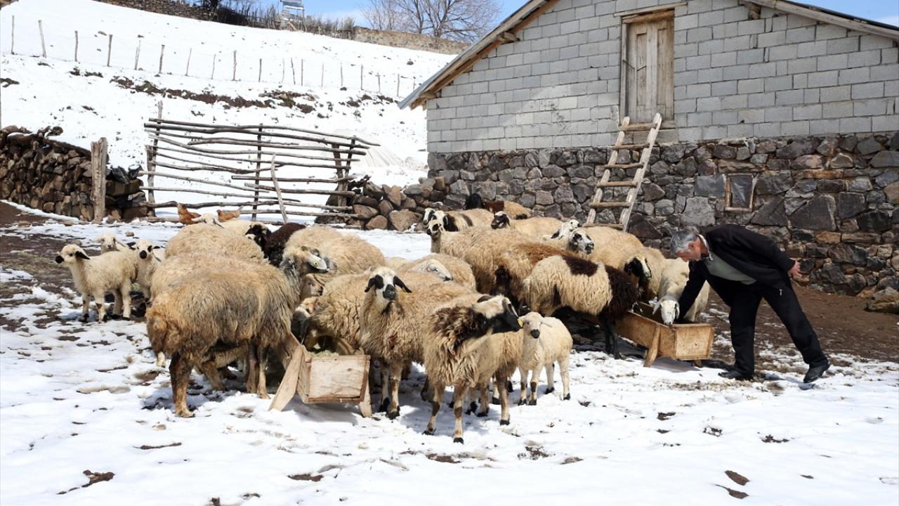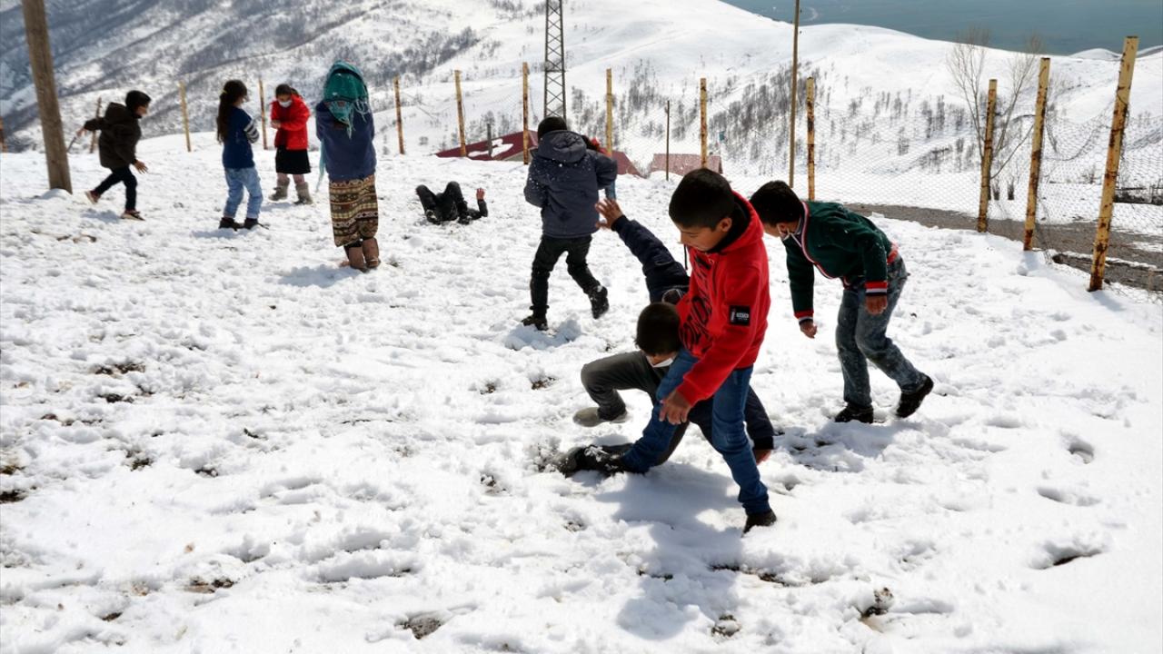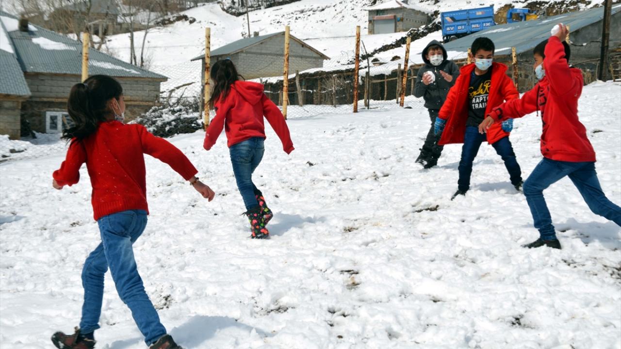 Besicilerin kar üzerinde hayvanlarını beslediği köyde, çocuklar da kar topu oynayarak eğlendi.
