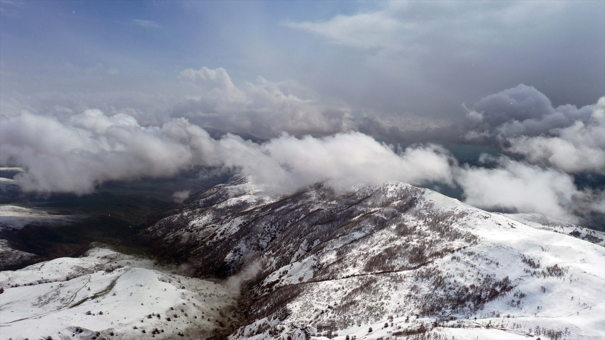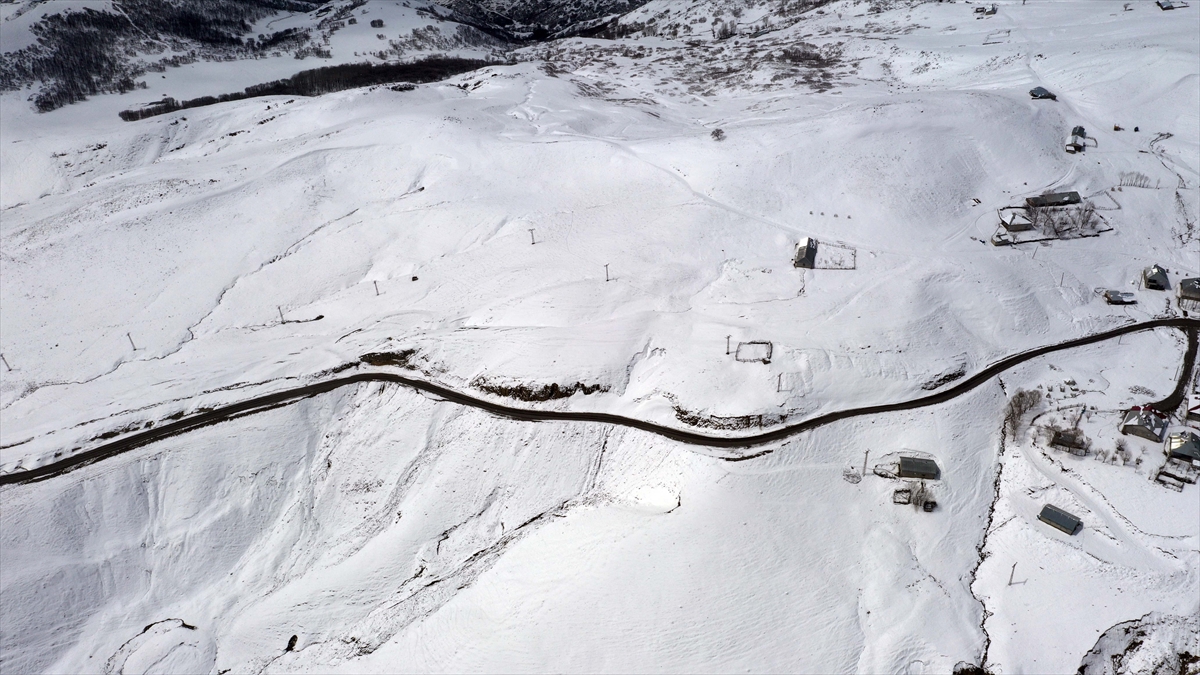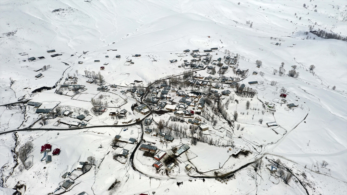 Beyaza bürünen köy ve yüksek dağlardaki manzara, drone ile görüntülendi.