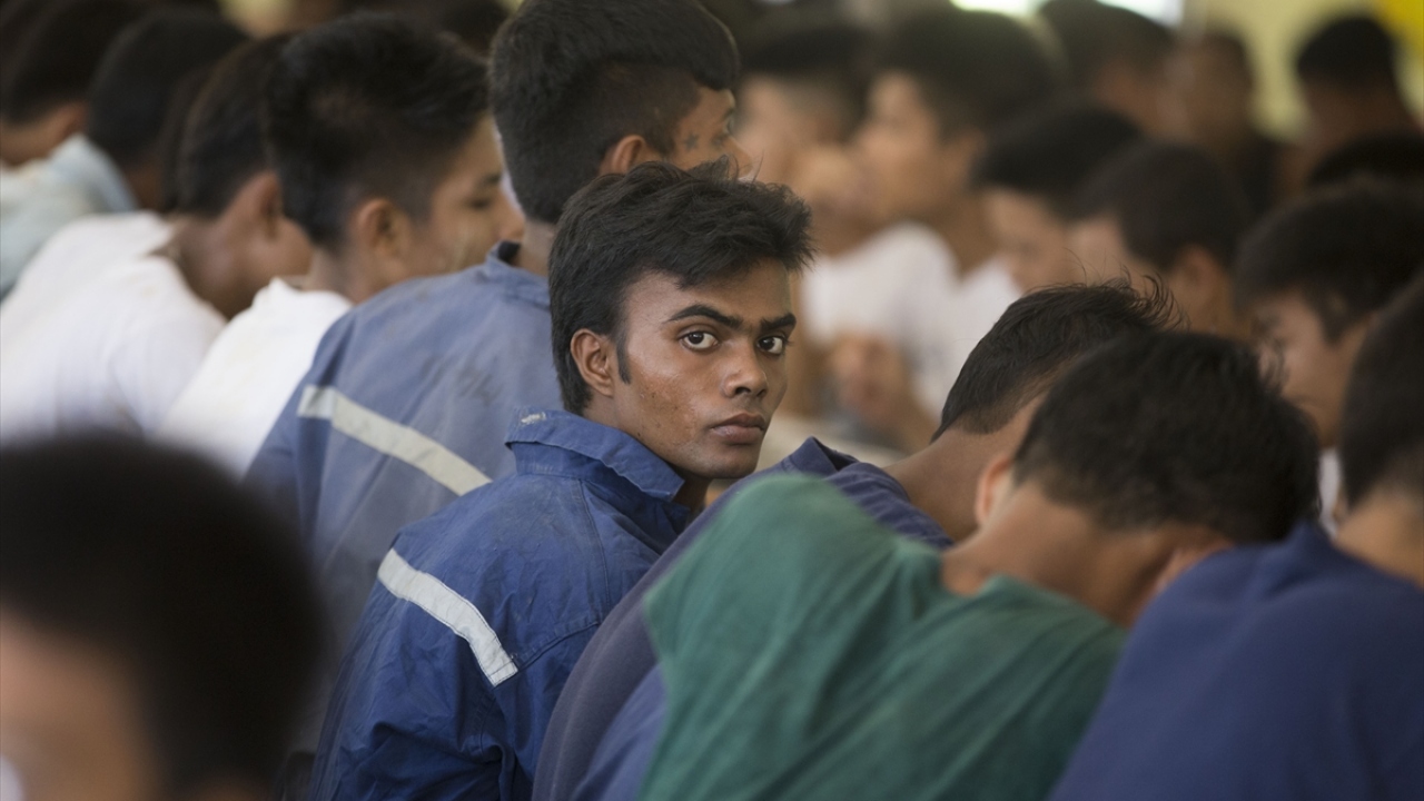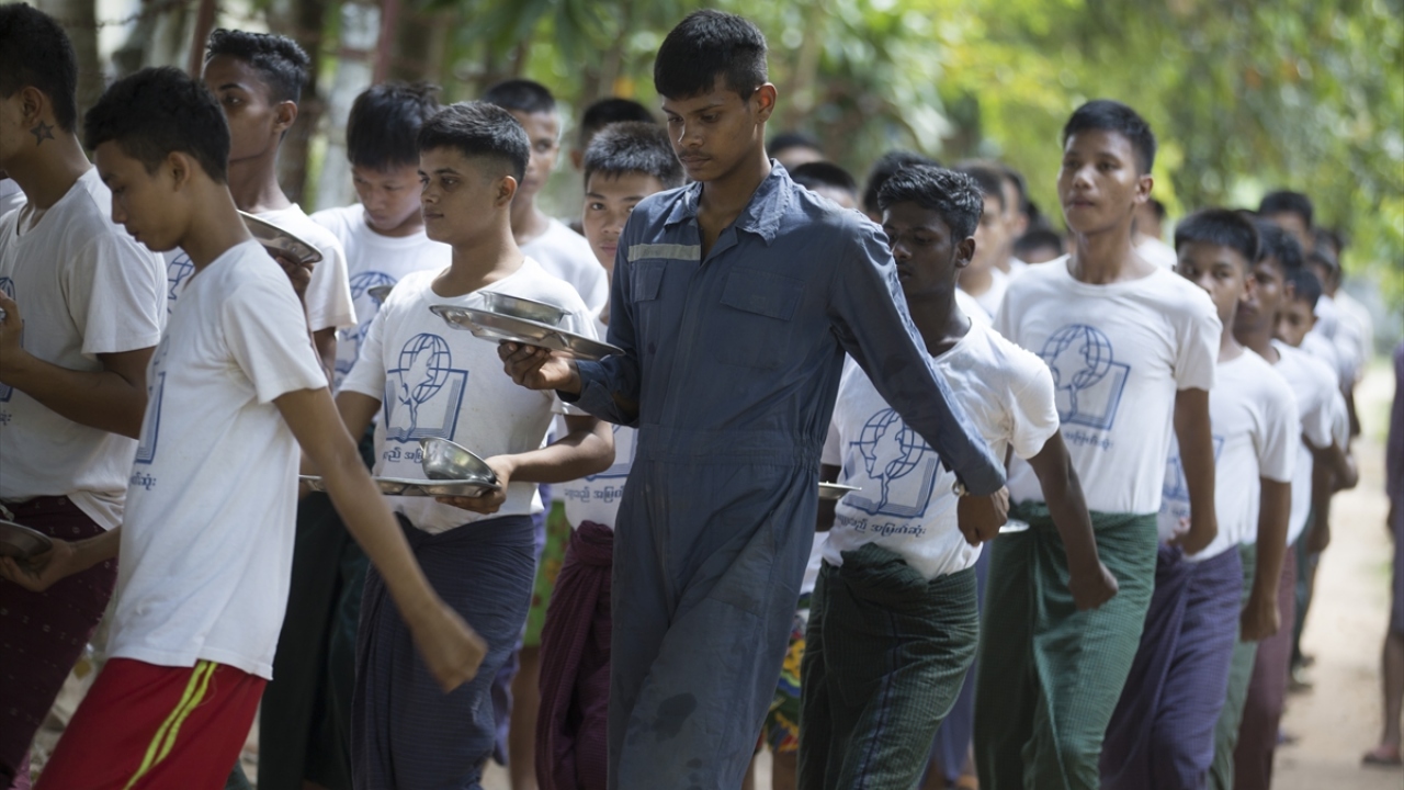 Bir çoğu, Yangon`a ya da ülke dışına izinsiz seyahate teşebbüs ettikleri için hüküm giyerek bu merkeze gönderilen Arakanlı gençler, aralarında Budistlerin de bulunduğu diğer gençlerle beraber ortak yemekhanede yemek yiyorlar.