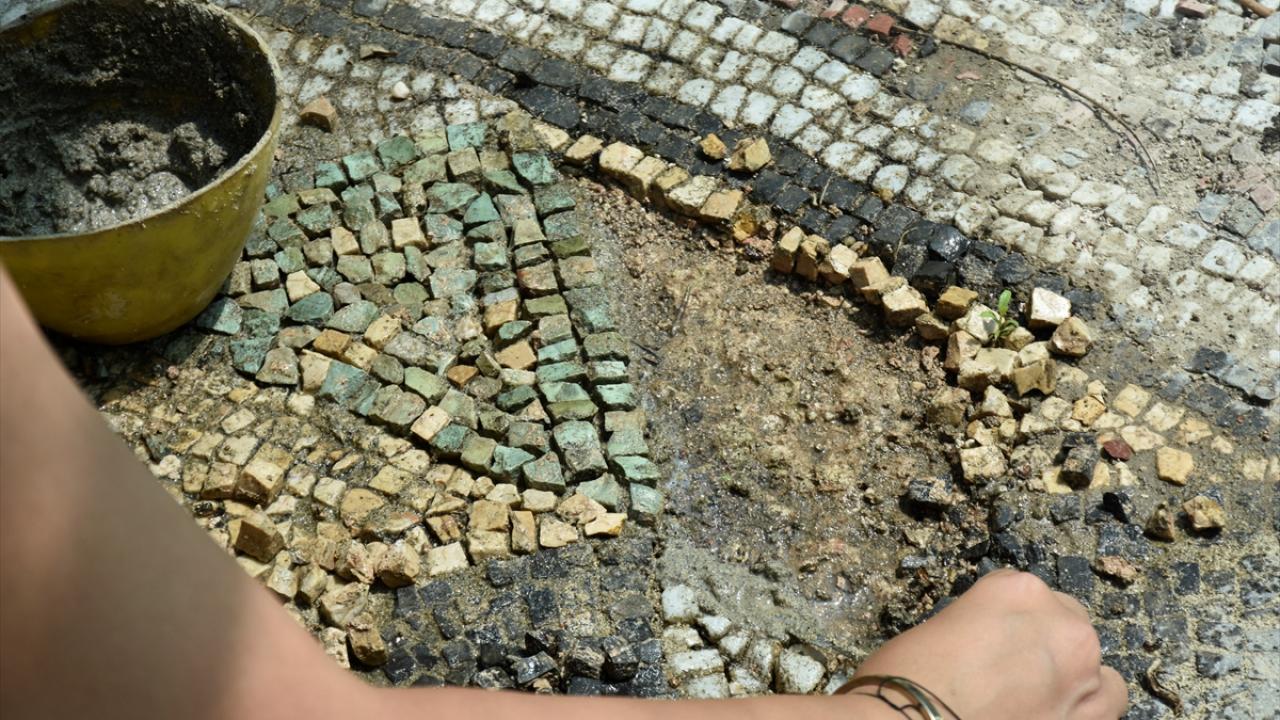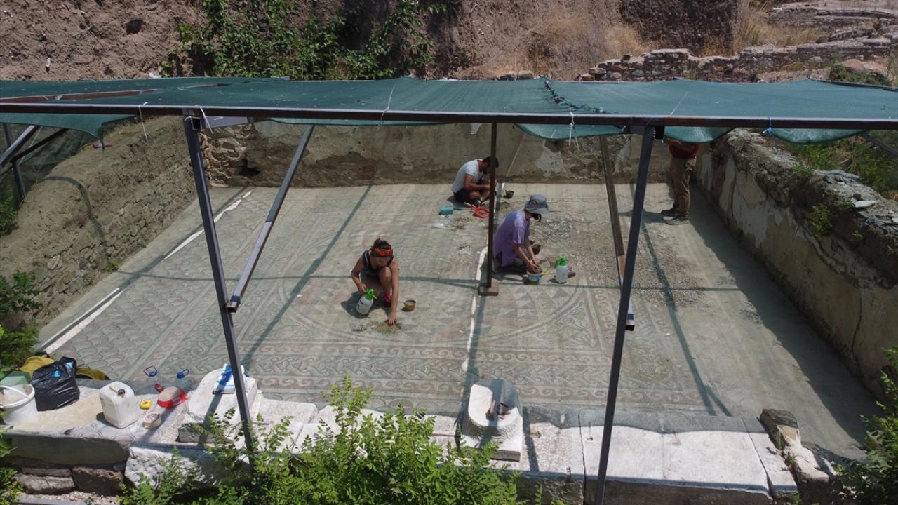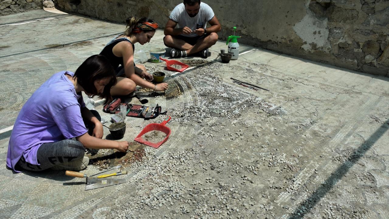 "Küçük kısmı, bir köşesi kaldı mozaiğin derlenip toplanacak, ondan sonra da artık sürekli bakımına alacağız. Yağmur yağdığı ve alttaki tabakalar boşaldığı için üzerinde yüründüğü zaman hasar görüyor, onlara dolgu yapacağız ve altına bir toplayıcı malzemeyle bu mozaiğimizi sürekli korumaya alacağız. Ondan sonra da artık üzerine çatı malzemesi, çatı elemanları gelene kadar da sürekli korumaya alıp bırakacağız çalışmamızı."
