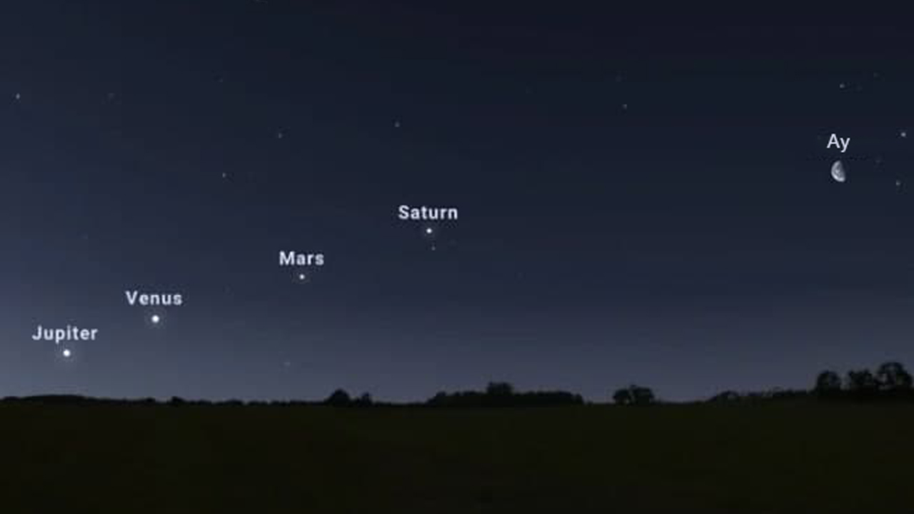 Ufukta, görüş koşullarının iyi olması koşuluyla, Jüpiter`in ufka yakınlığıyla göksel sırada hizalanmış dört gezegen de seçilebilecek.