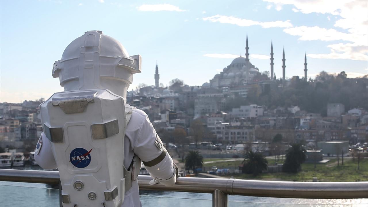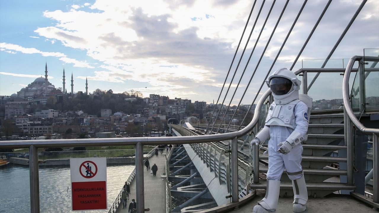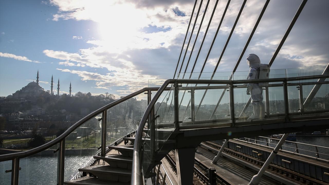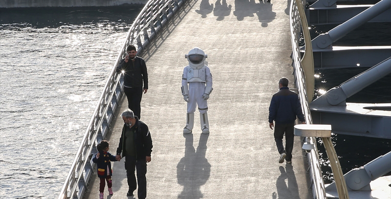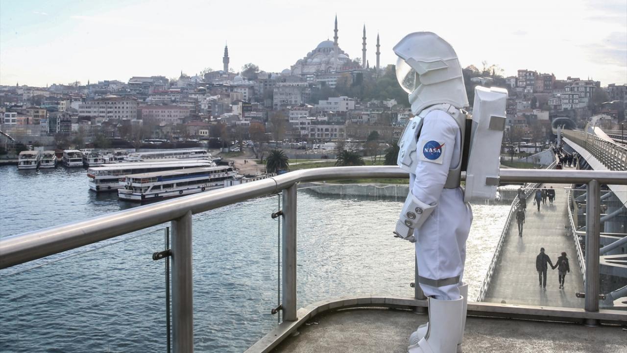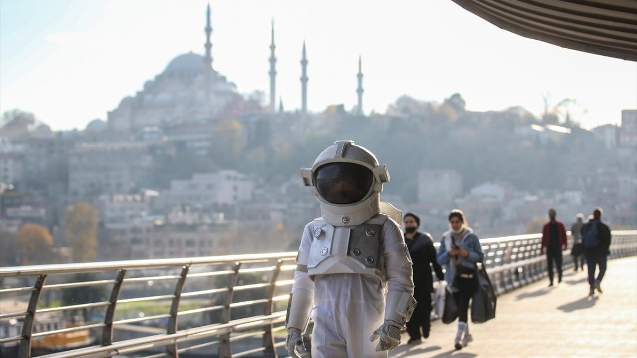 Açılış öncesi serginin tanıtımı için astronot kıyafeti giyen bir kişi M2 Yenikapı-Hacıosman metro hattındaki duraklarda gezerek Haliç durağında inip İstanbul`un tarihi manzarasını izledi.