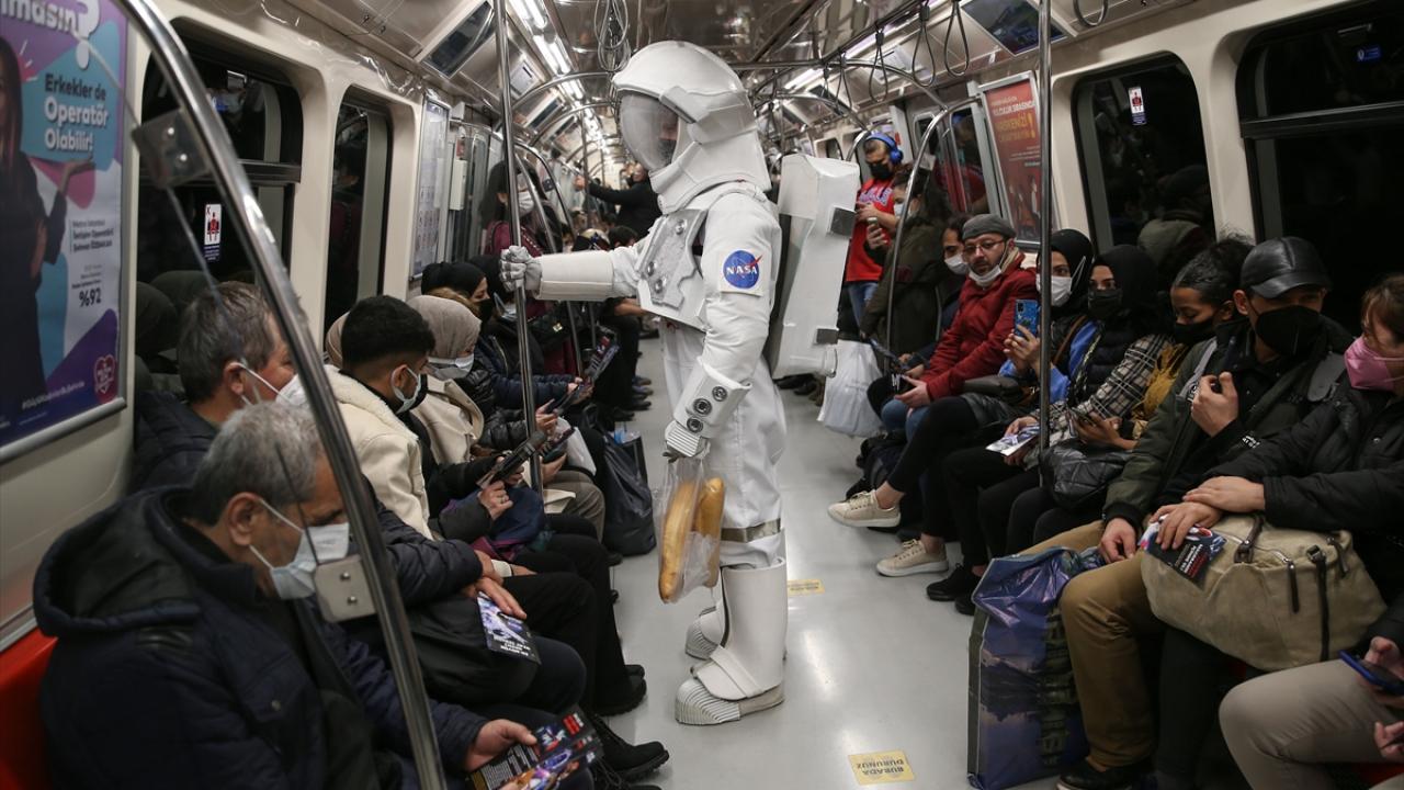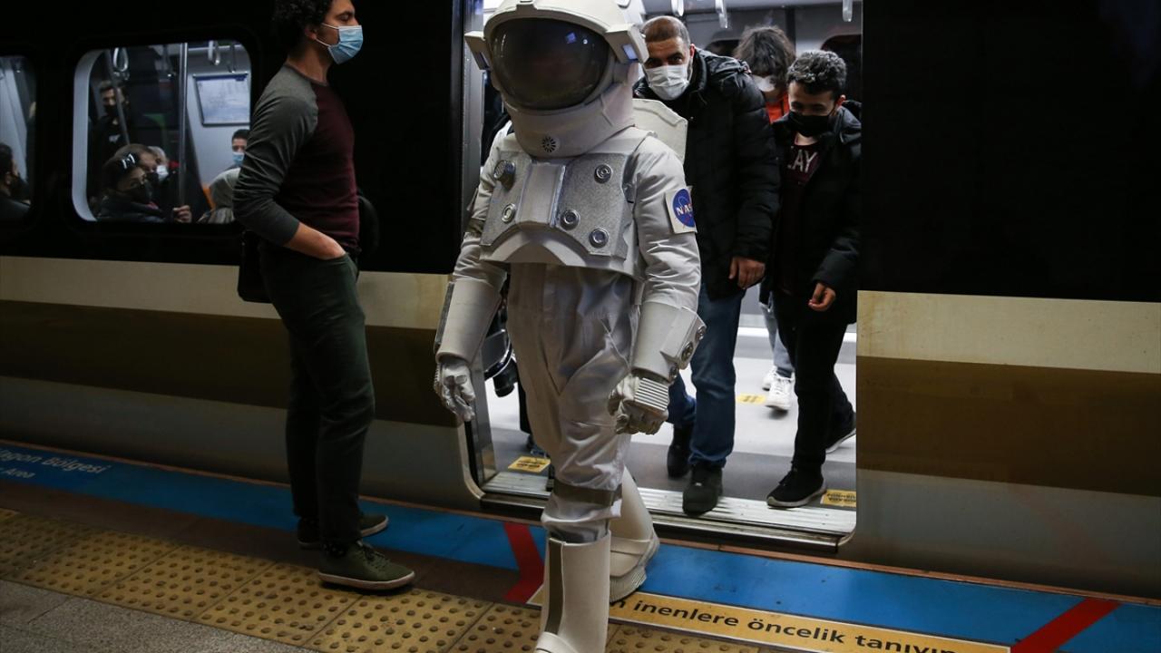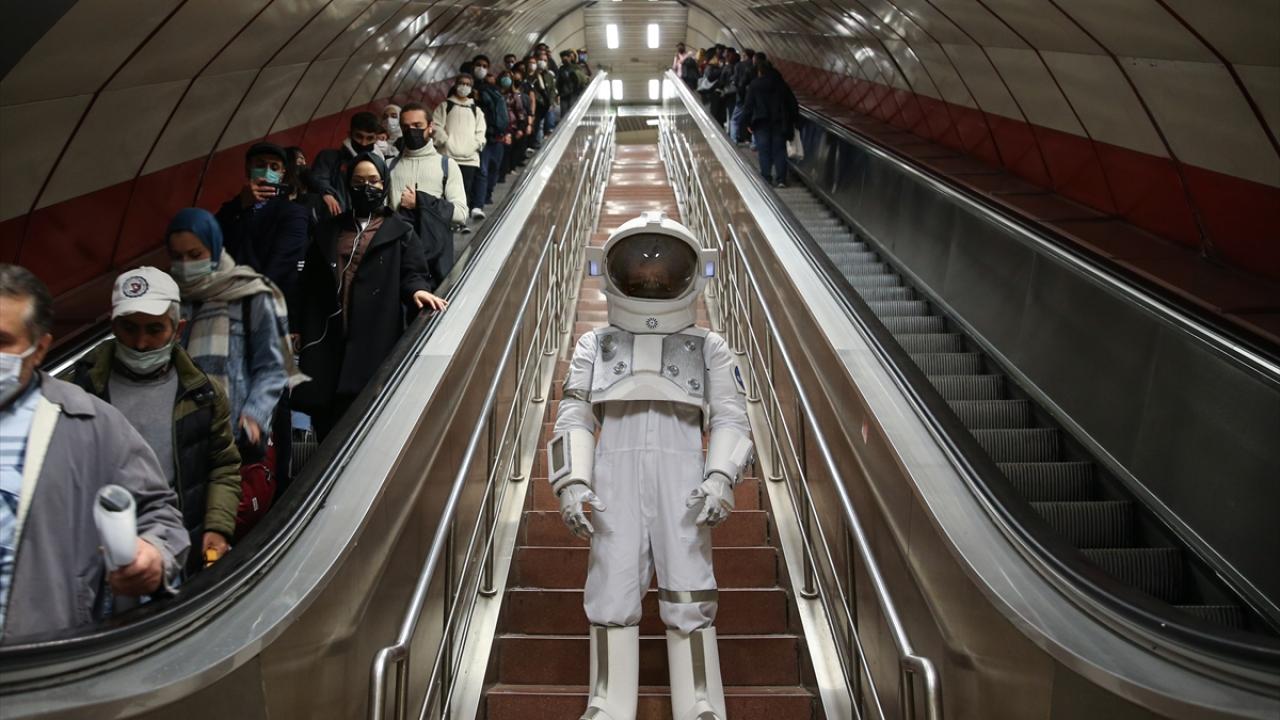 Açılış öncesi serginin tanıtımı için astronot kıyafeti giyen bir kişi M2 Yenikapı-Hacıosman metro hattında seyahat ederek bazı duraklarda gezdi.