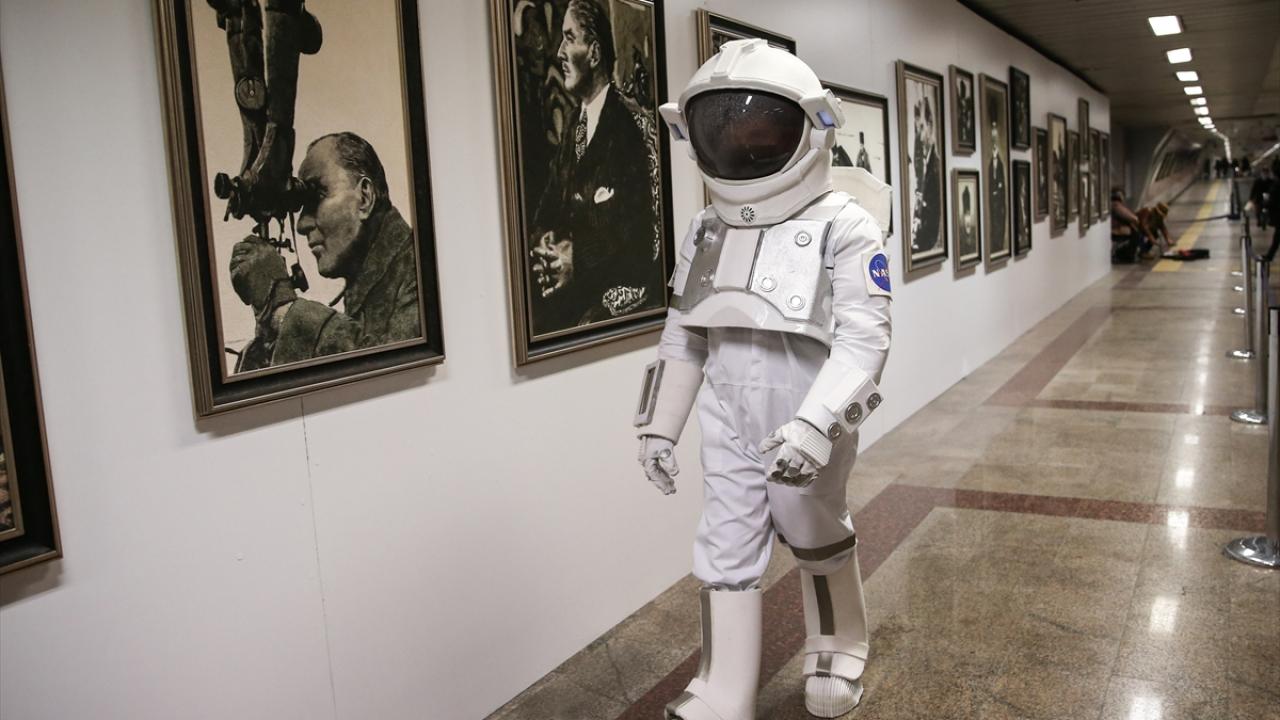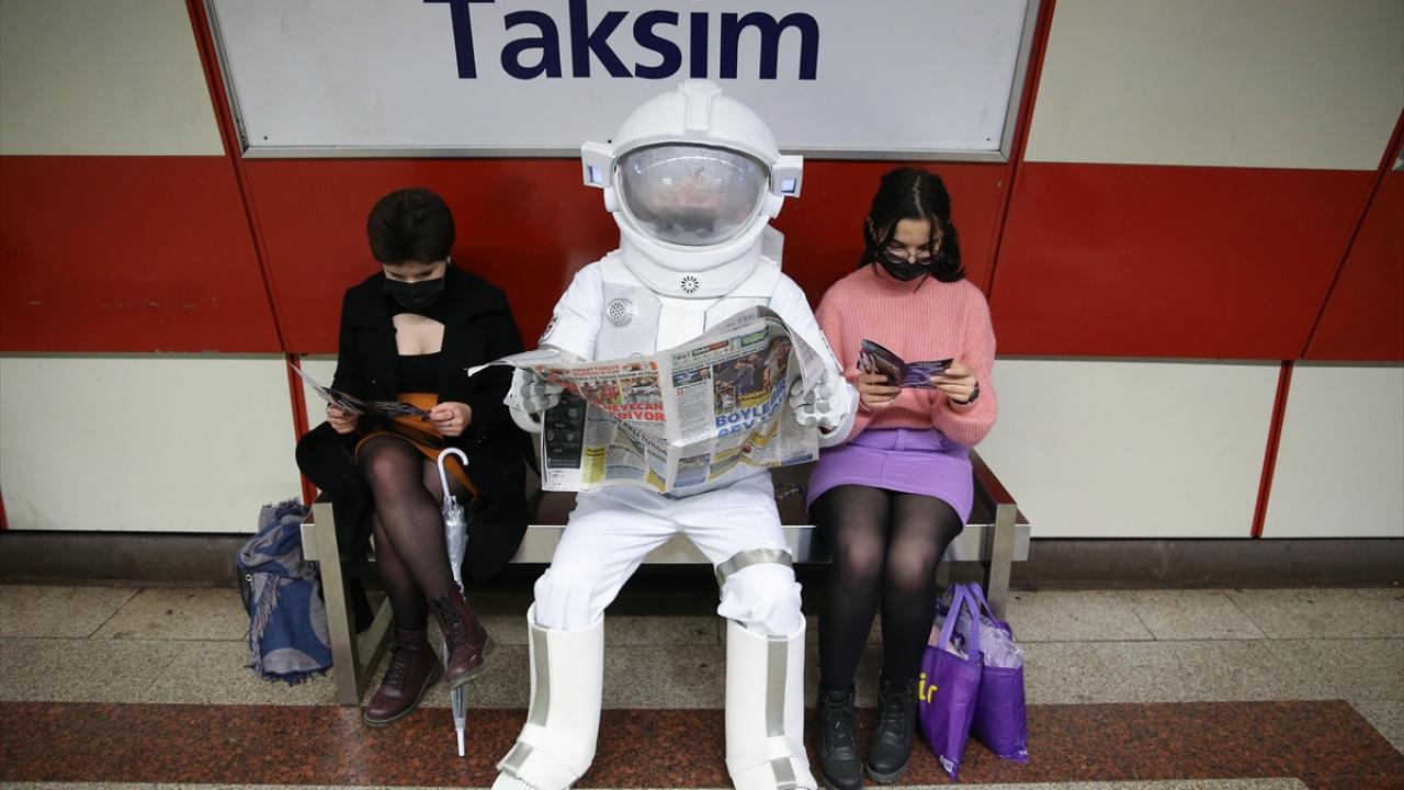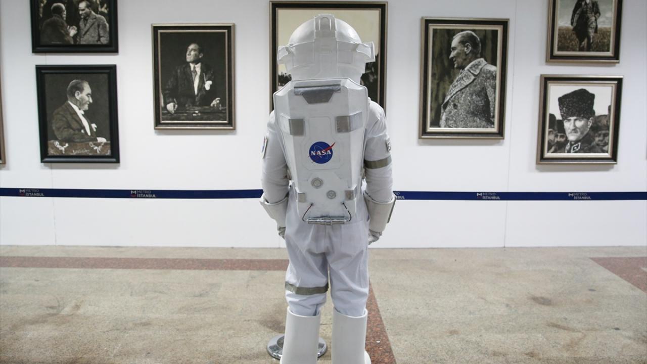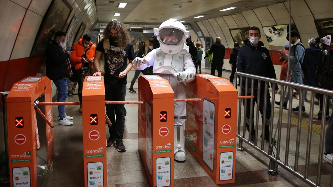 Açılış öncesi serginin tanıtımı için astronot kıyafeti giyen bir kişi M2 Yenikapı-Hacıosman metro hattında seyahat ederek bazı duraklarda gezdi.