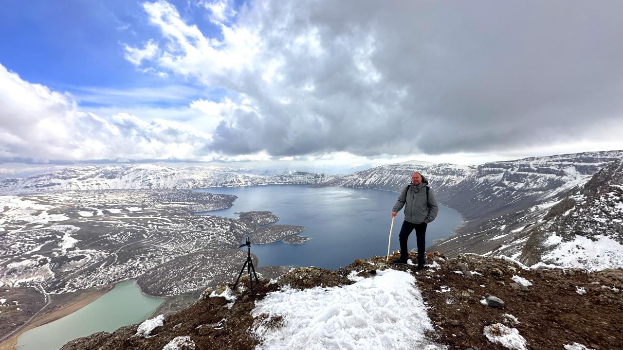 Dünyanın ikinci, Türkiye'nin en büyük krater gölü olan, Bitlis'teki Nemrut Dağı ve krater göllerinin zirveden karlı manzarası görenleri hayran bırakıyor.