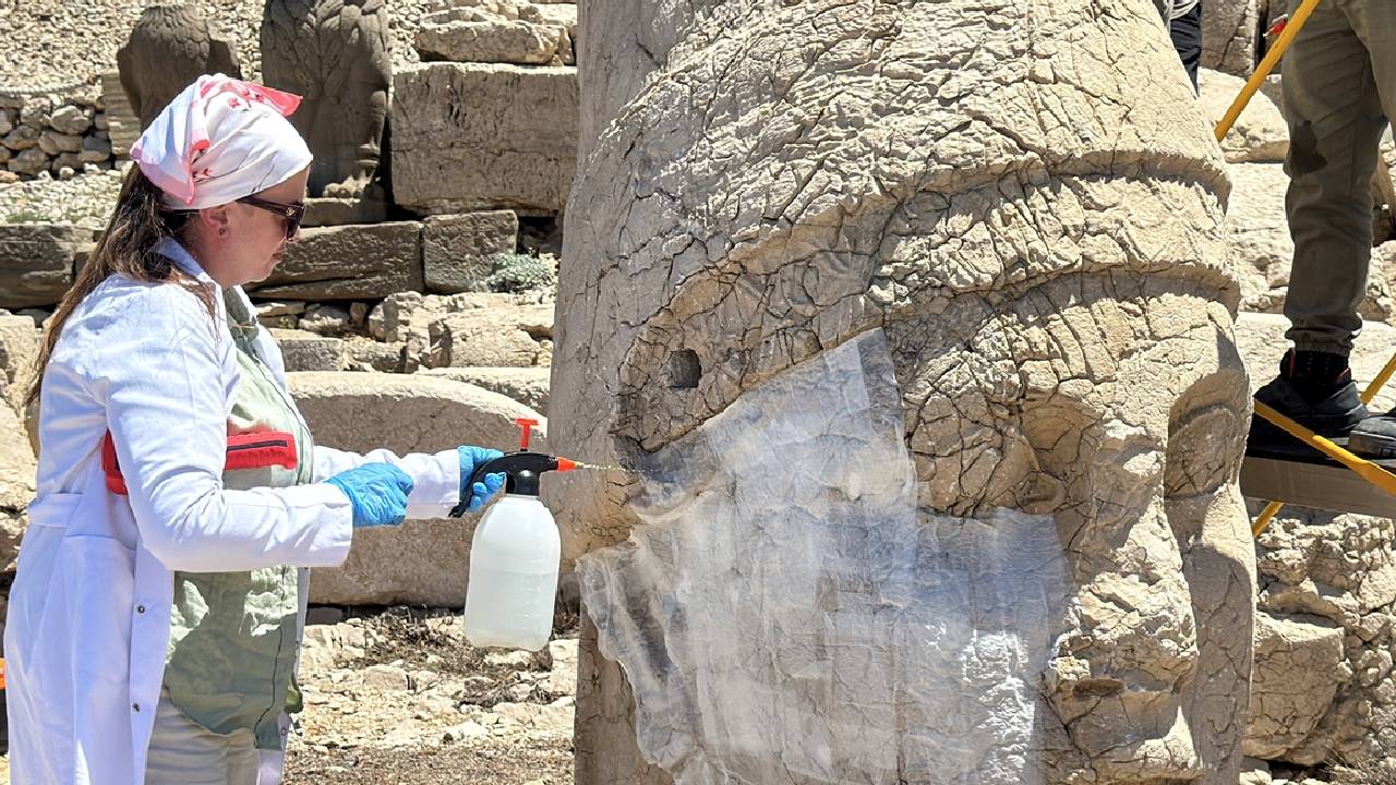 Kentte 2 bin 206 metre rakımlı Nemrut Dağı`ndaki dev heykellerin yüzey ve iç yapılarında oluşan kılcal çatlakların onarılması için 2022`de başlatılan nano kireç uygulamasının olumlu sonuç vermesinin ardından çalışmalar genişletildi.