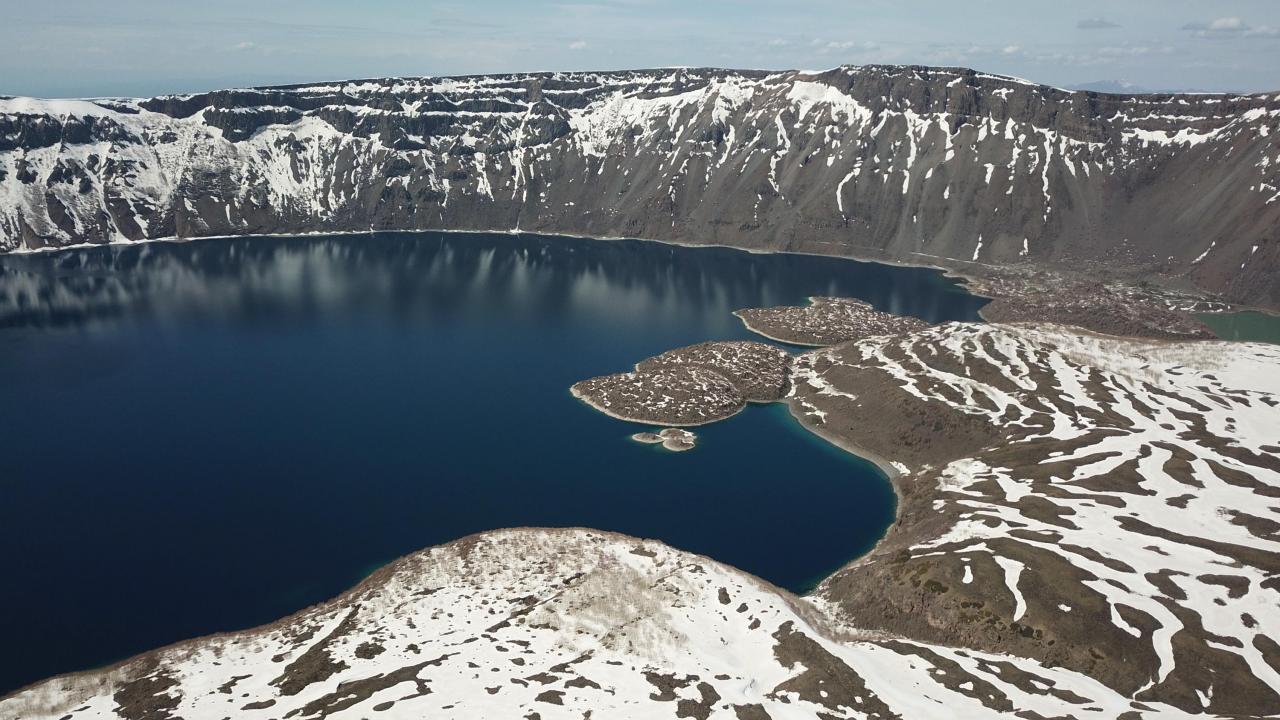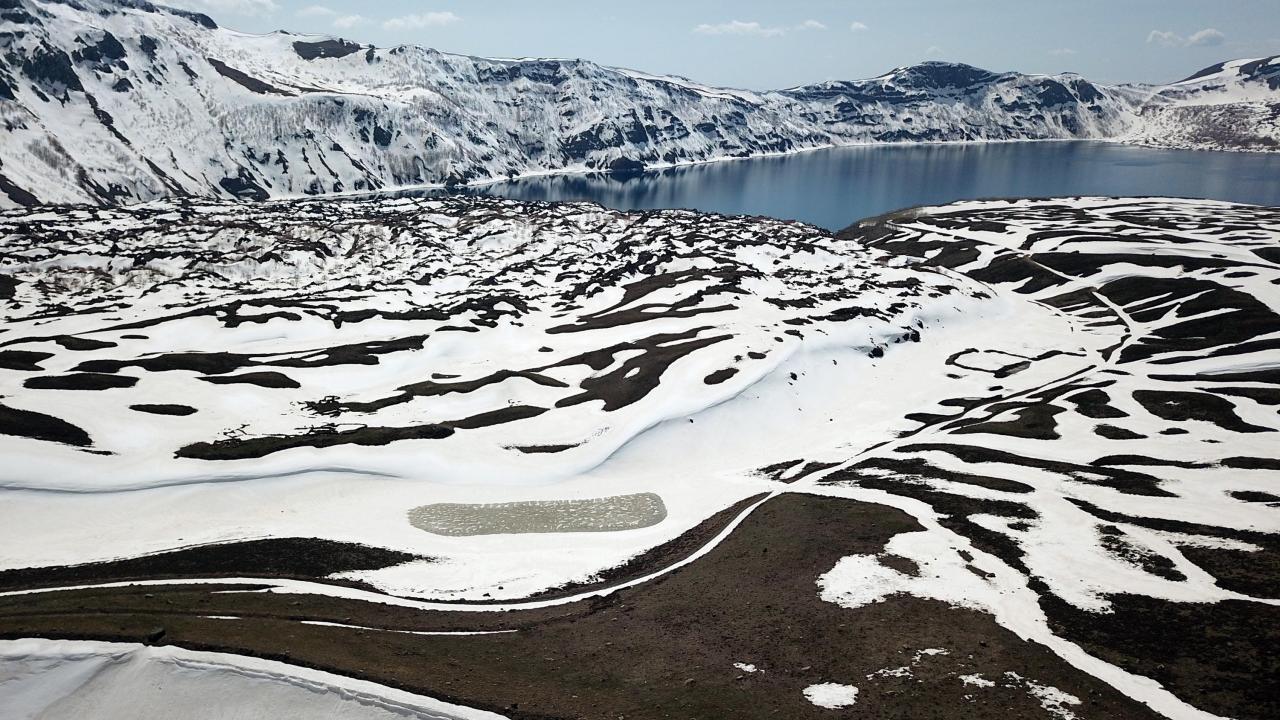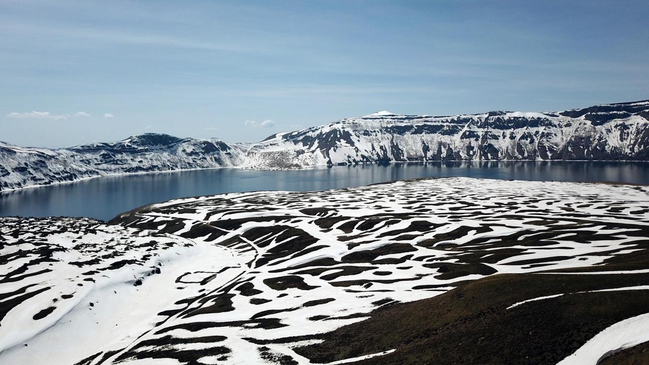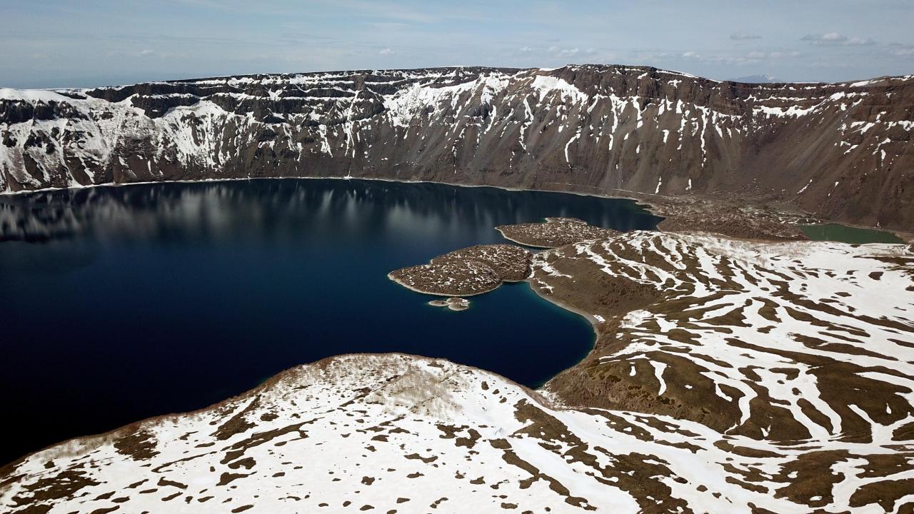 Karlı dağları, endemik bitkileri, sıcak ve soğuk gölleriyle birlikte baharı karşılayan Nemrut Krater Gölü`ndeki eşsiz güzellik dronla havadan görüntülendi.