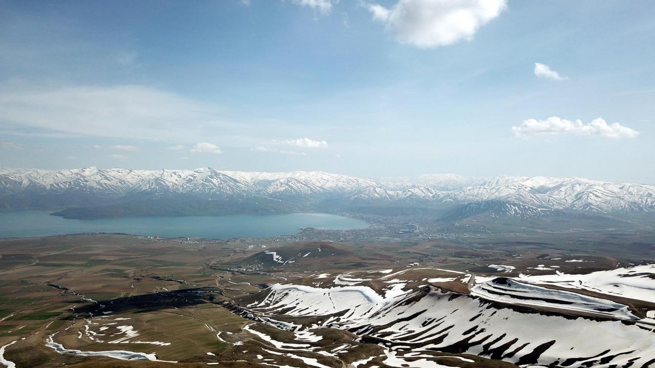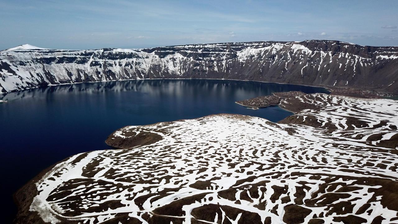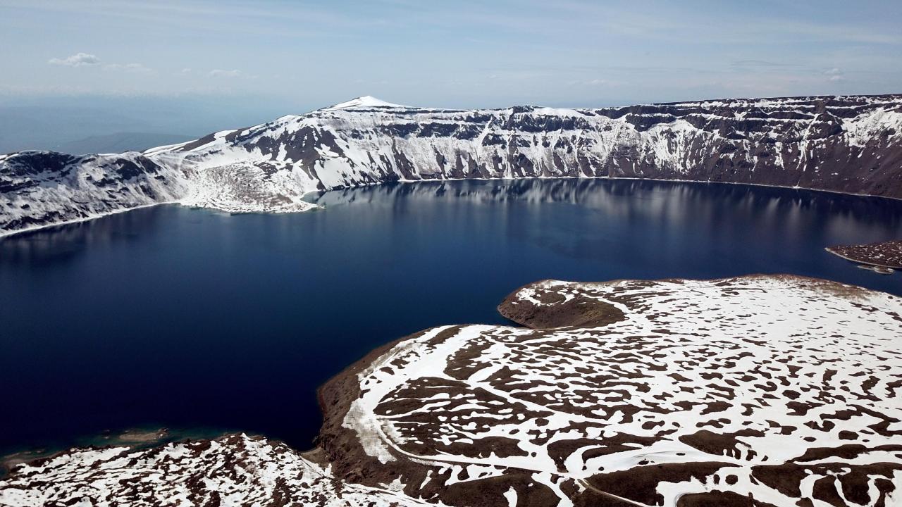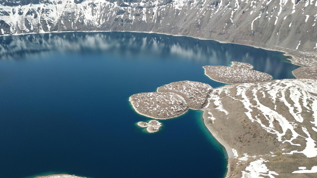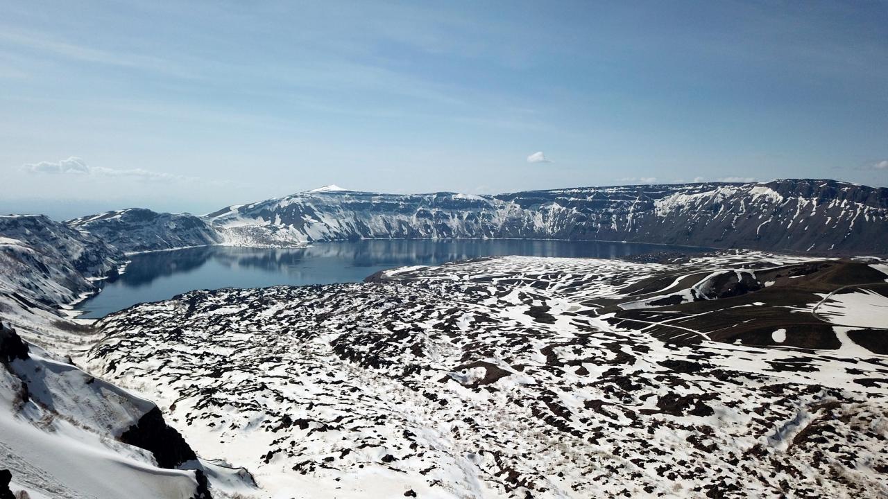 Karlı dağları, endemik bitkileri, sıcak ve soğuk gölleriyle birlikte baharı karşılayan Nemrut Krater Gölü`ndeki eşsiz güzellik dronla havadan görüntülendi.