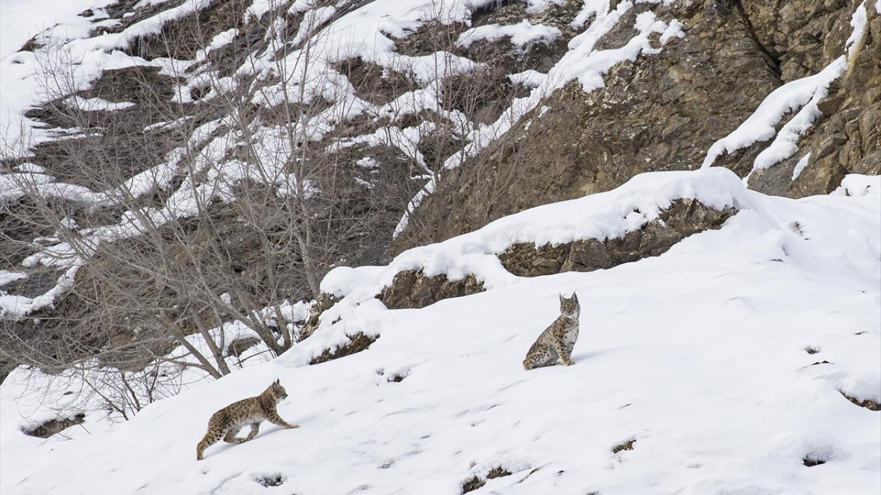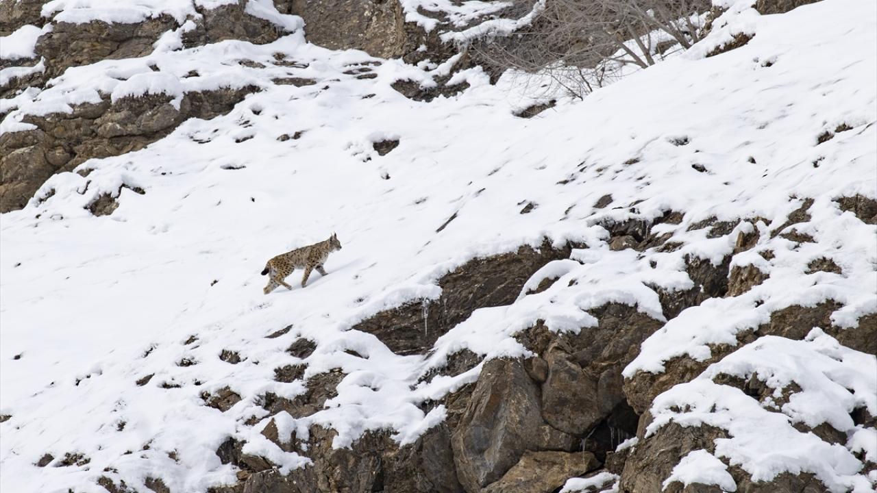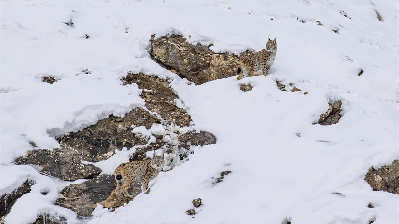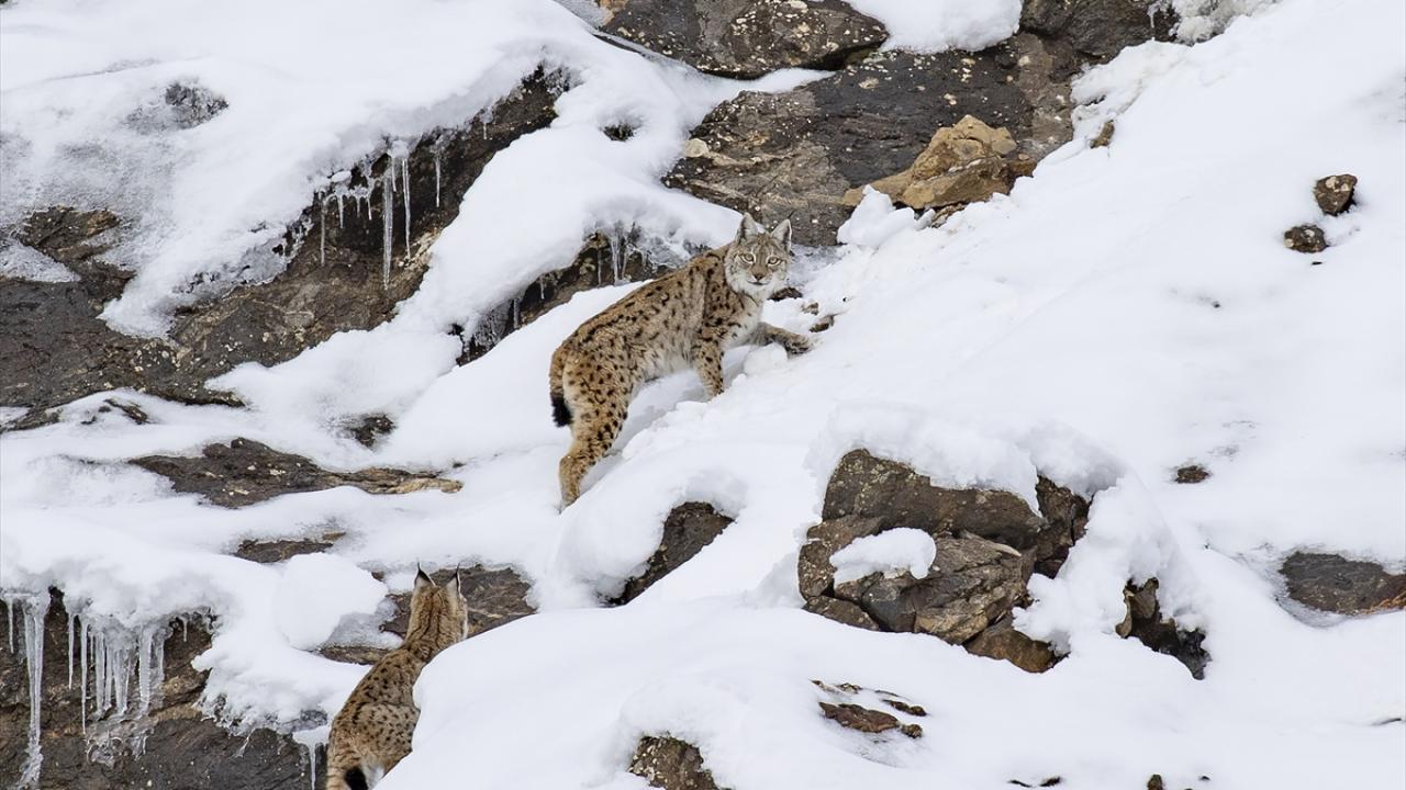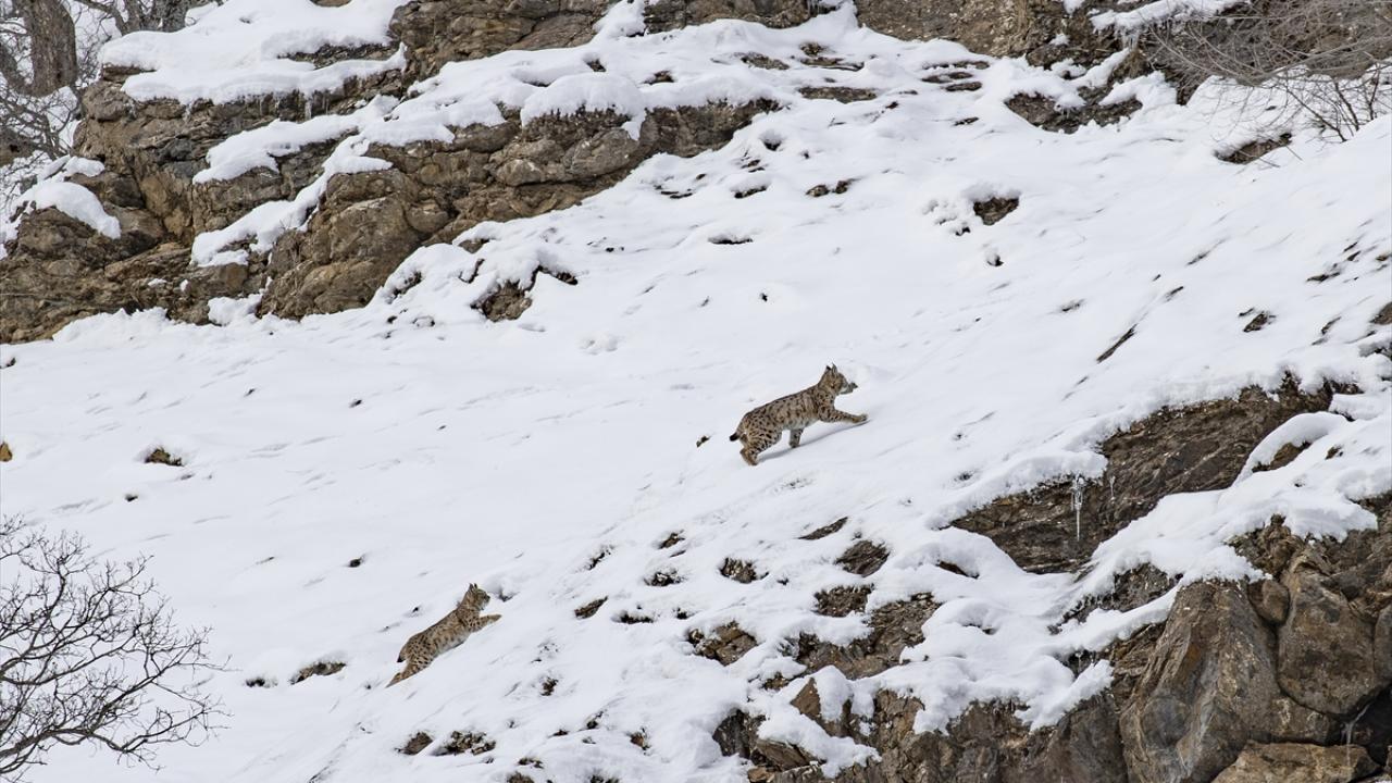 Bölgede nesli tehlike altındaki anne vaşak ile iki yavrusu da milli parkın karla kaplı dağlarında yiyecek ararken AA muhabiri tarafından görüntülendi.