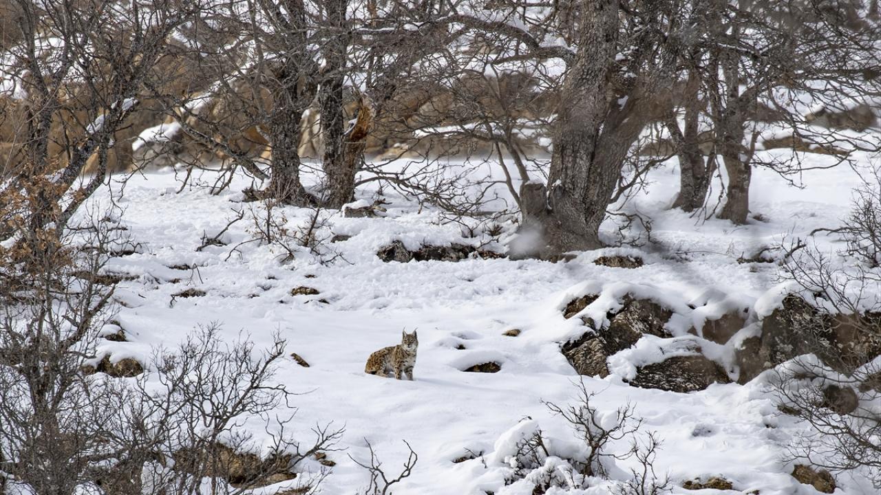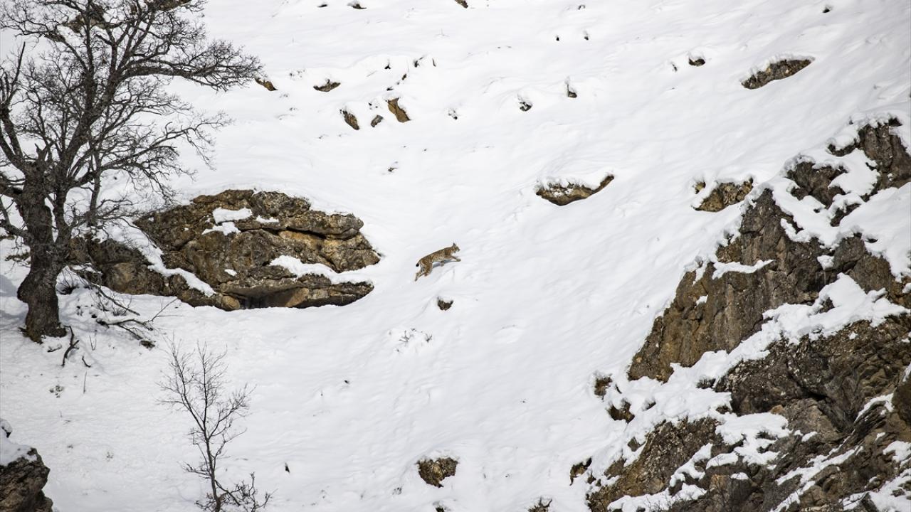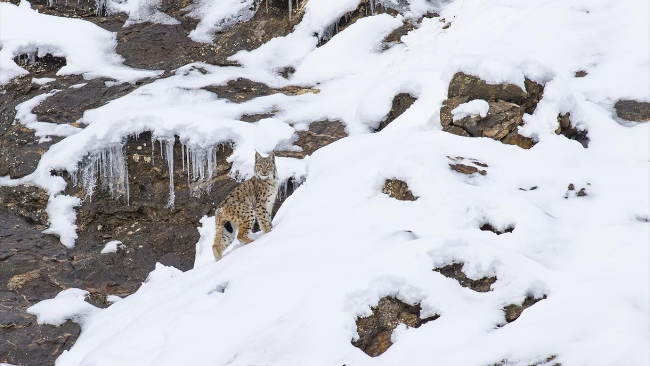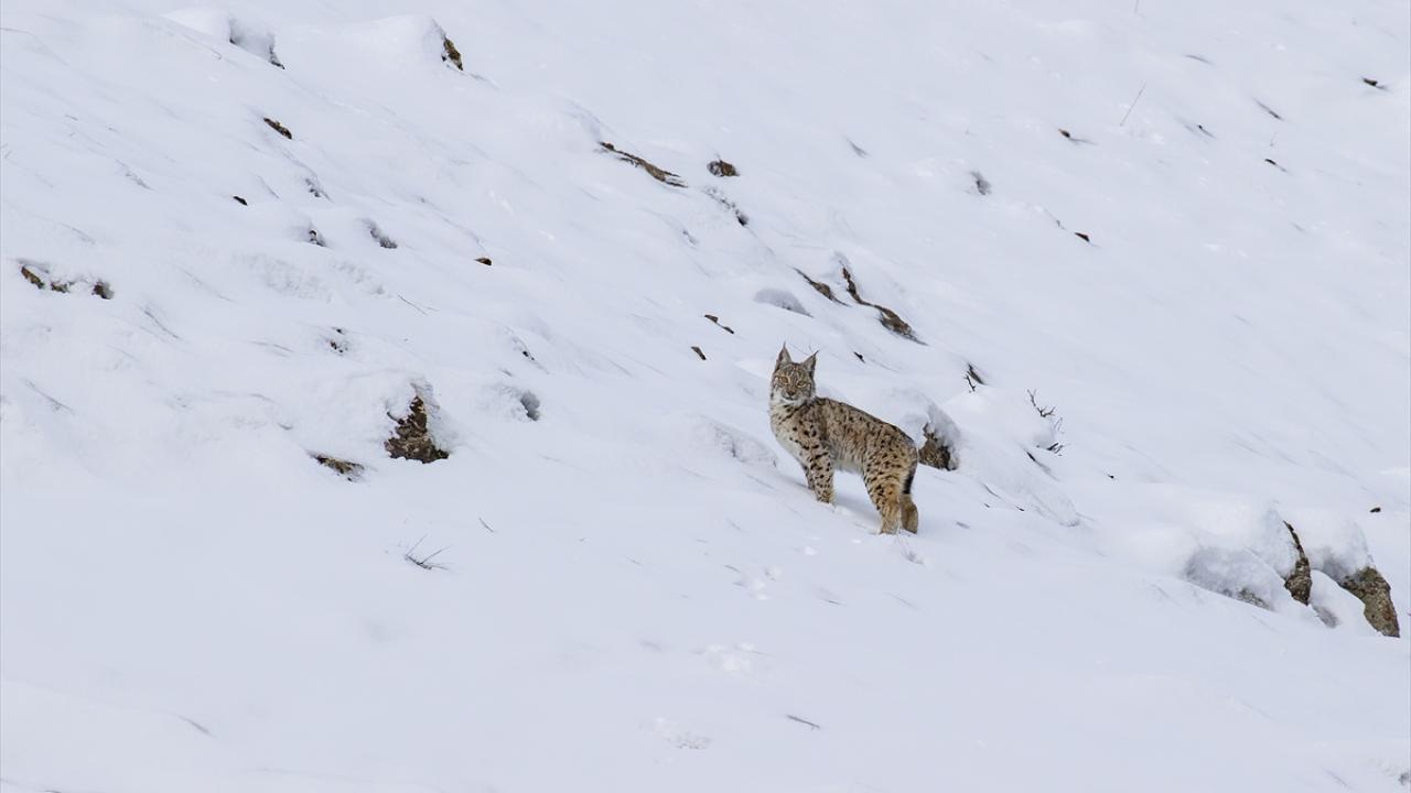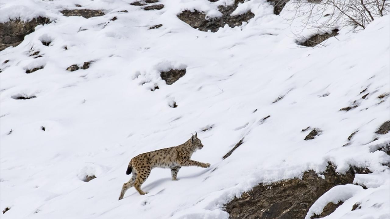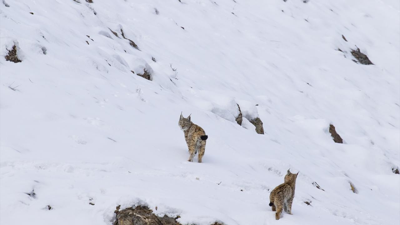 Bölgede nesli tehlike altındaki anne vaşak ile iki yavrusu da milli parkın karla kaplı dağlarında yiyecek ararken AA muhabiri tarafından görüntülendi.