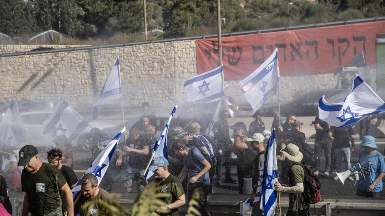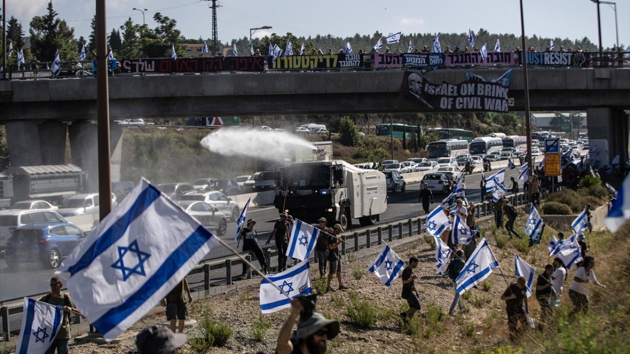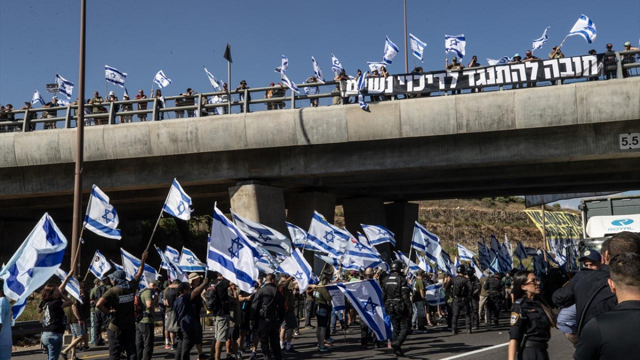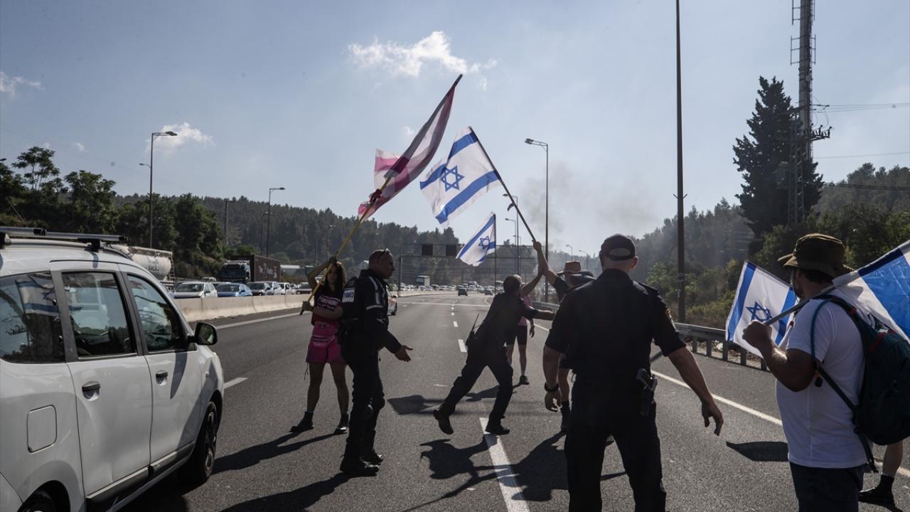 İsrail'in Tel Aviv kentinde toplanan bir grup Netanyahu hükümeti karşıtı gösterici, Tel Aviv-Kudüs otoyolunun Kudüs yönünü kapattı.