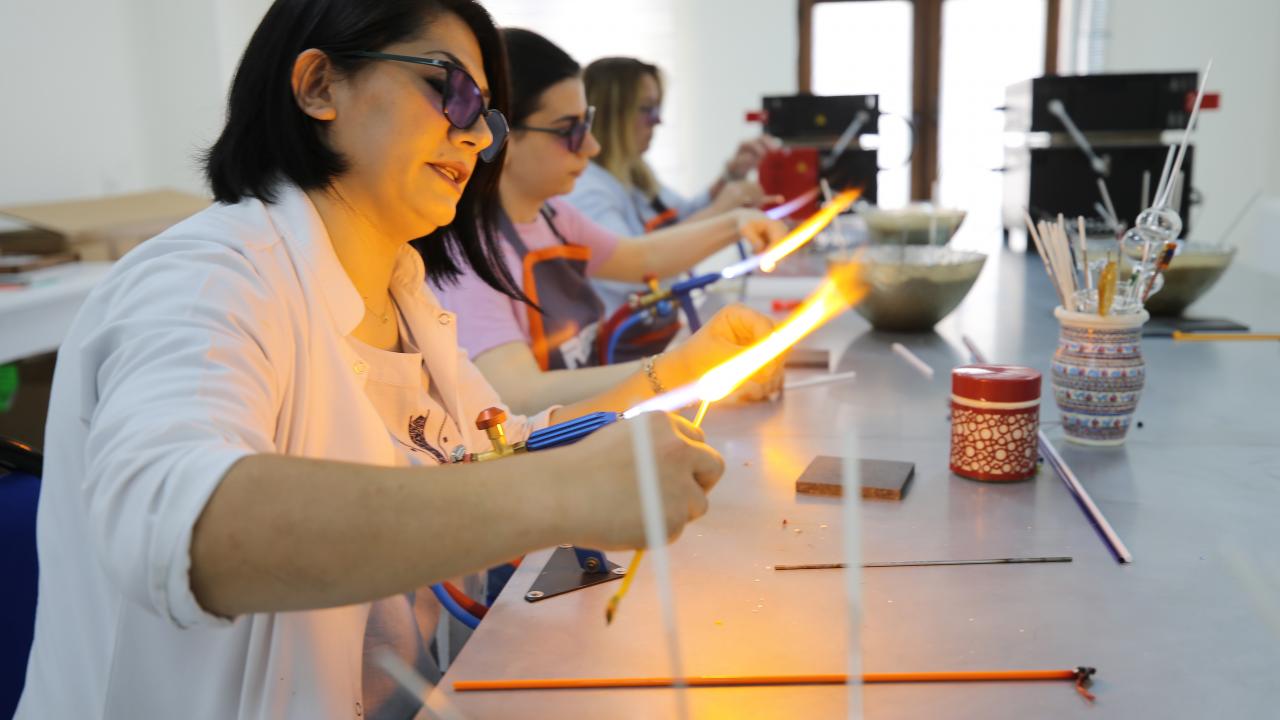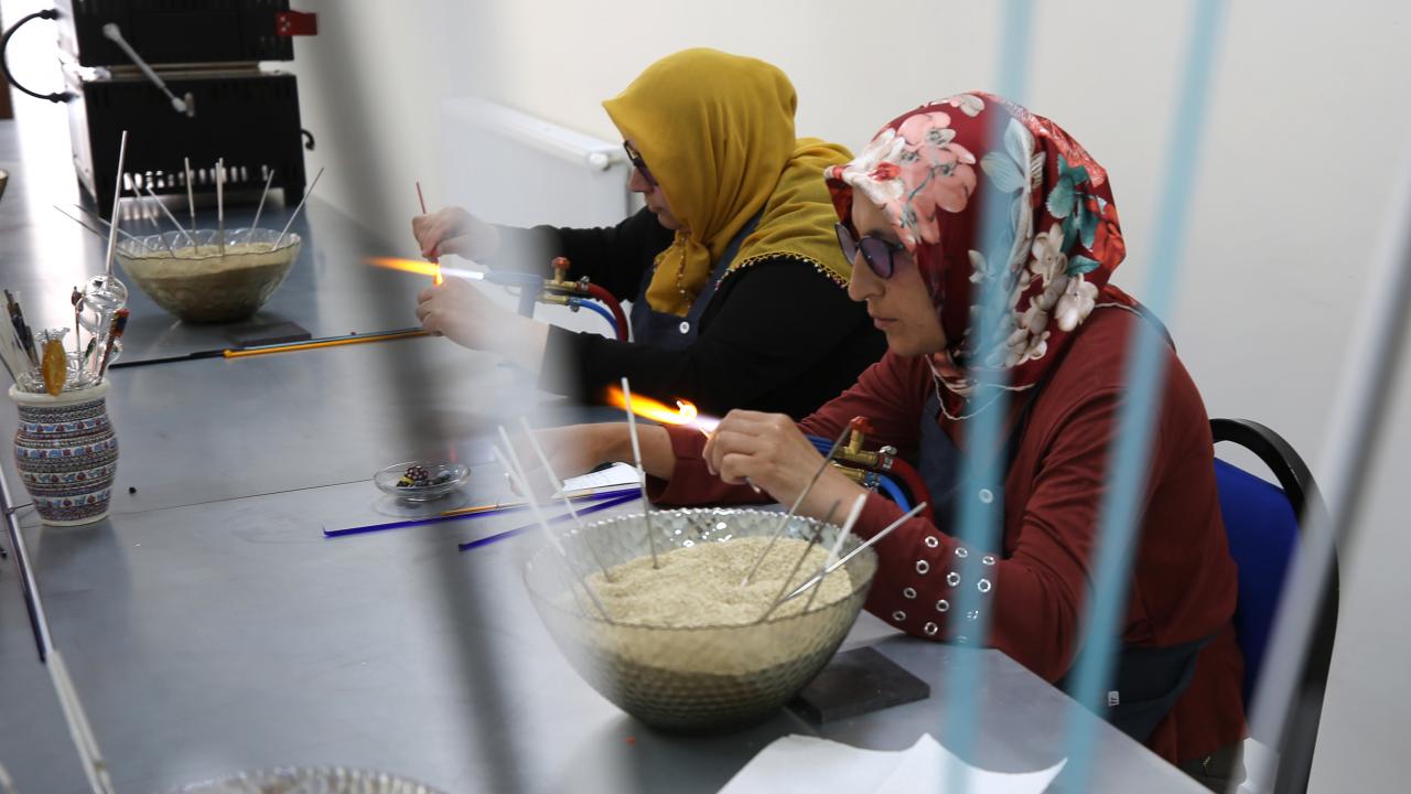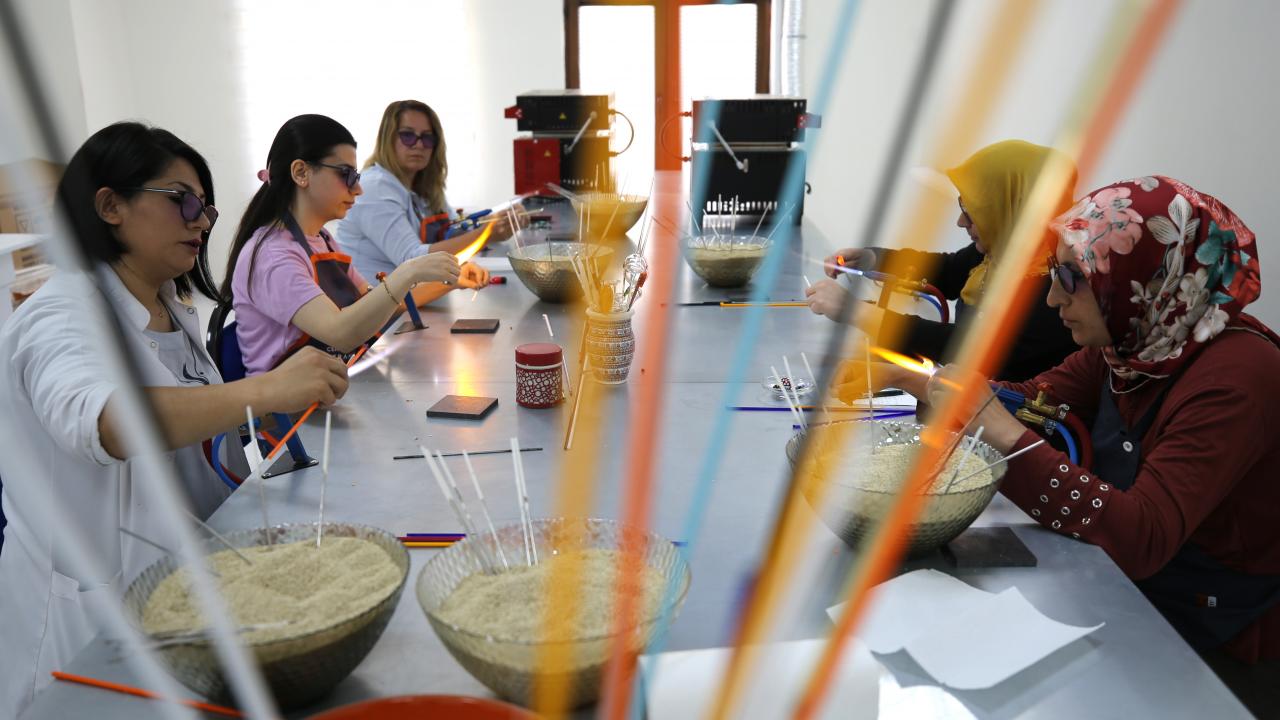 Usta öğretici Döne Aytekin`den cam işlemenin ayrıntılarını öğrenen kadınlar, 1200 derece ısıyla camdan takı, nazar boncuğu, balık, kuş figürleri gibi çeşitli objeler üretiyor.