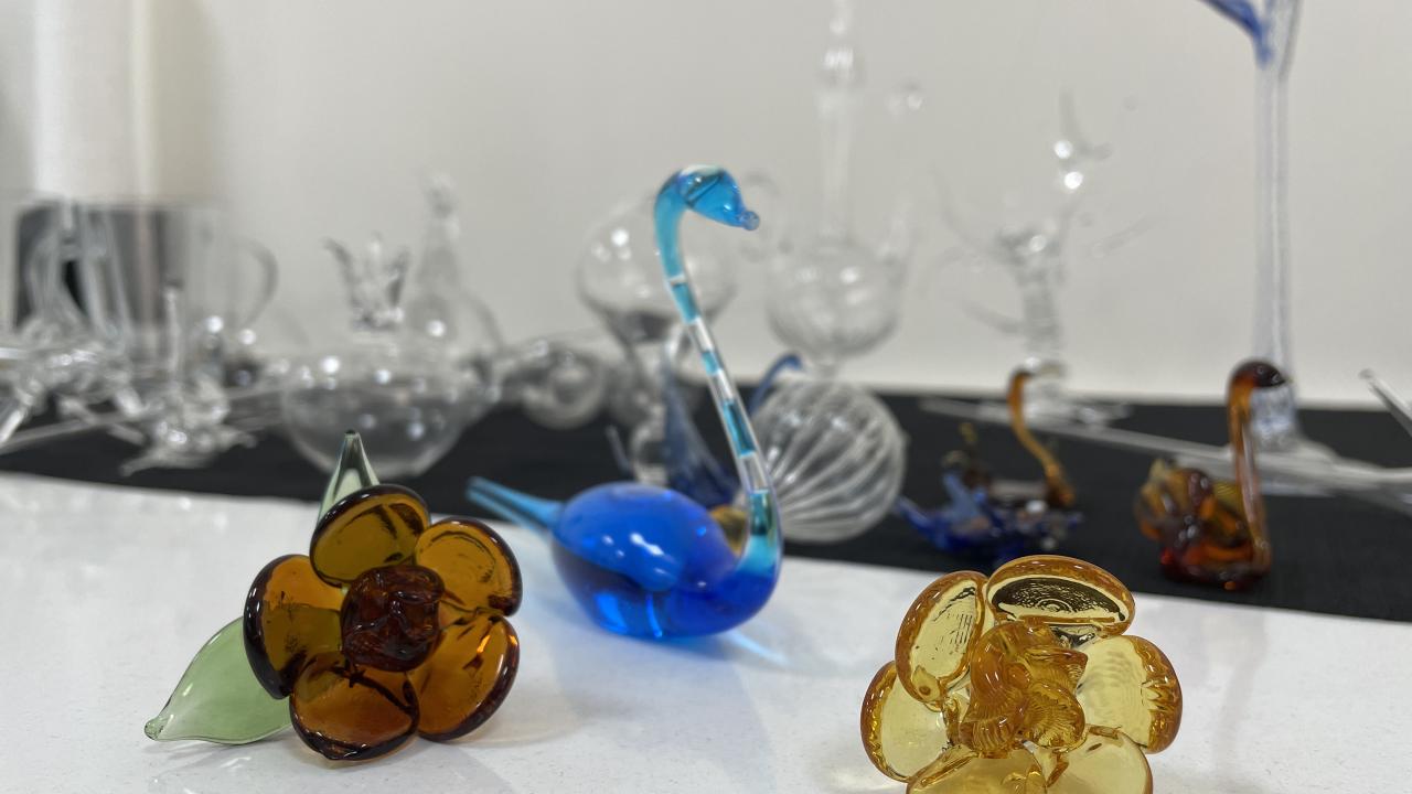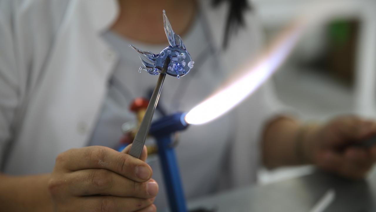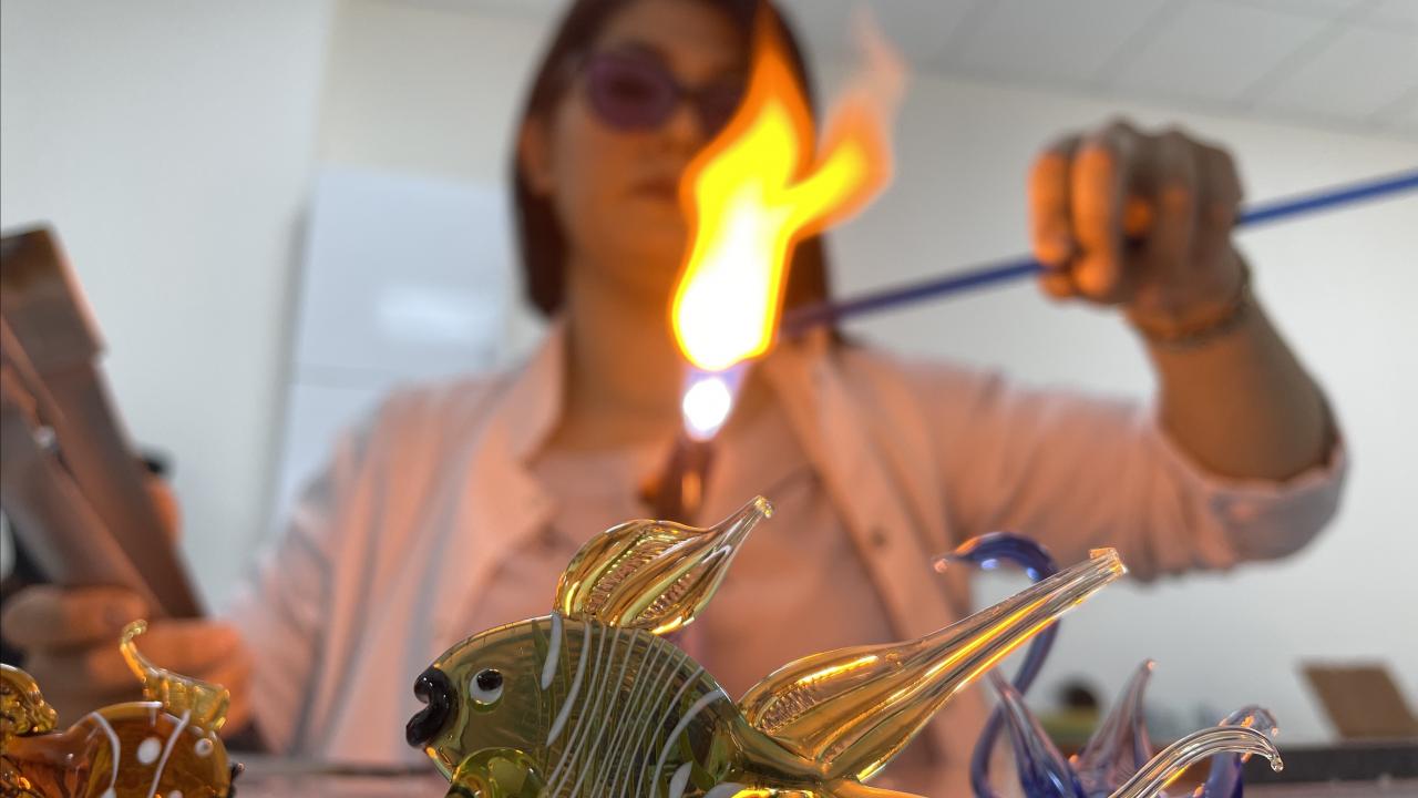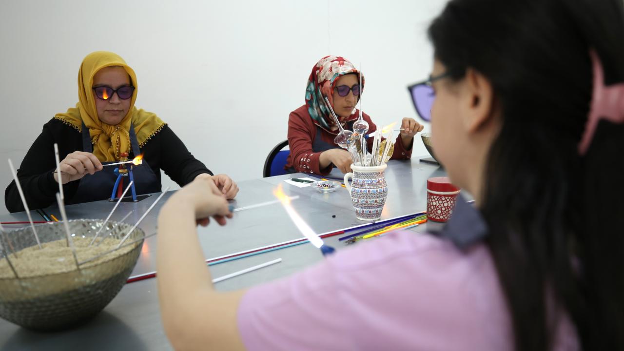 Usta öğretici Döne Aytekin`den cam işlemenin ayrıntılarını öğrenen kadınlar, 1200 derece ısıyla camdan takı, nazar boncuğu, balık, kuş figürleri gibi çeşitli objeler üretiyor.