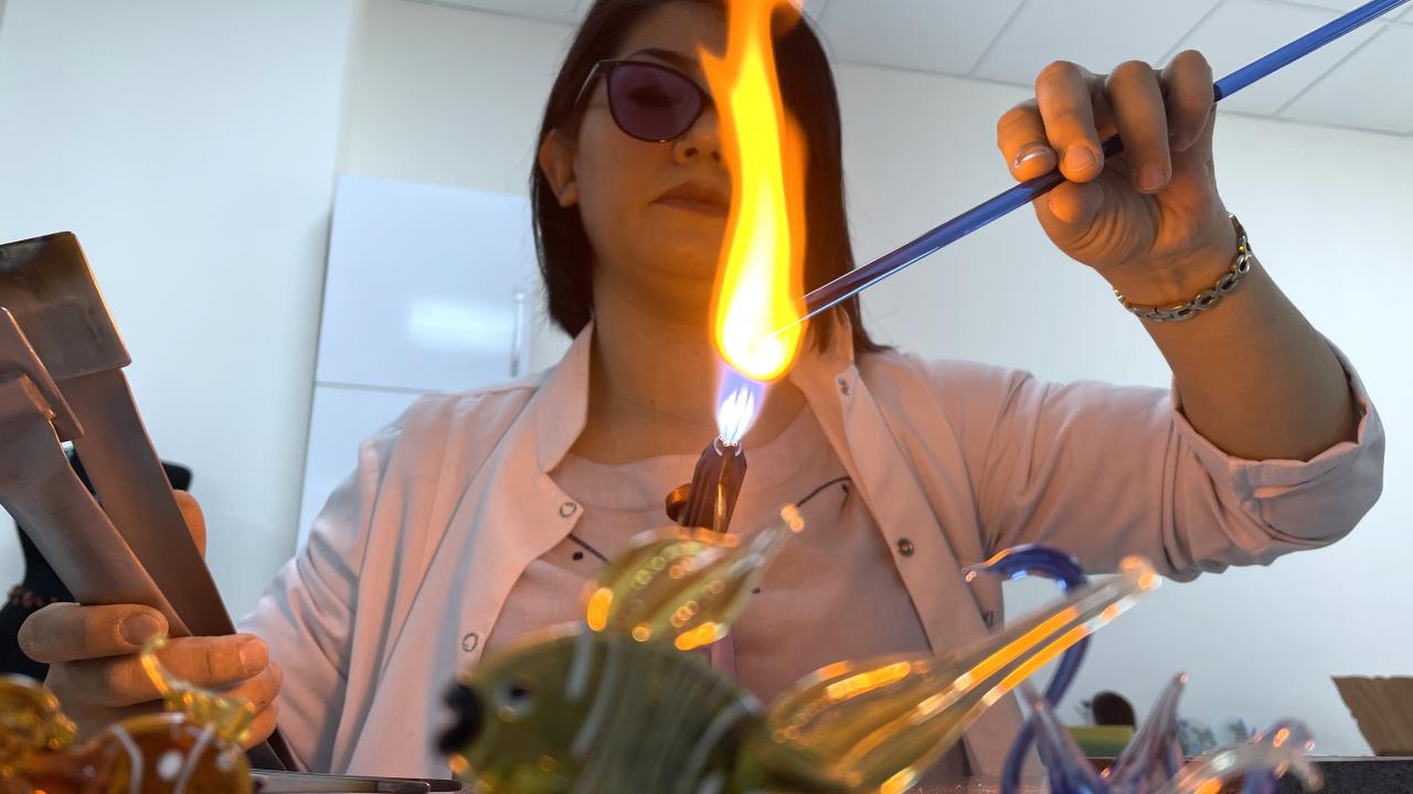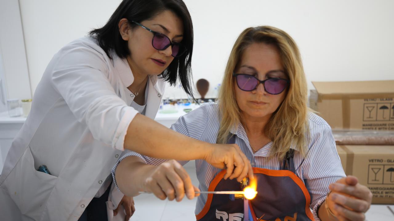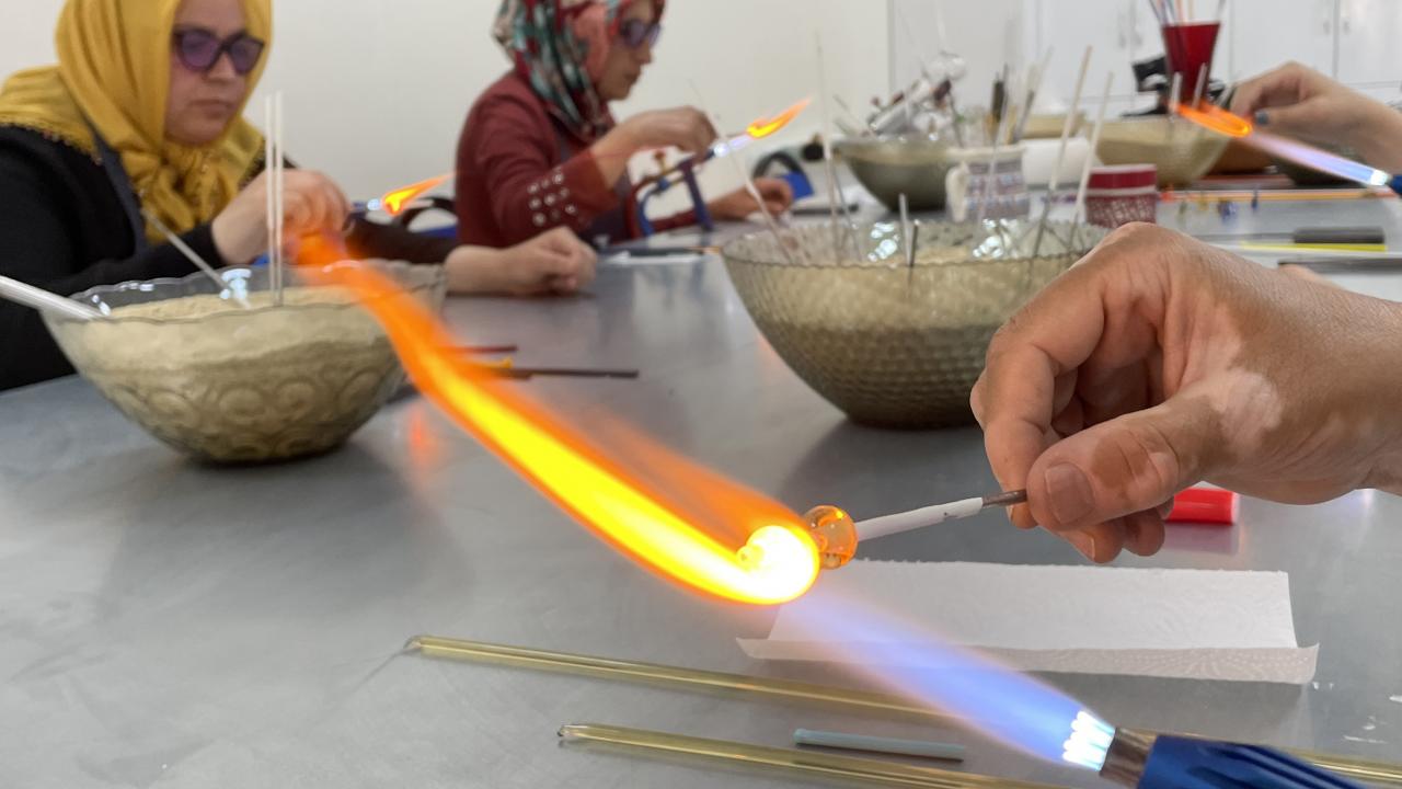 Öğrenim aşamasında kolay işlenebilir cam çubukların kullanıldığını, sonraki aşamada ise atık cam şişeleri özel fırında eriterek farklı aksesuarlara dönüştürdüklerini anlatan Aytekin, eğitimin ardından da dileyen kursiyerlerin aynı atölyede üretim yapma imkanına sahip olduklarını söyledi.