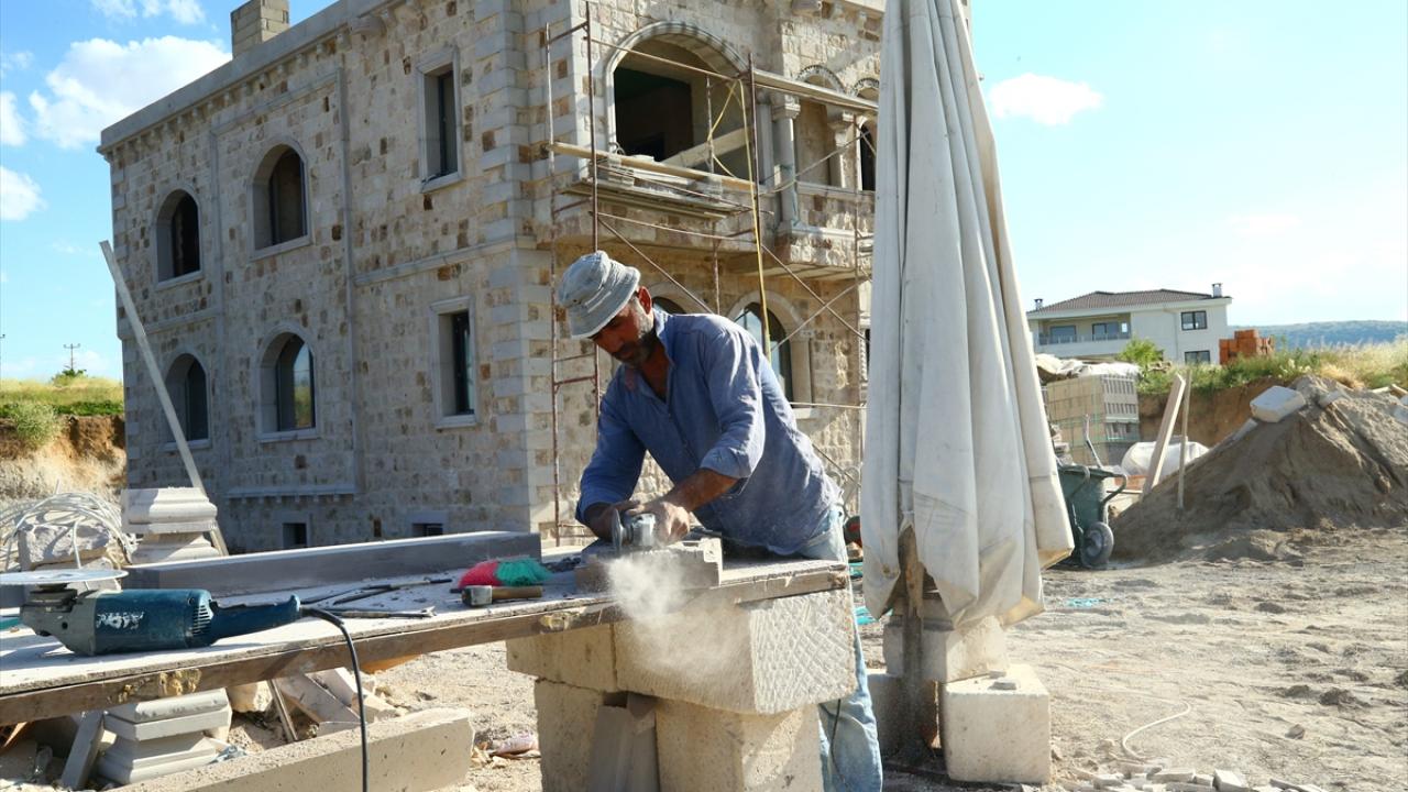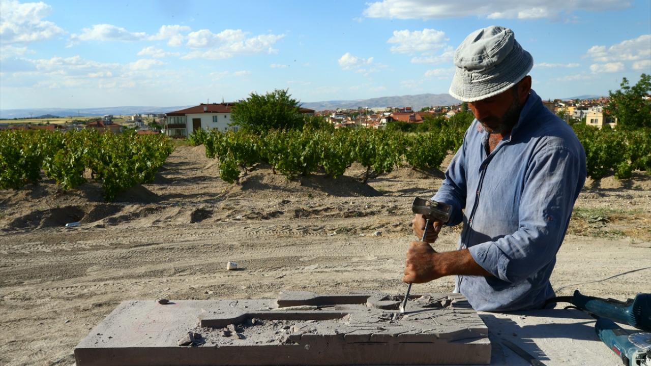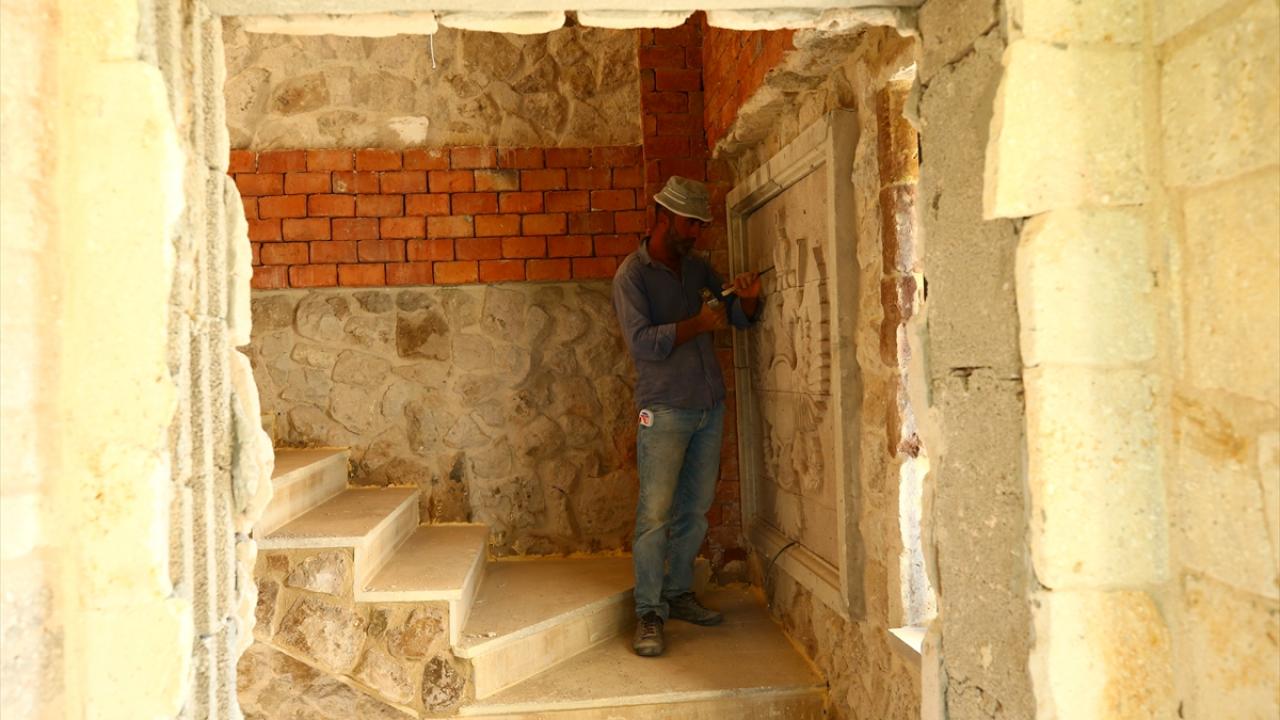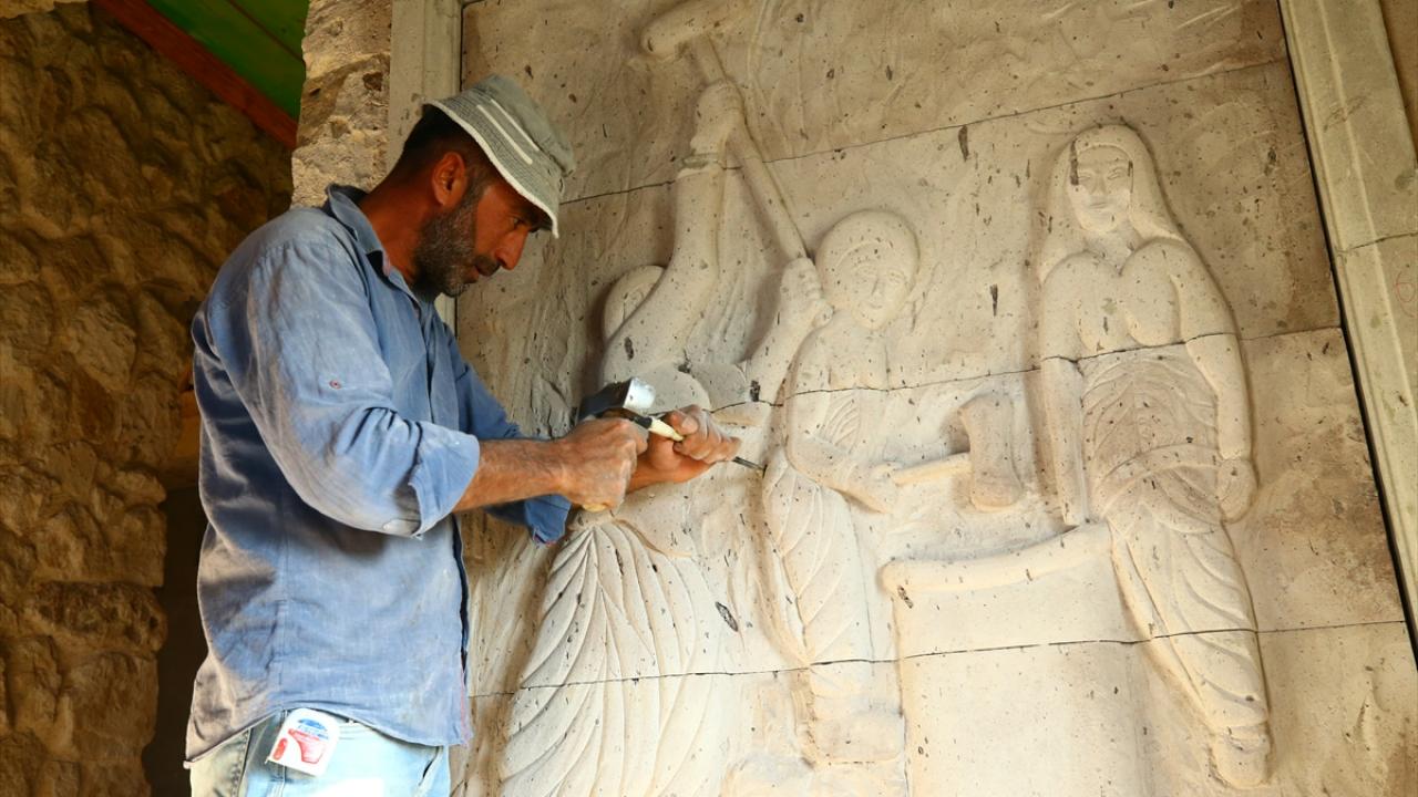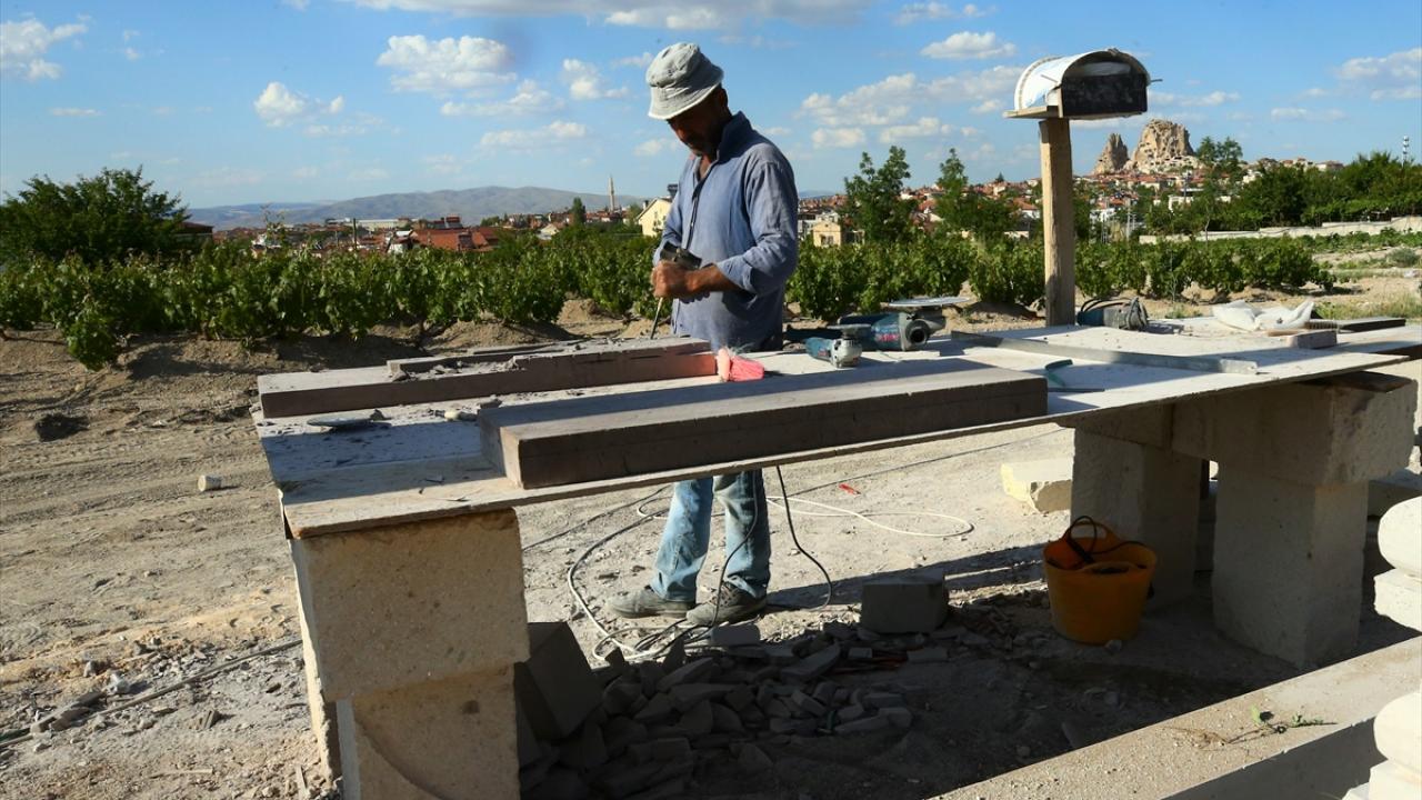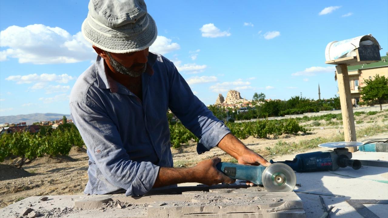 Nevşehir'de taş ustası Erkan Gür, Kapadokya bölgesine özgü tüf kayaların üzerine işlediği çeşitli resim ve figürlerle turistik tesislerin duvarlarını süslüyor.