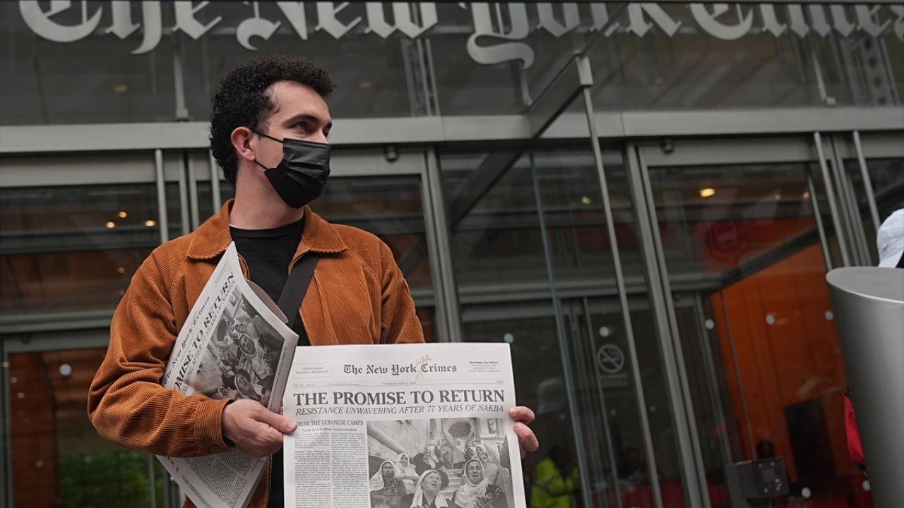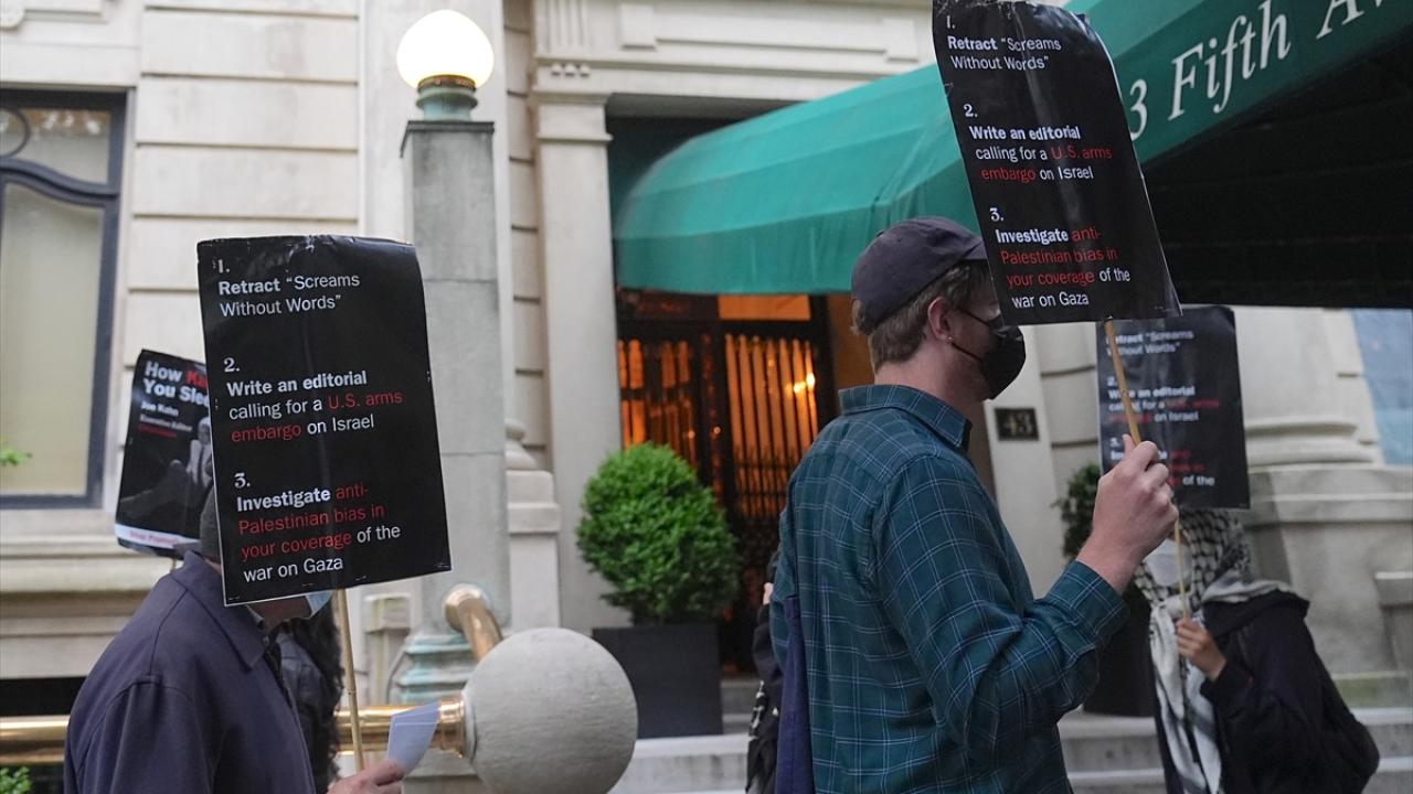 ABD'nin New York kentinde, Filistin yanlısı protestocular, The New York Times binası ile gazetenin genel yayın yönetmeni Joseph Kahn’ın evi önünde eylem düzenledi. Göstericiler, gazetenin Gazze’deki gelişmelere ilişkin haberlerinin taraflı olduğunu savunarak, medya kuruluşunun hesap vermesi gerektiğini dile getirdi. Protesto sırasında çeşitli pankartlar taşıyan göstericiler, bağımsız ve adil habercilik çağrısında bulundu.