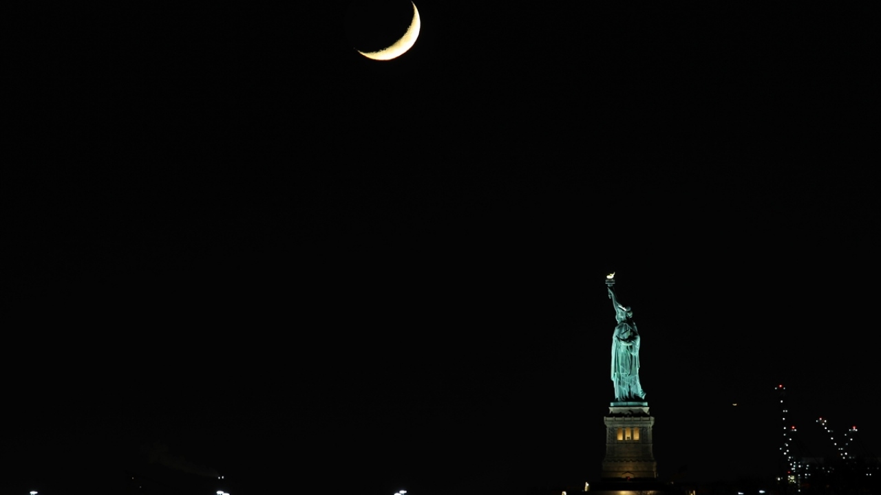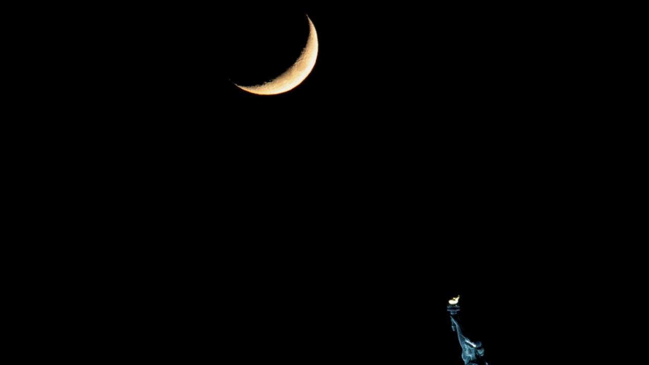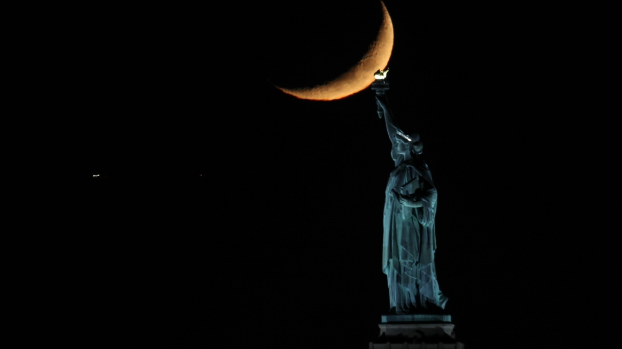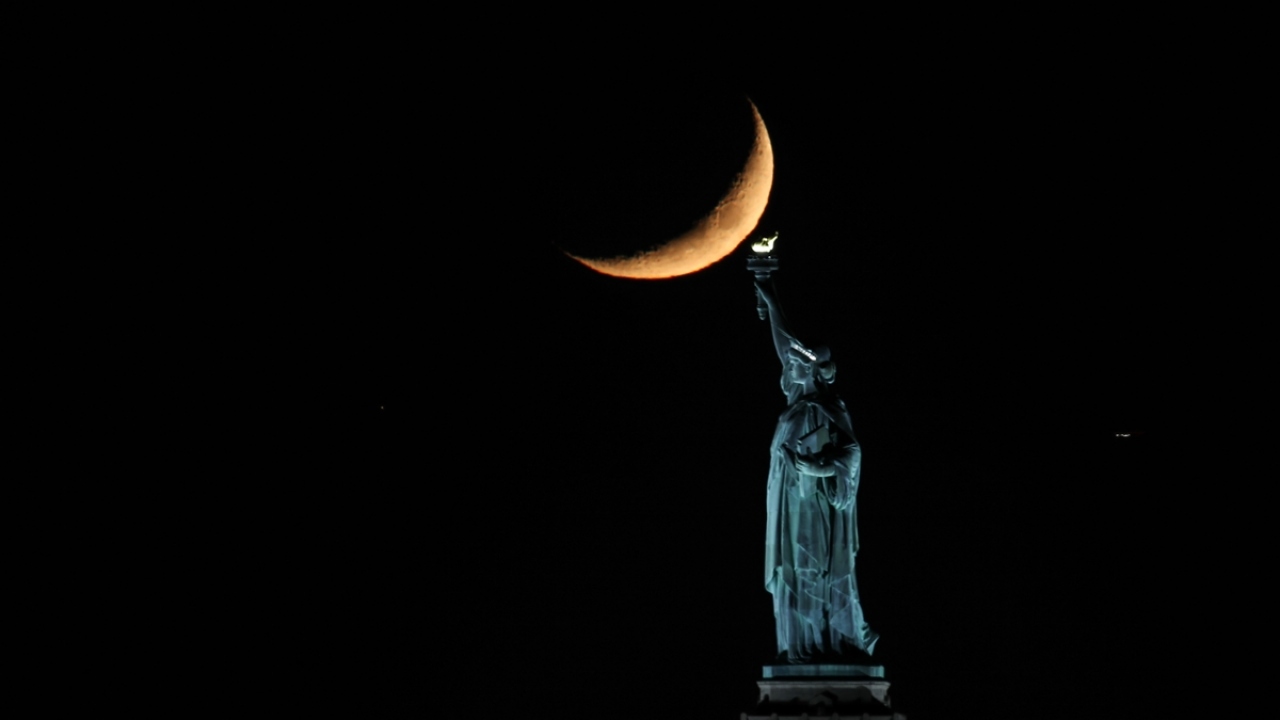 ABD'nin New York kentinde akşam saatlerinde beliren hilal, Özgürlük Heykeli ile güzel görüntü oluşturdu.