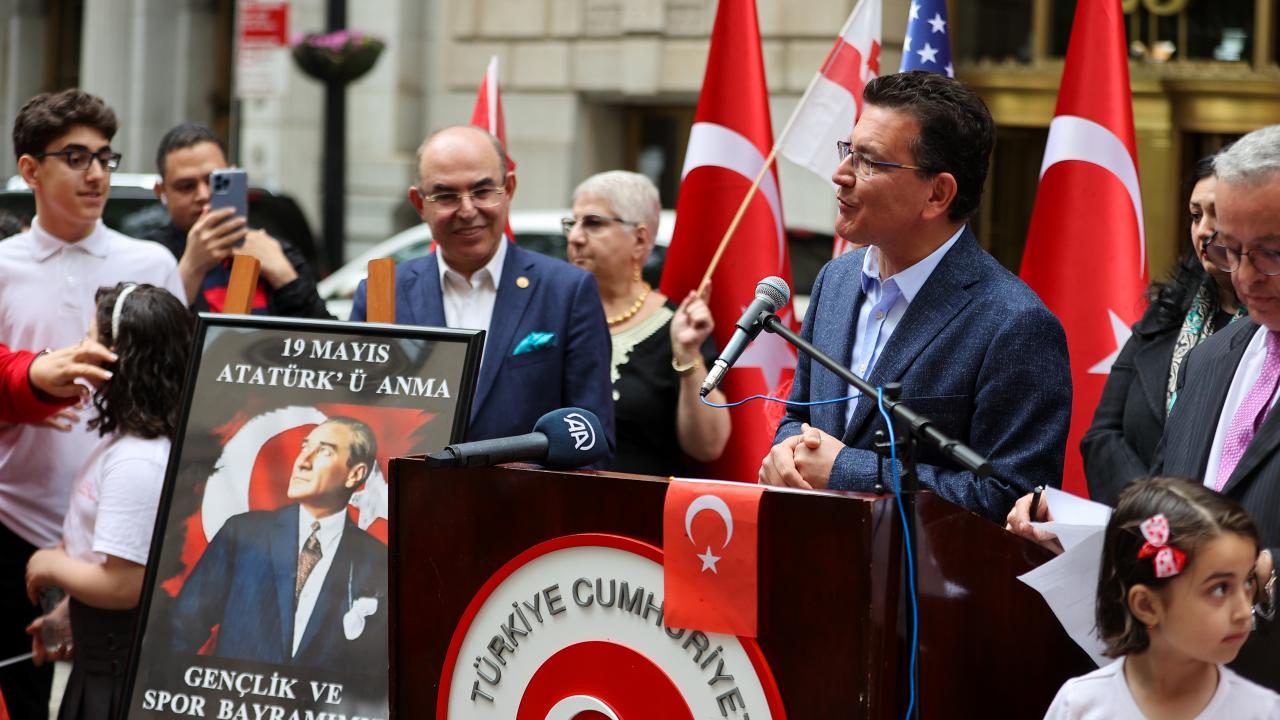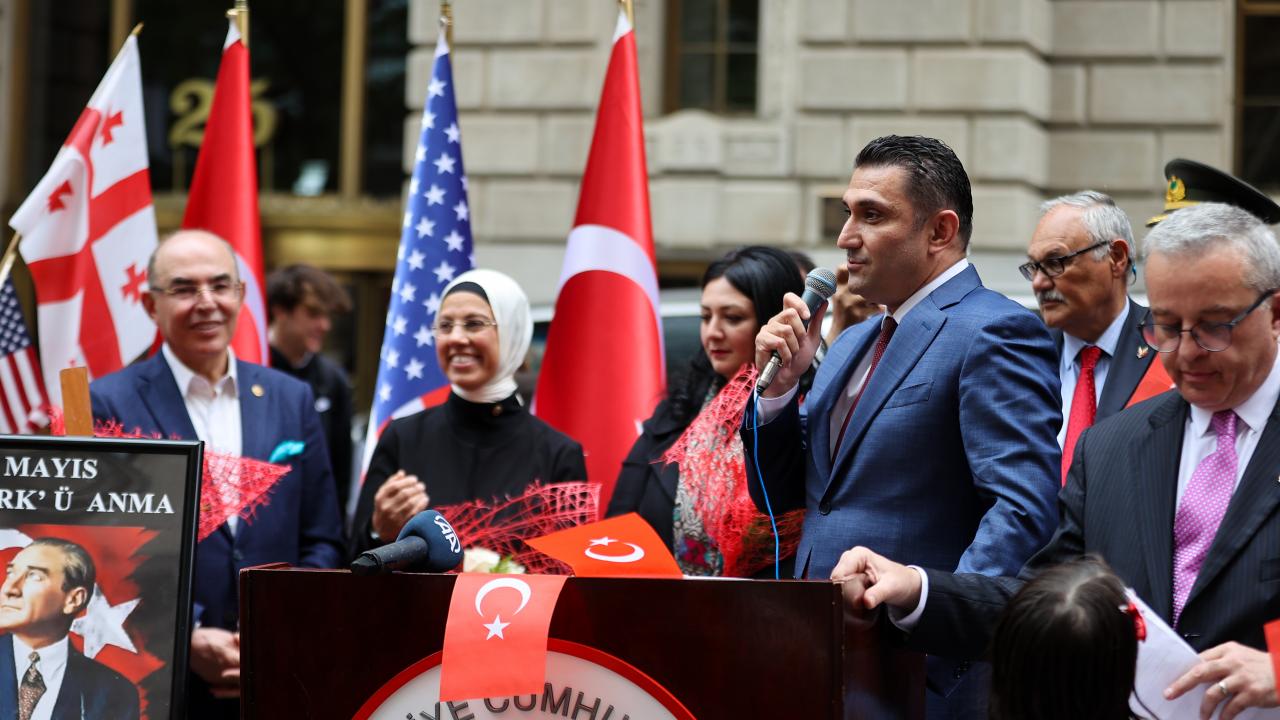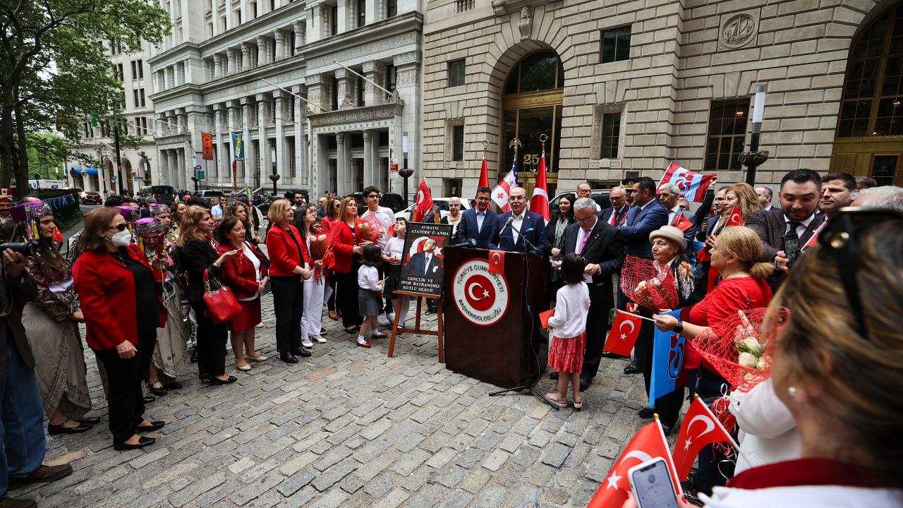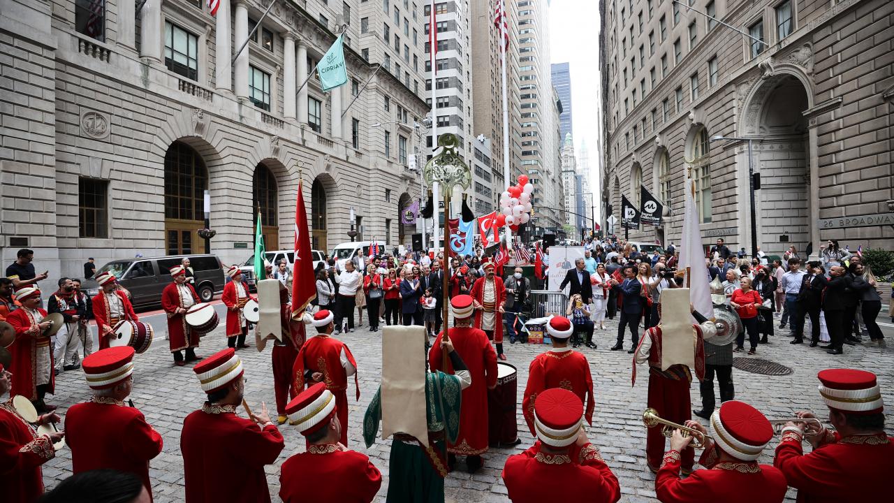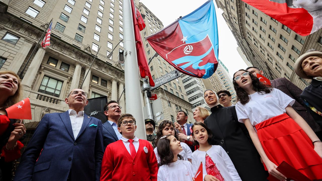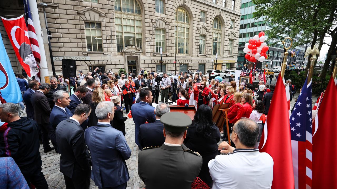 New York`un finans merkezi olarak bilinen Wall Street bölgesinde düzenlenen törende, saygı duruşu ve ardından okunan ABD ve Türkiye`nin milli marşları eşliğinde, Türk ve Amerikan bayrakları göndere çekildi.