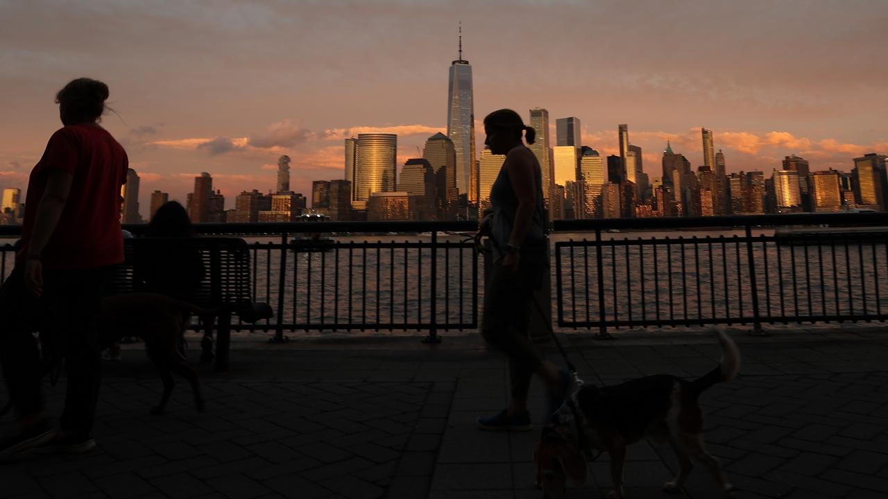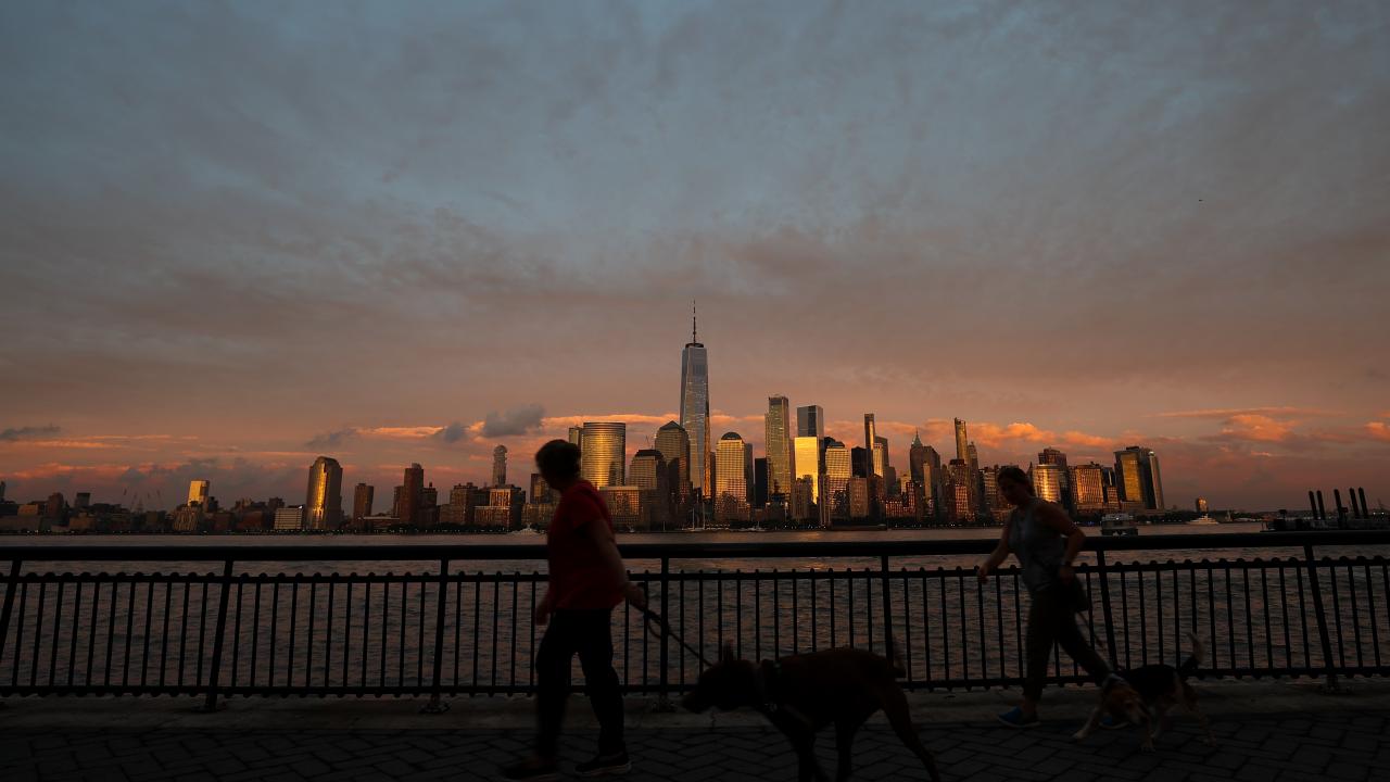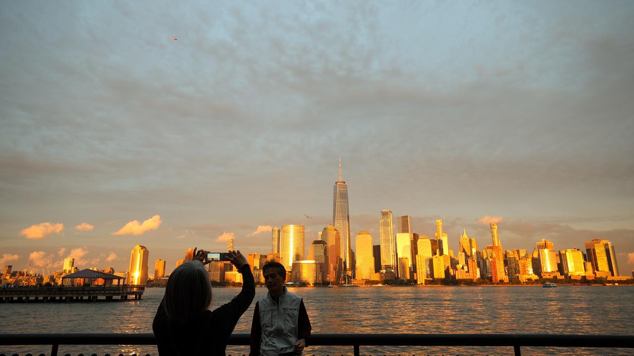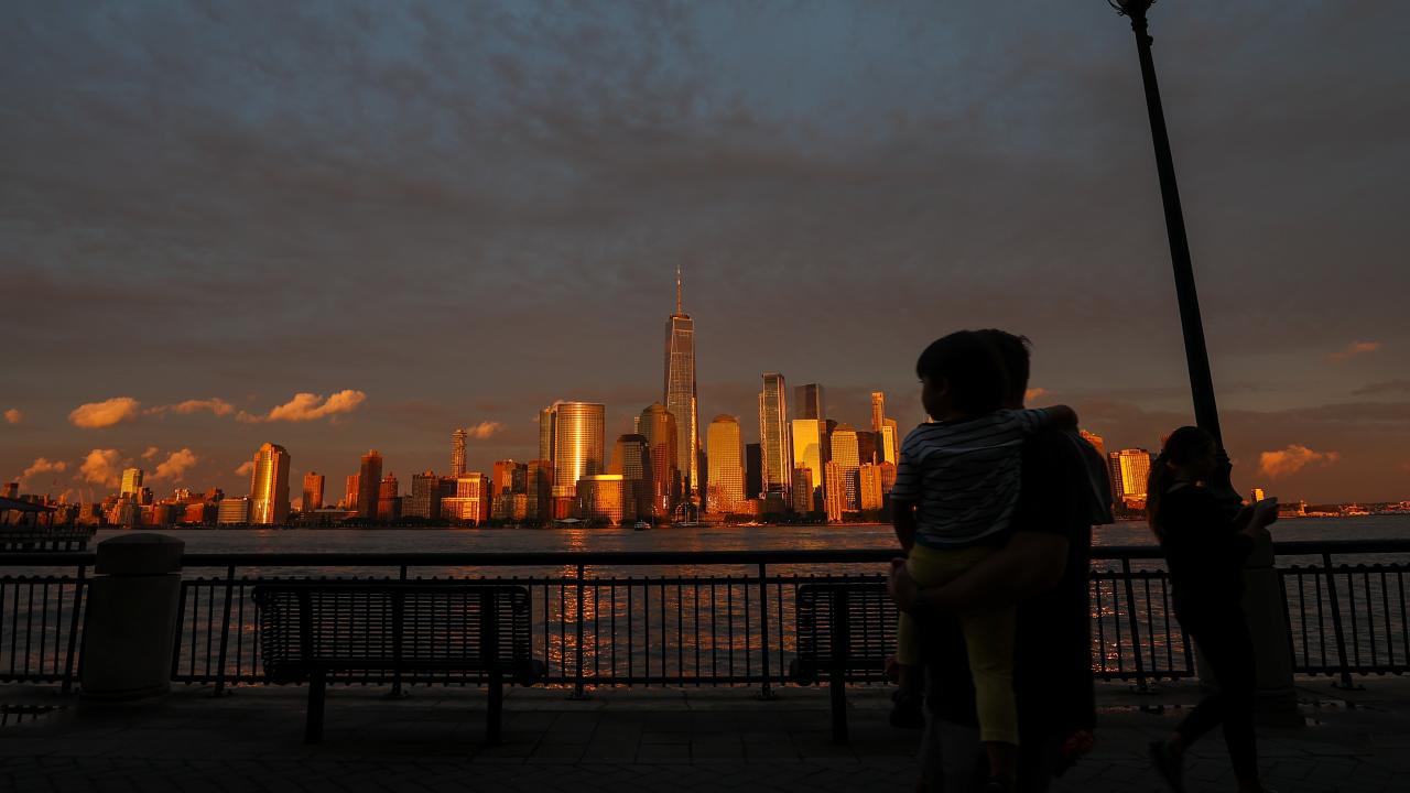 New York kentinin Aşağı Manhattan bölgesinde gün batımı, Jersey City'den görüntülendi.