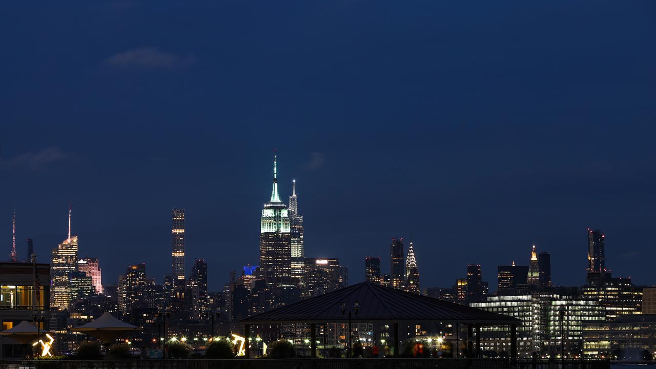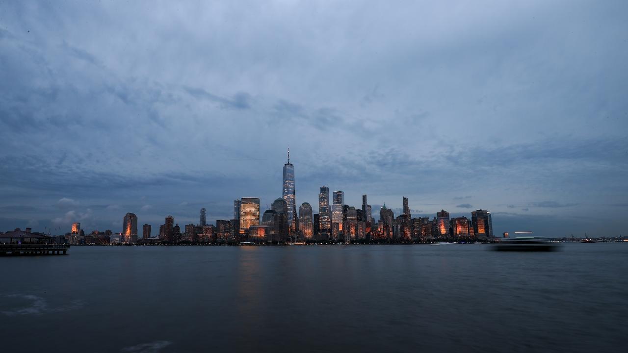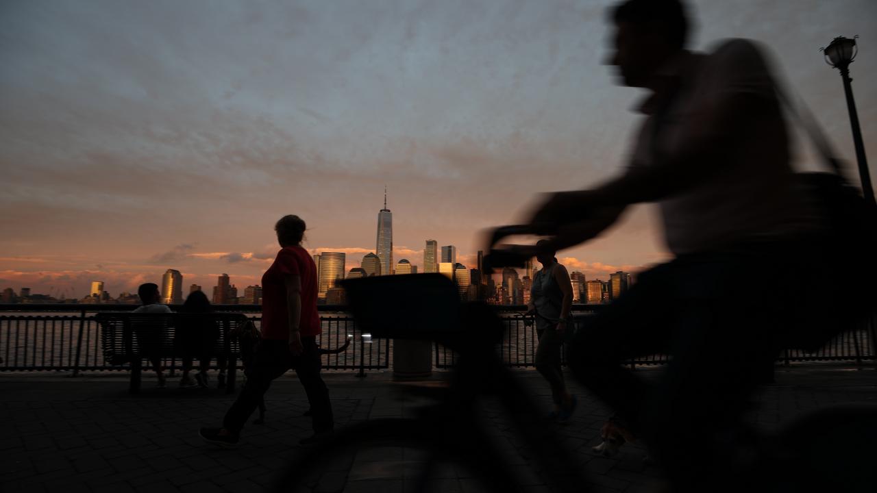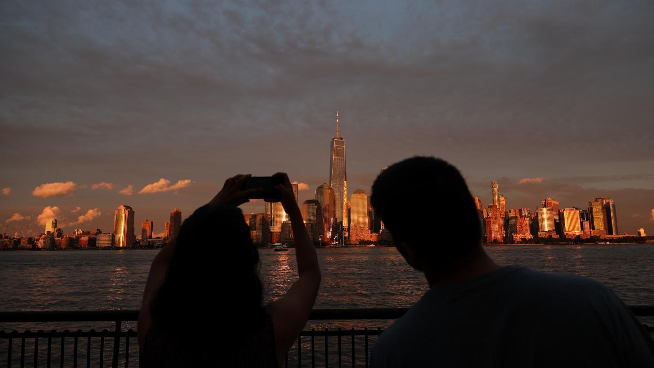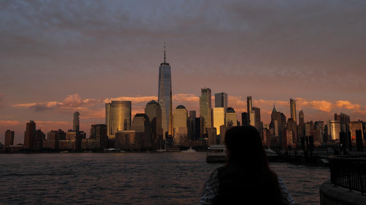 New York kentinin Aşağı Manhattan bölgesinde gün batımı, Jersey City'den görüntülendi.