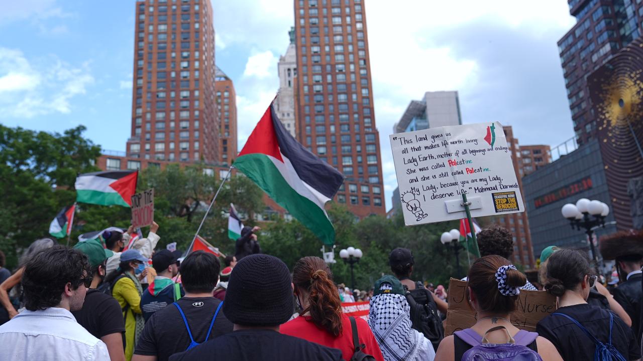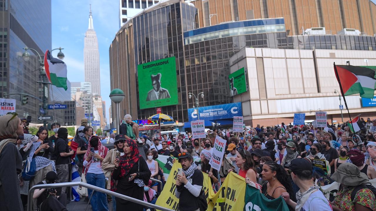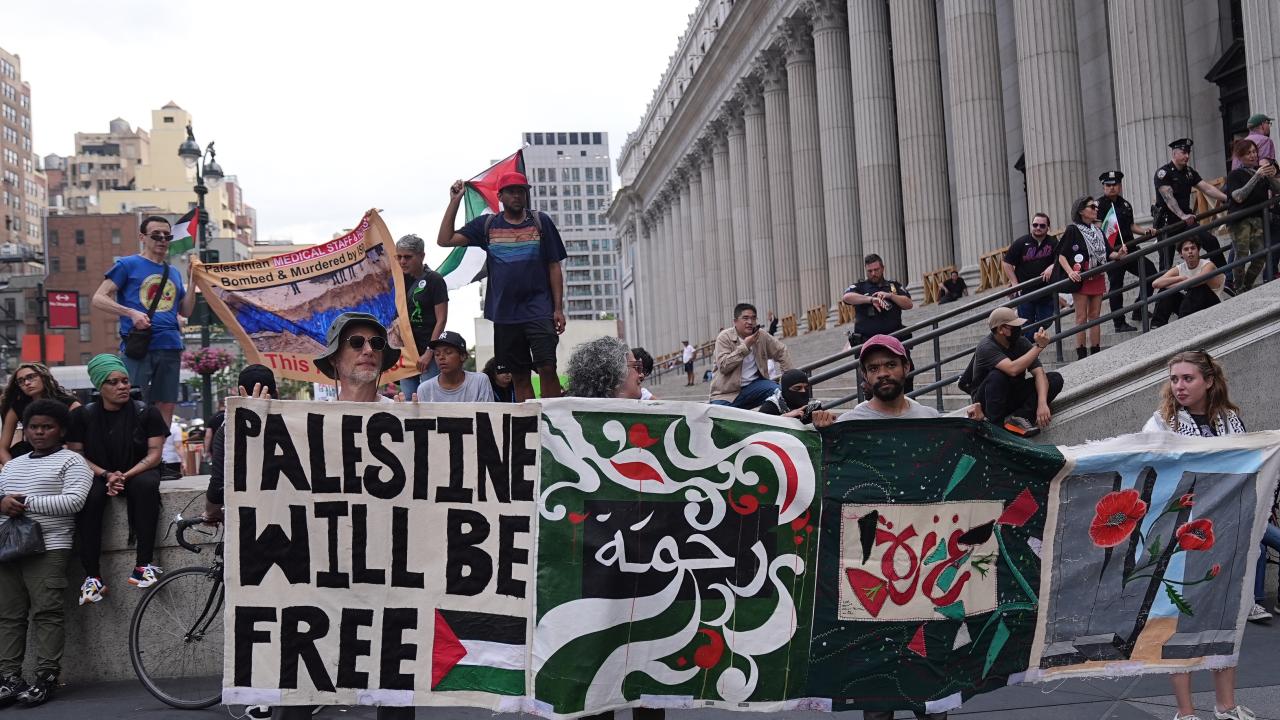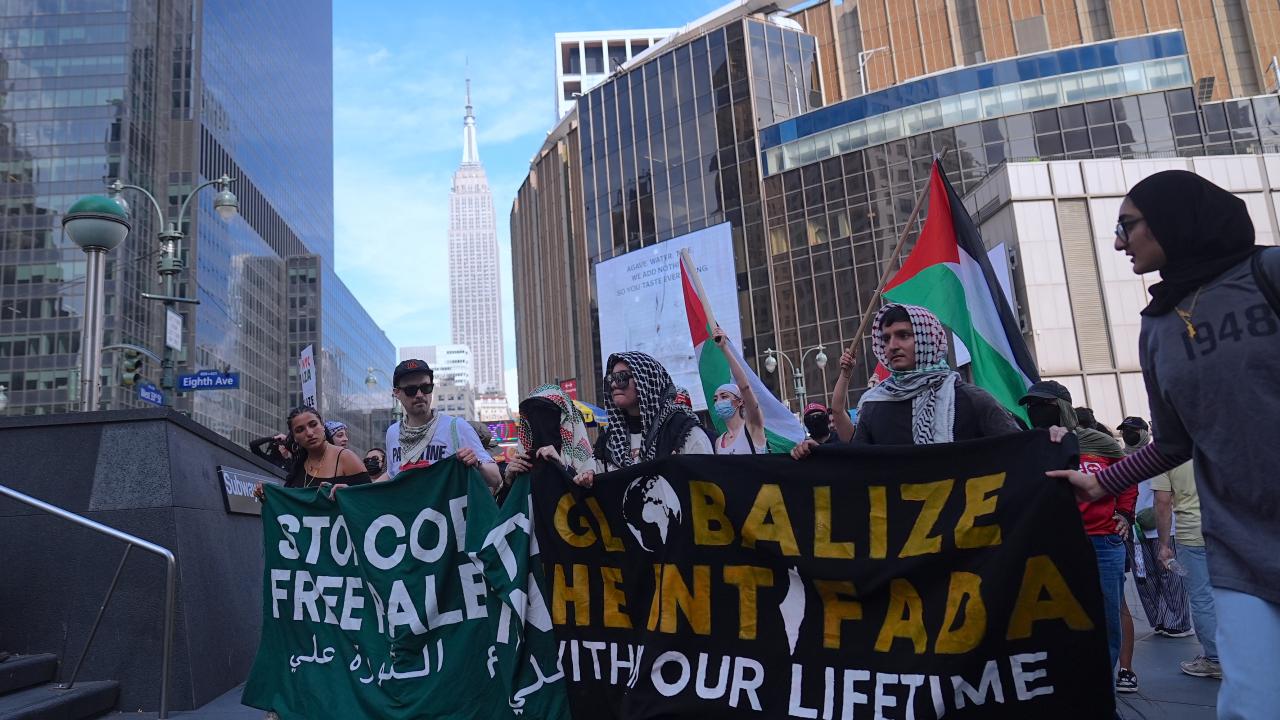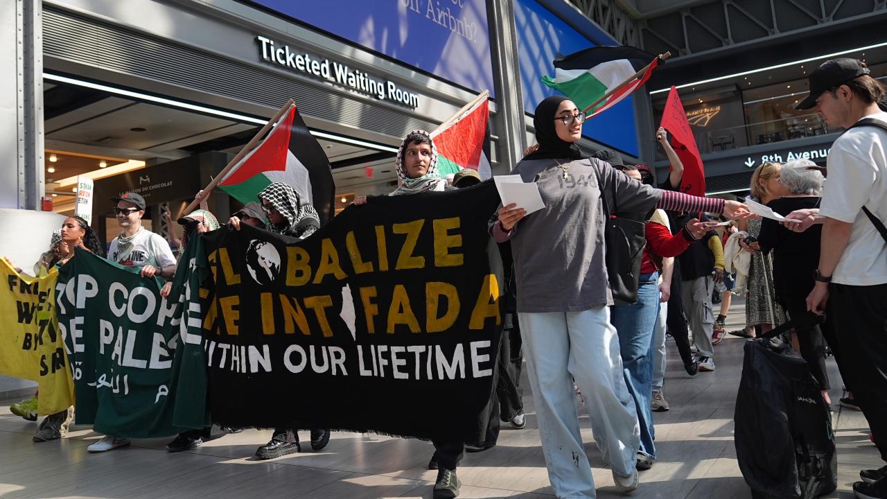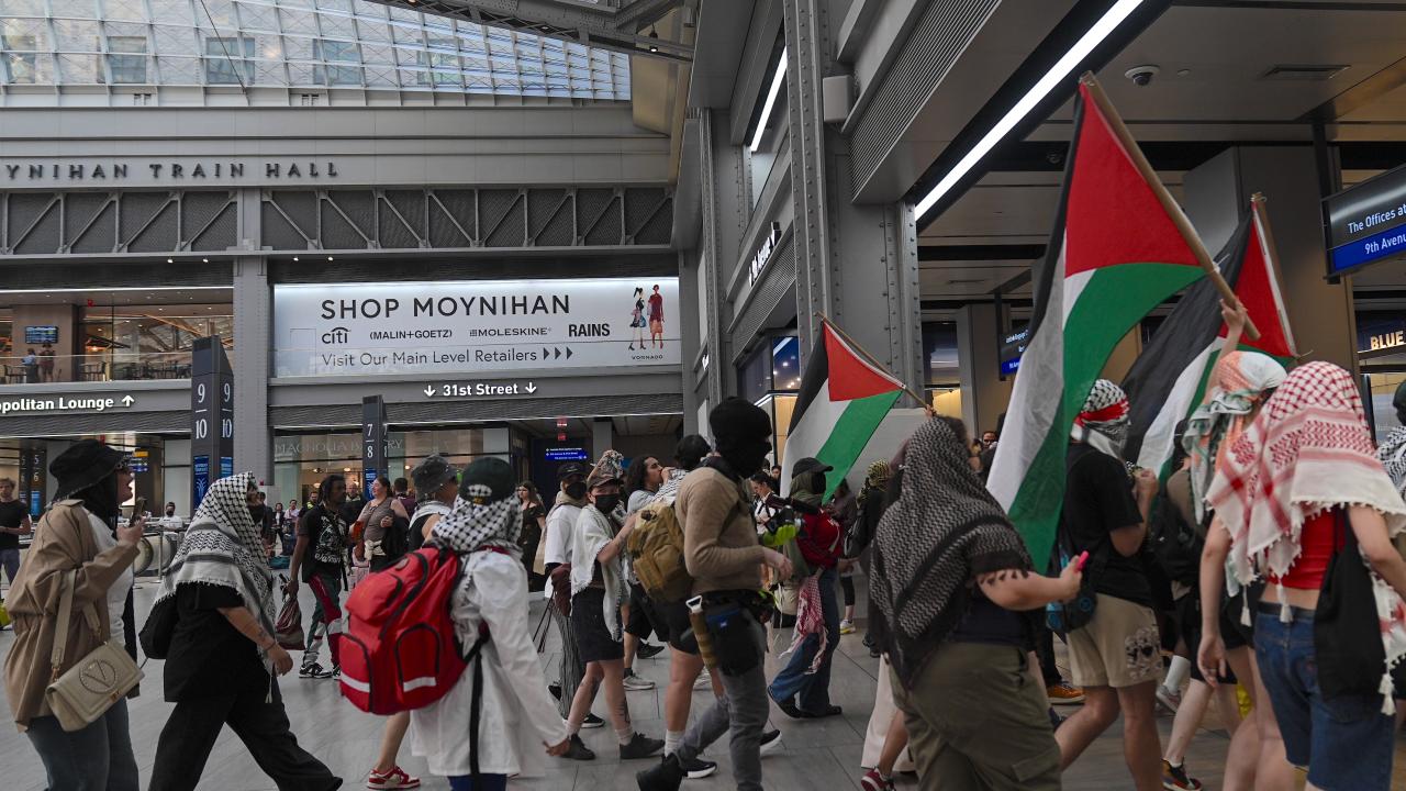 ABD'nin New York kentinde Filistin destekçileri, İsrail'in Gazze ve İran'a yönelik saldırılarını ve Trump yönetiminin savaşa müdahil olmasını protesto etmek amacıyla Union Meydanı'nda bir araya gelerek Manhattan'daki büyük tren istasyonu Moynihan Tren Salonu'na yürüdü. Polis ekipleri güvenlik önlemleri aldı.