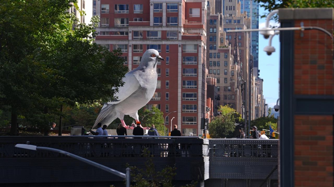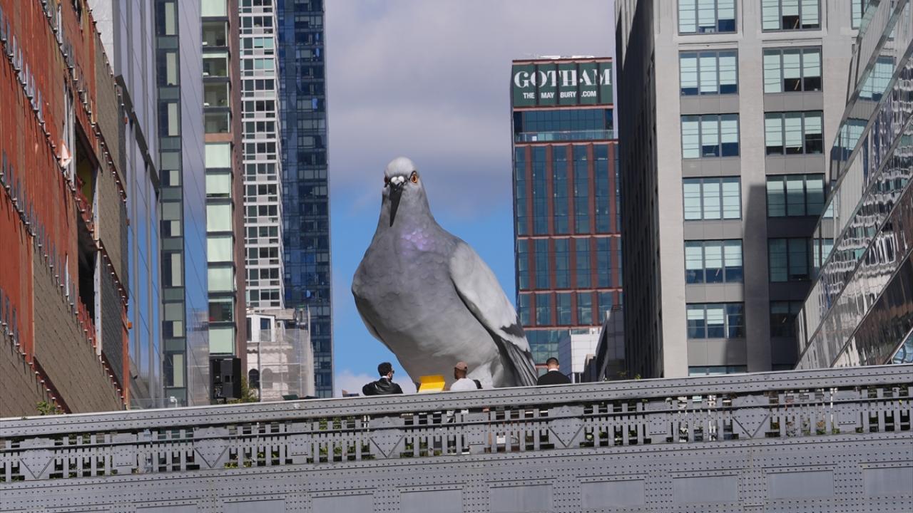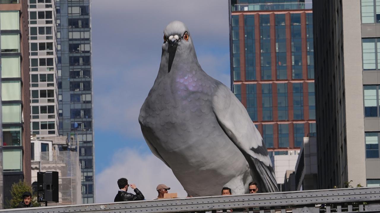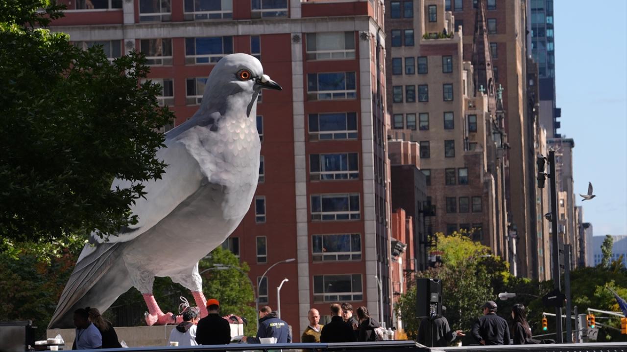 New York'ta yükselen devasa güvercin heykeli görenleri şaşırtıyor.