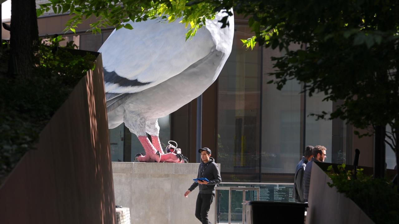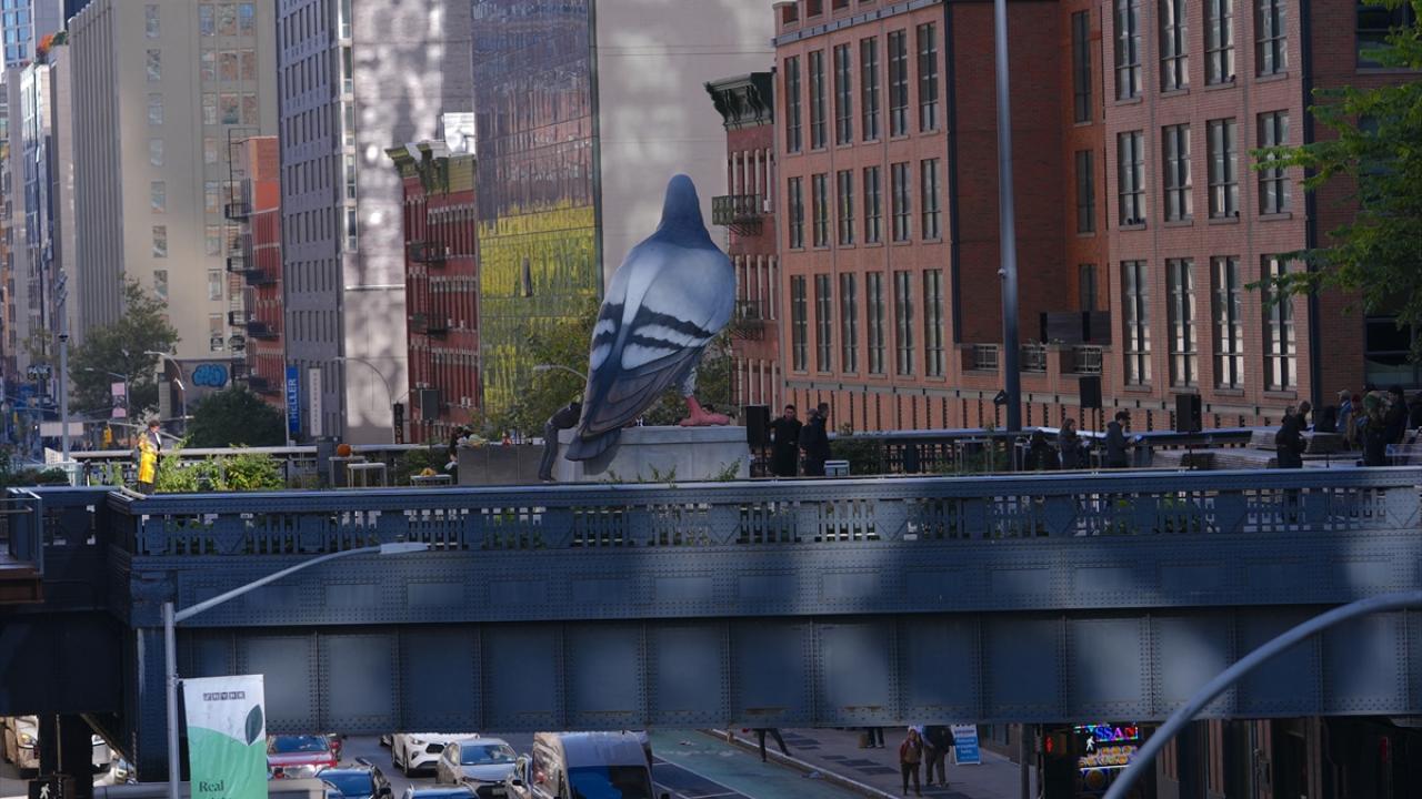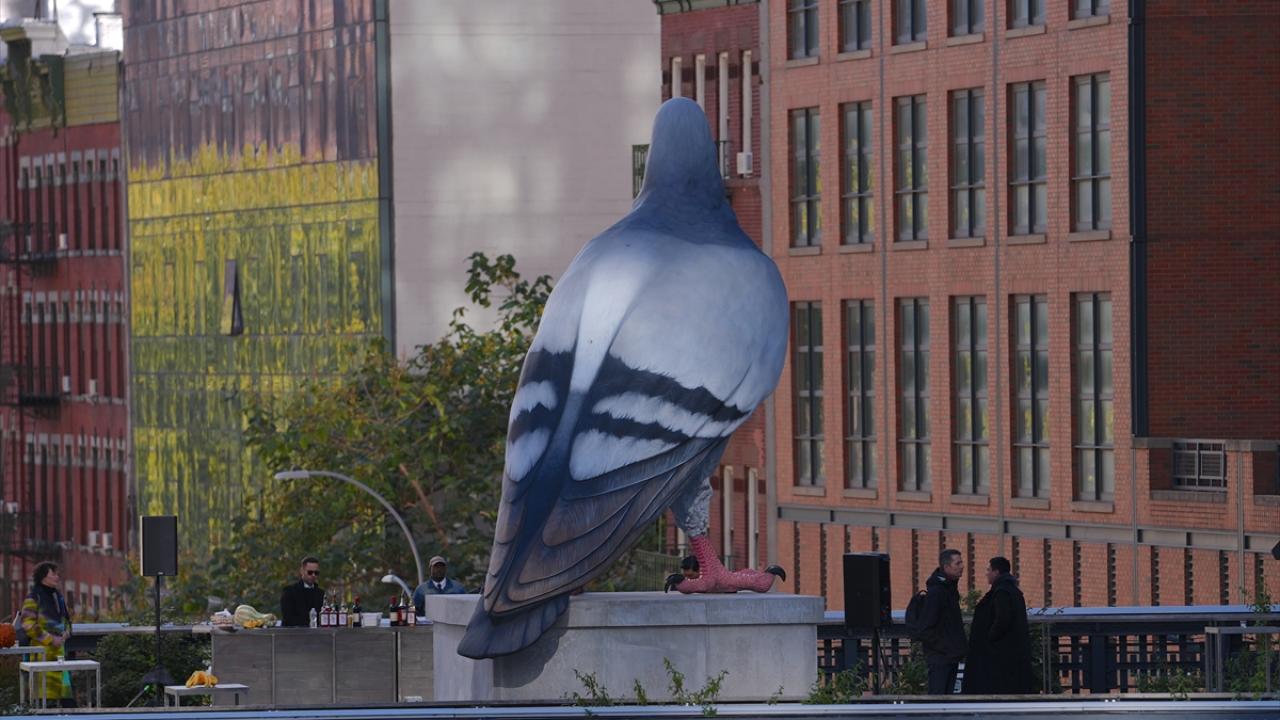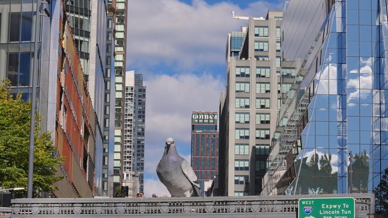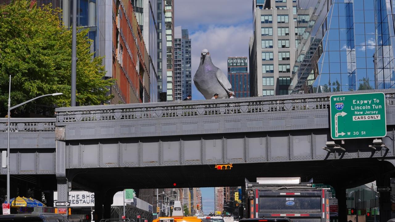 New York'ta yükselen devasa güvercin heykeli görenleri şaşırtıyor.