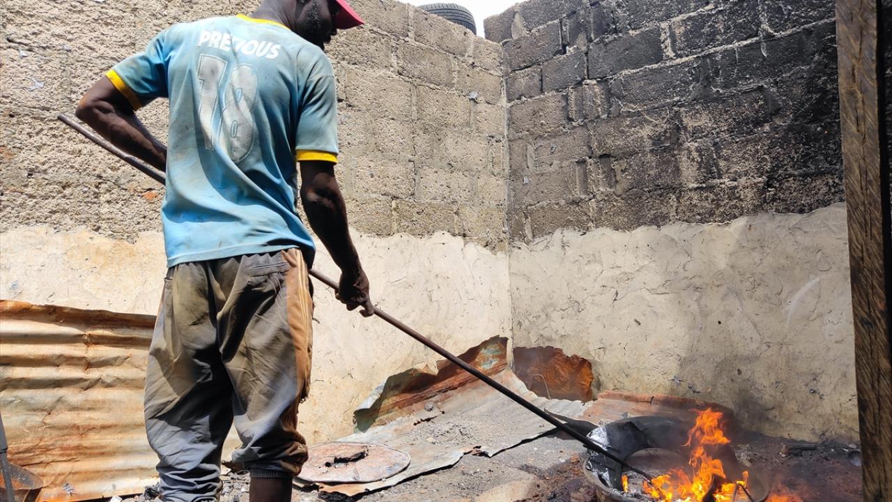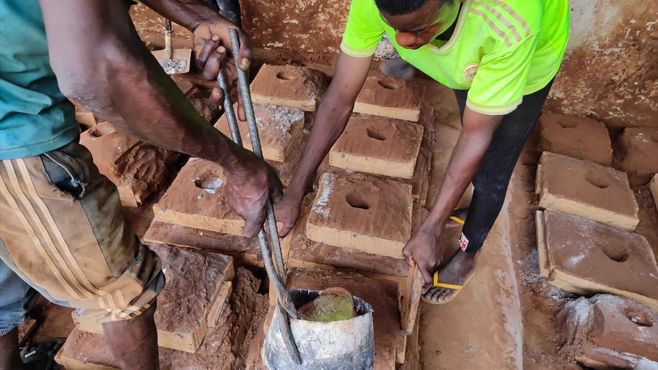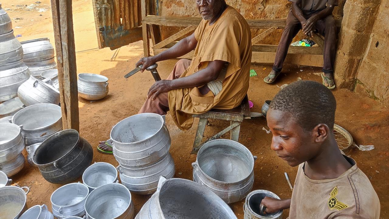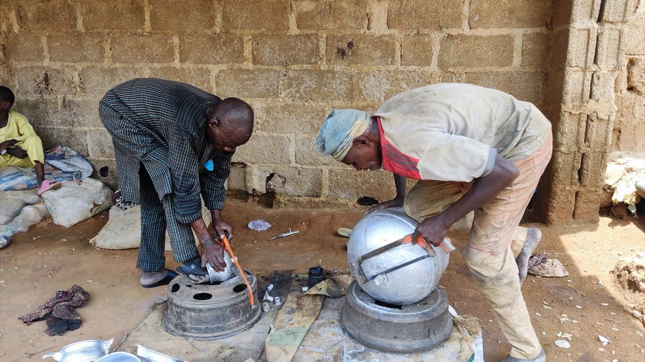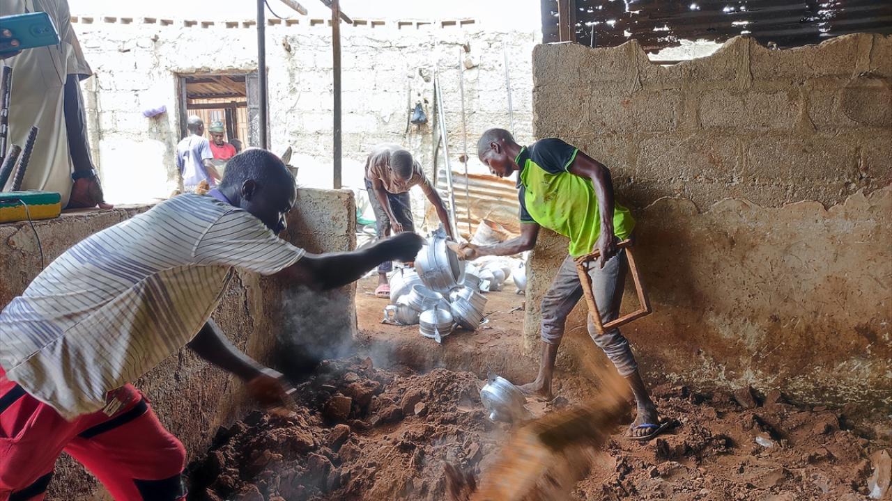 Hurda eşyaları ateşte eriterek elde ettikleri ham maddeyi toprağın içinde hazırlanan kalıplara döken Nijeryalı işçiler, elleriyle kalıpları düzenleyerek alüminyum tencereler üretiyor.