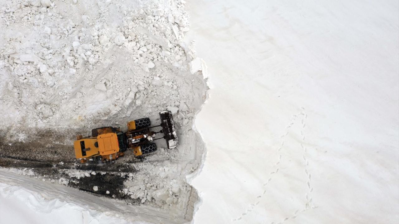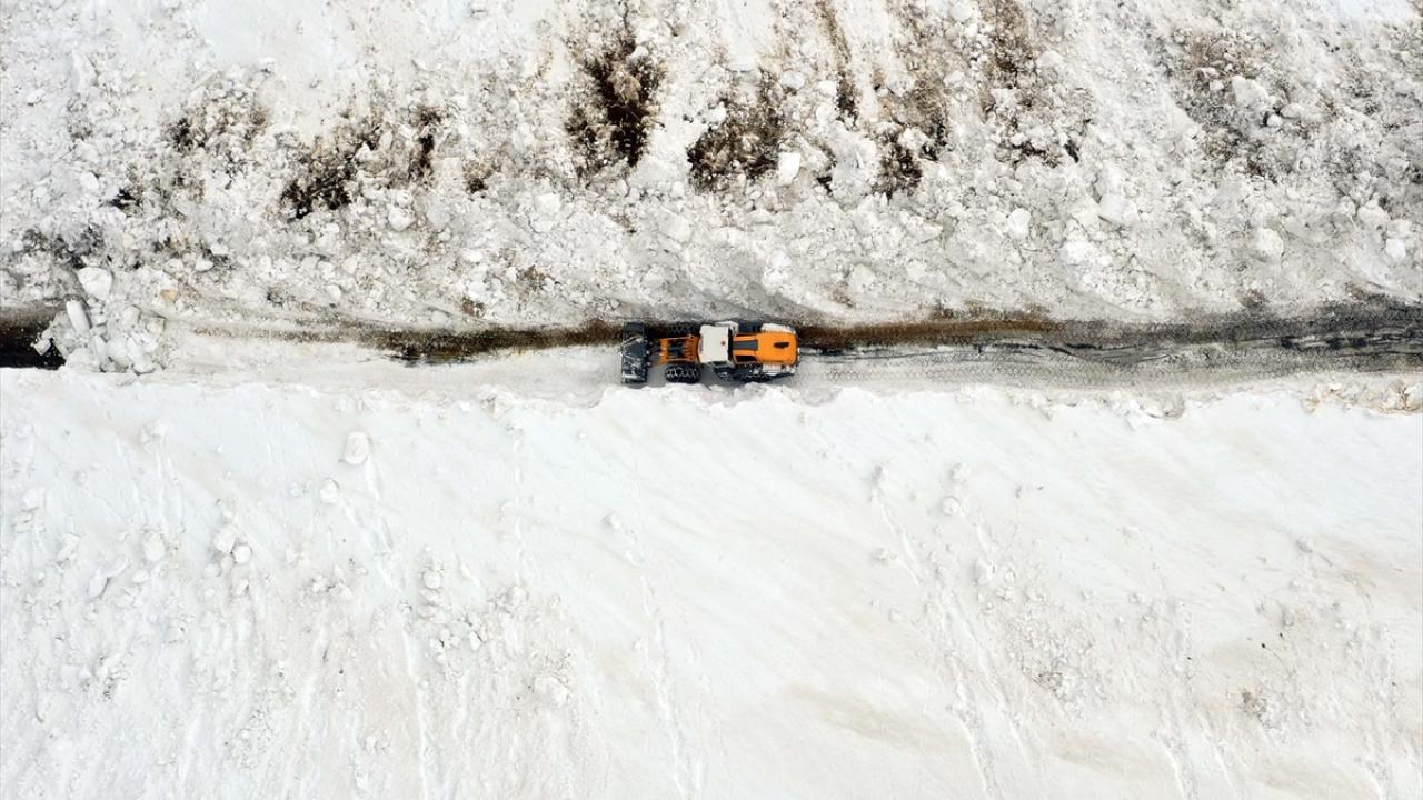Kente 10 kilometre uzaklıktaki Çavuştepe mevkisinde karla mücadele eden ekiplerin zorlu çalışması dronla görüntülendi.