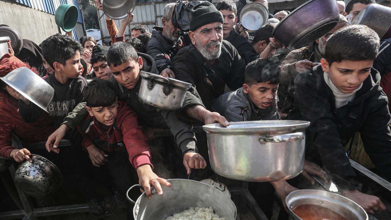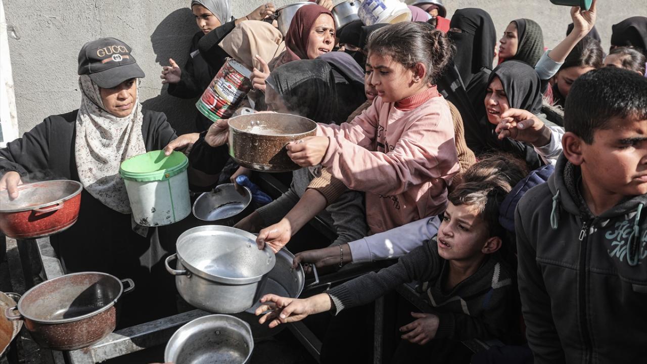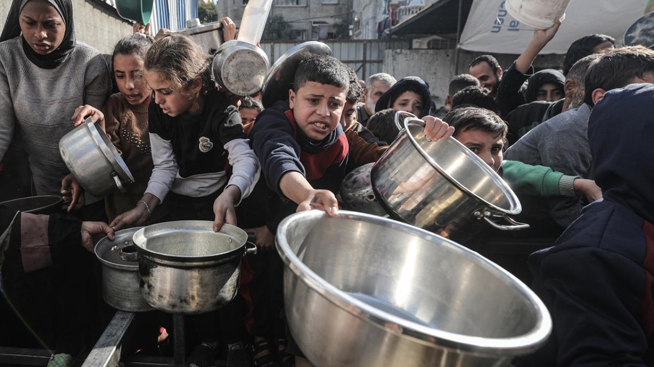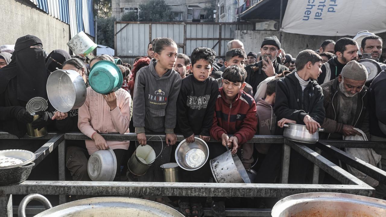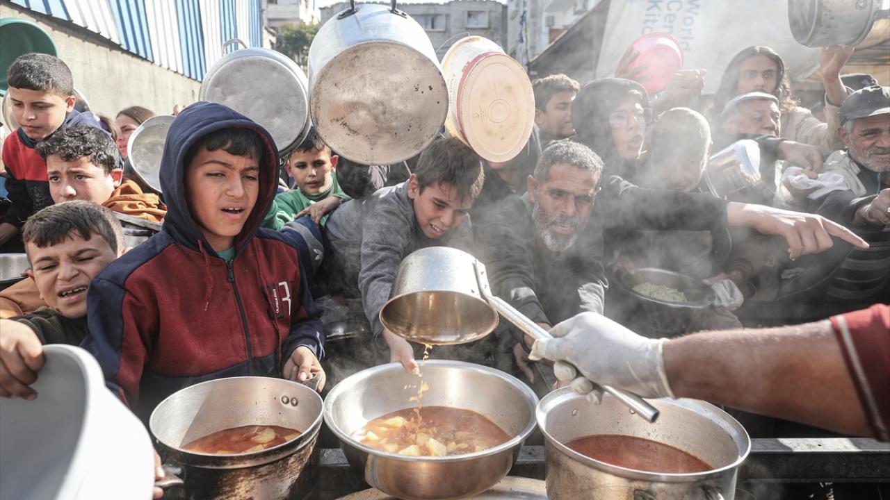 Yemekten almak isteyen ve aralarında çocukların da bulunduğu çok sayıda Filistinli bir kap yemeğe ulaşabilmek için soğuk havaya rağmen yoğunluk oluşturdu.