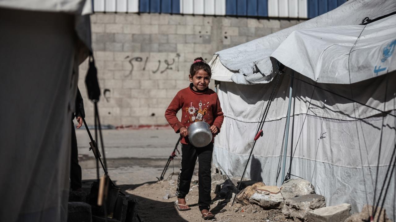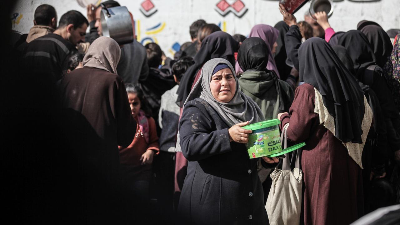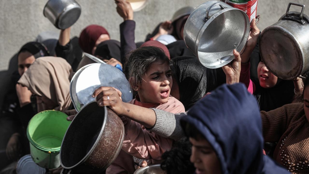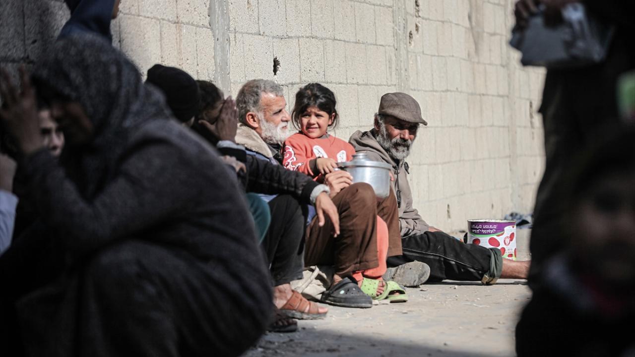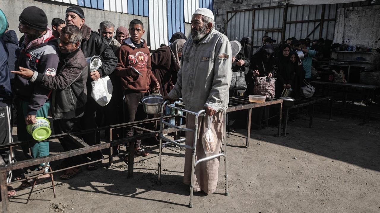 Yemekten almak isteyen ve aralarında çocukların da bulunduğu çok sayıda Filistinli bir kap yemeğe ulaşabilmek için soğuk havaya rağmen yoğunluk oluşturdu.