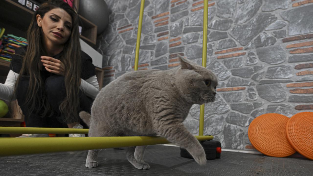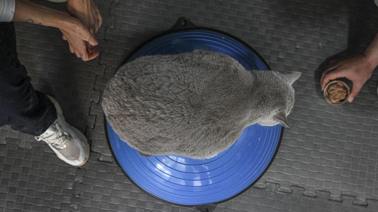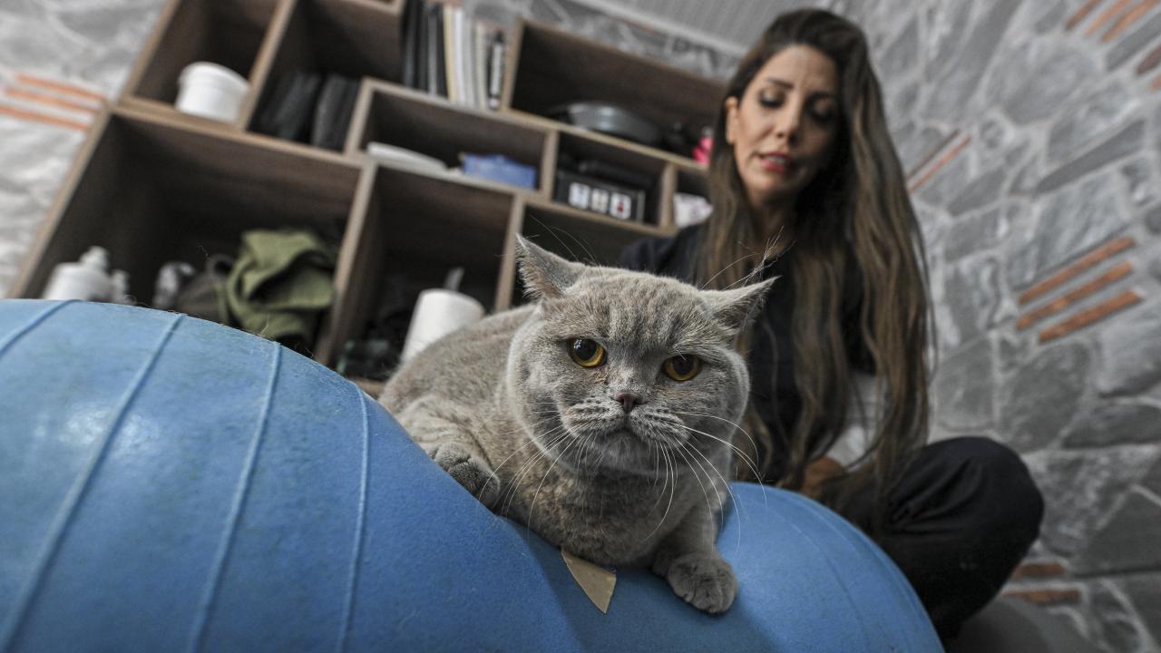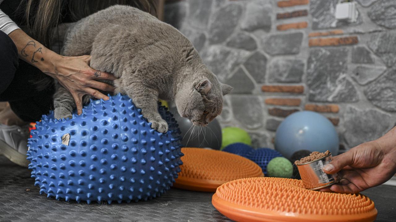 Düzensiz beslenme ve hareketsizlik nedeniyle obeziteye yakalanan 4 yaşındaki kedi "Şiraz", pilates yaparak, havuzda yüzerek fazla kilolarından kurtulmaya çalışıyor.