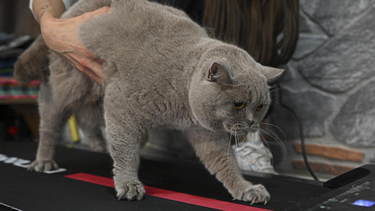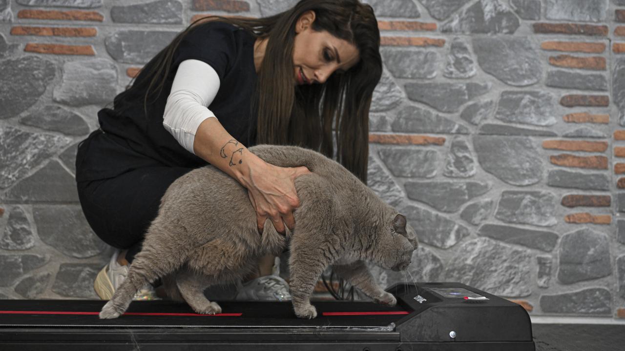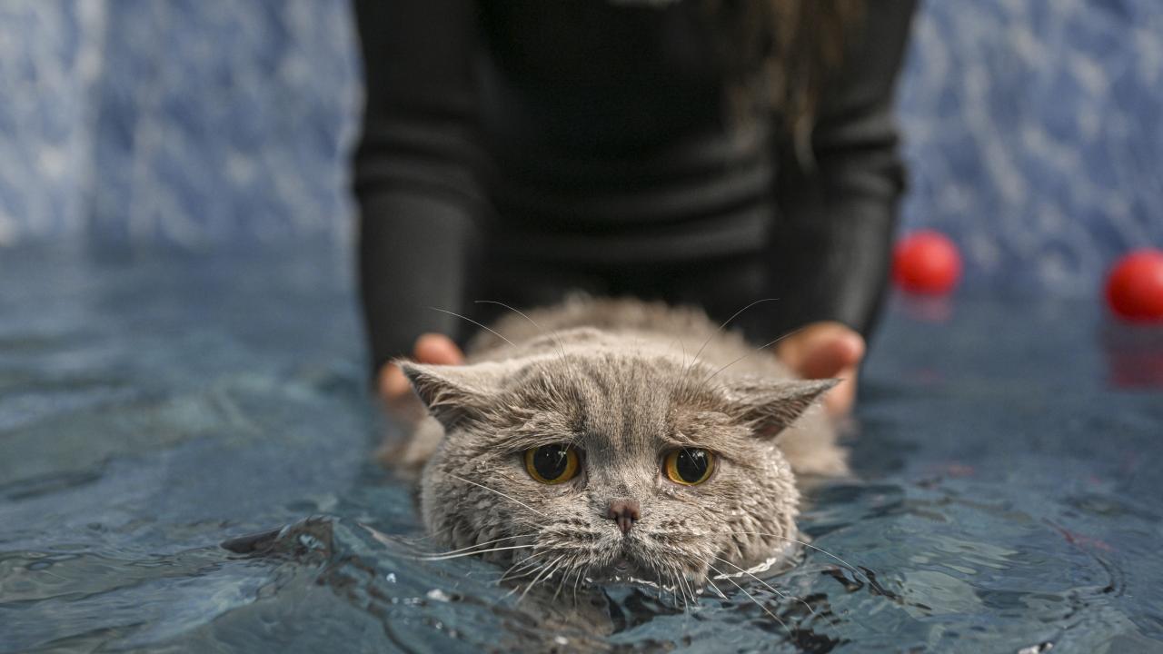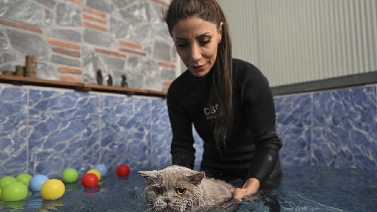 Düzensiz beslenme ve hareketsizlik nedeniyle obeziteye yakalanan 4 yaşındaki kedi "Şiraz", pilates yaparak, havuzda yüzerek fazla kilolarından kurtulmaya çalışıyor.