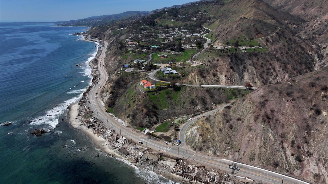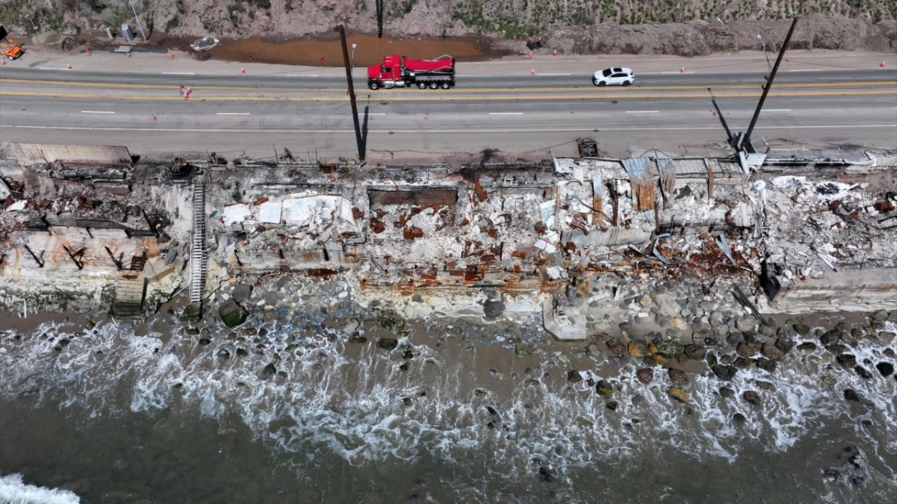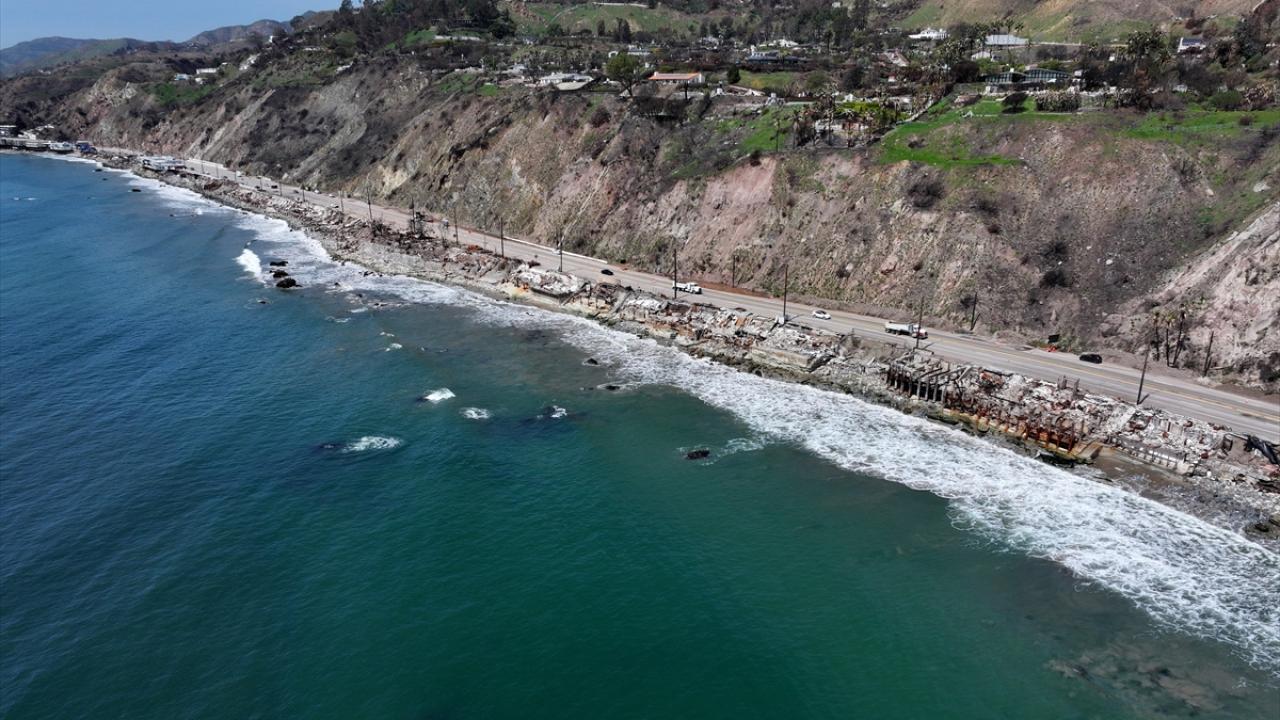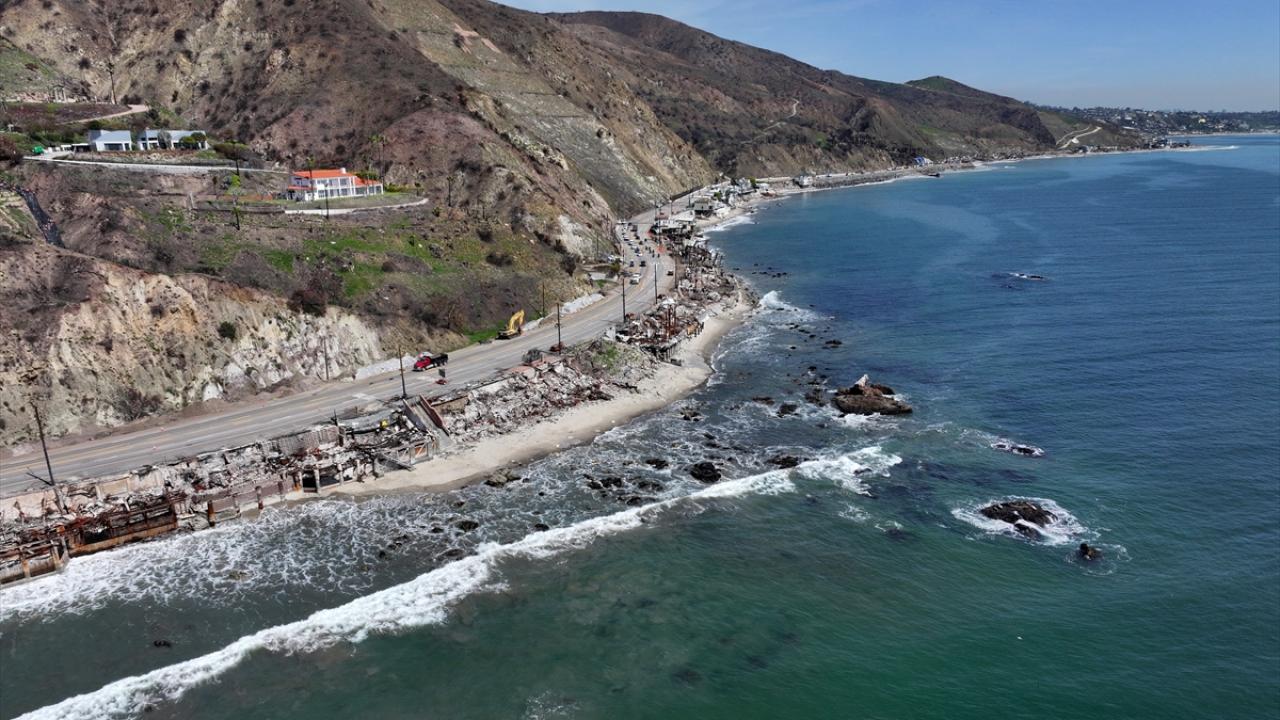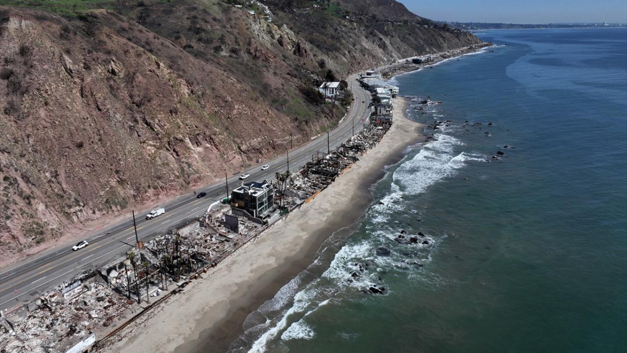 2025 yılının Ocak ayında meydana gelen büyük orman yangınlarının ardından, Los Angeles, California’daki Malibu’nun Pasifik kıyısında yanan evler ve yapılar görüntülendi.