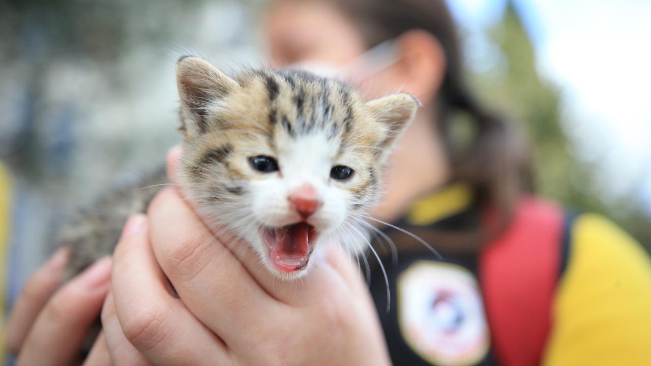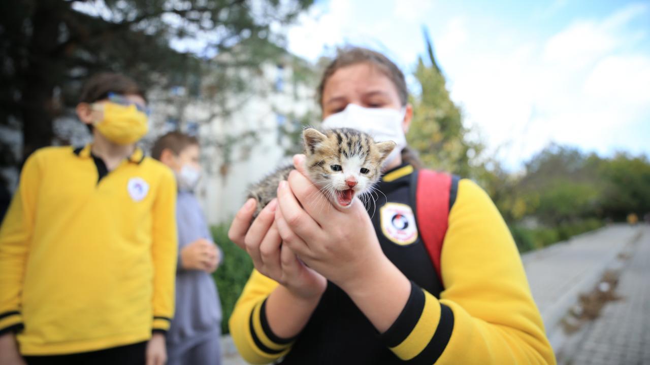 AA ekibinin öğrencilerin çalışmalarını görüntülediği sırada 12 yaşındaki Semiha Öztürk, su birikintisi içinde bulduğu yeni doğan bir kediyi öğretmenlerine getirdi.