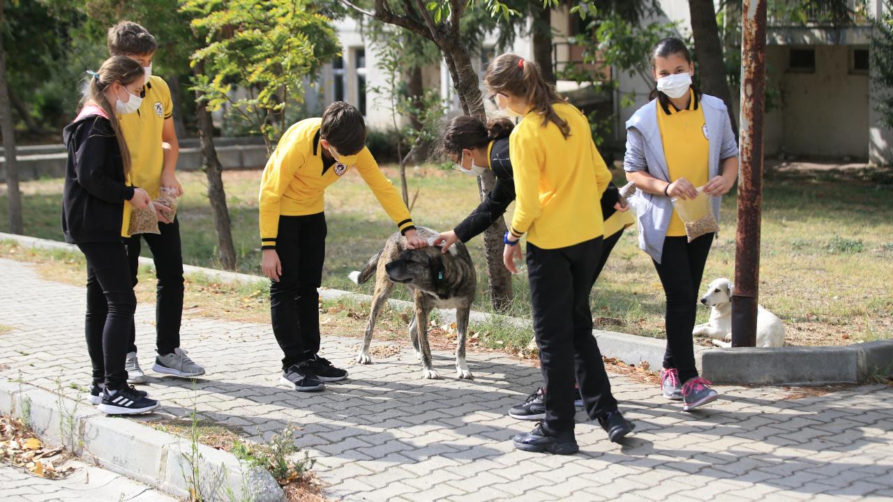 Toplanan paralarla sokak hayvanlarının beslenmesi için alınan mamalar, öğrenciler tarafından öğretmenlerinin gözetiminde okul bahçesi ile cadde ve sokaklara bırakılıyor.