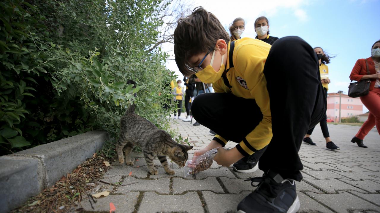 Kırklareli'nin Lüleburgaz ilçesinde TEK Ortaokulu öğrencileri, harçlıklarının bir kısmıyla satın aldıkları mamaları öğretmenleri gözetiminde sokak hayvanlarına bırakıyor.