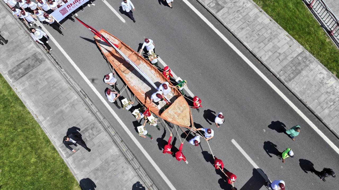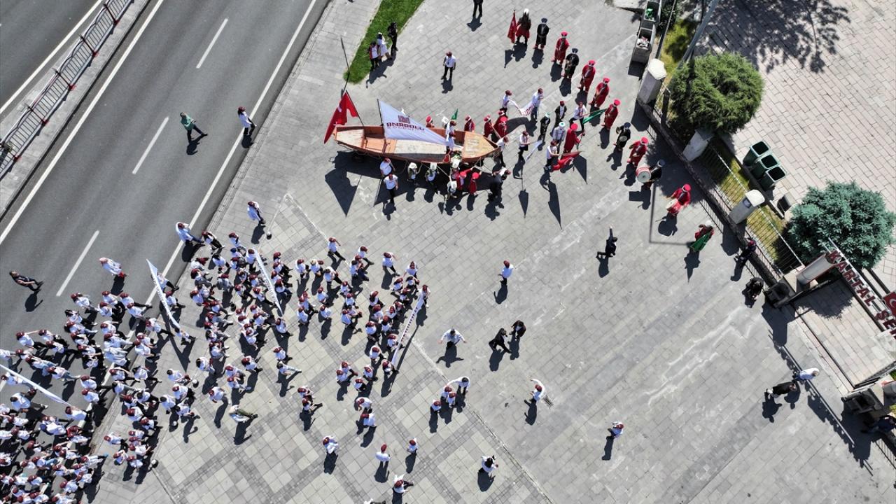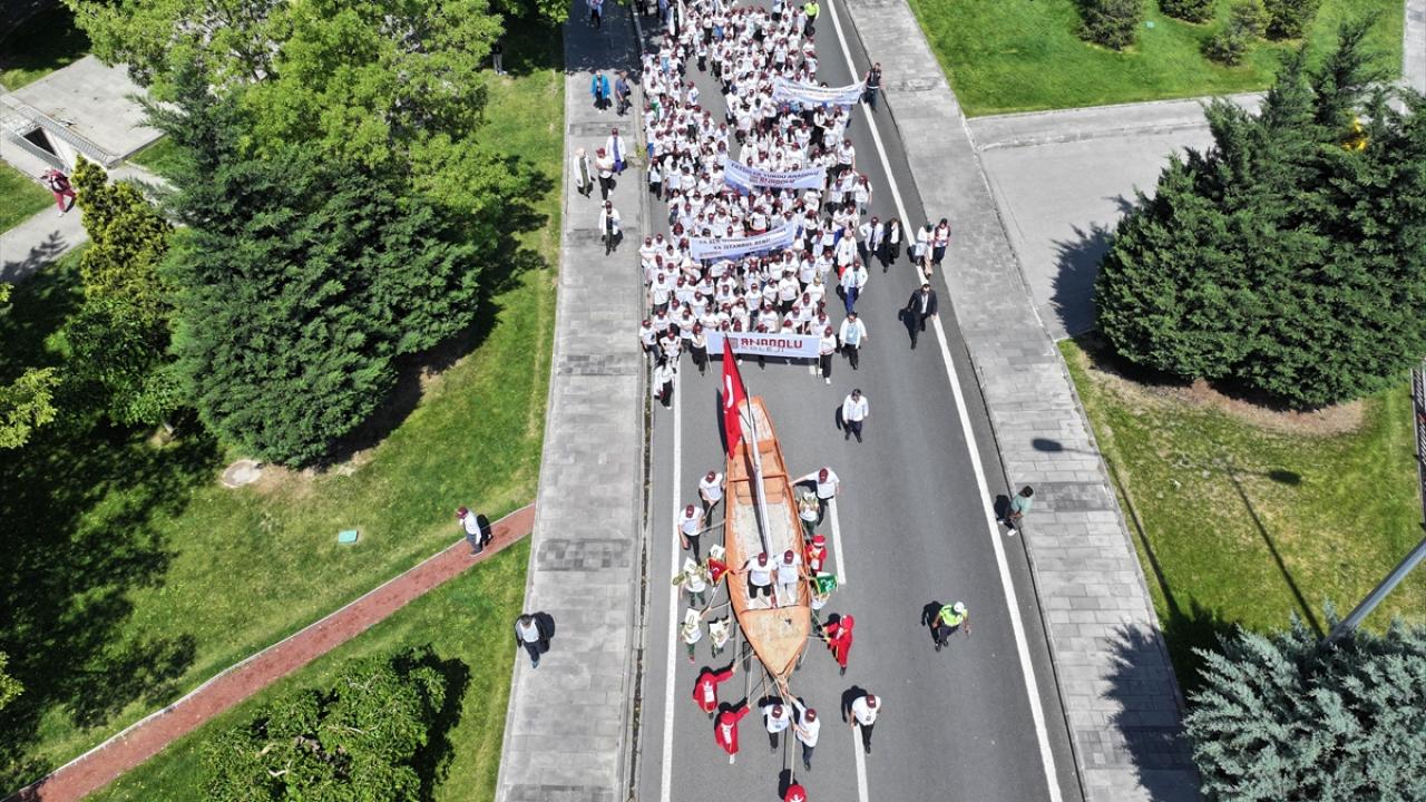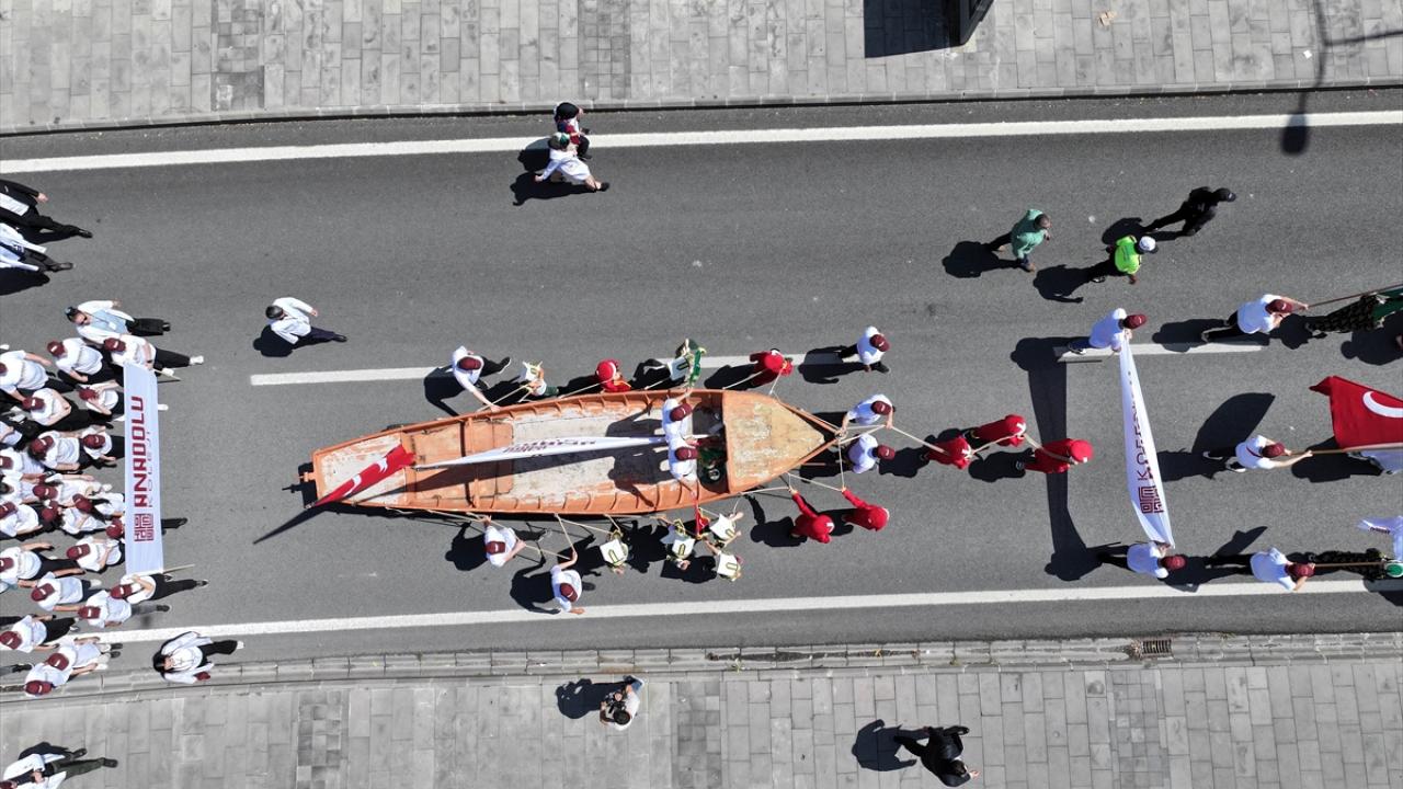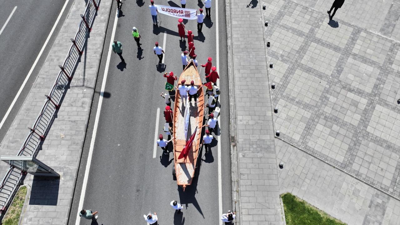 Öğrenciler, İstanbul`un fethinin yıl dönümü etkinlikleri için yaptırılan ve tekerlekli platforma yerleştirilen yaklaşık 6 metre uzunluğundaki gemiyi halatlarla çekerek Kartal Şehitliği`ne getirdi.