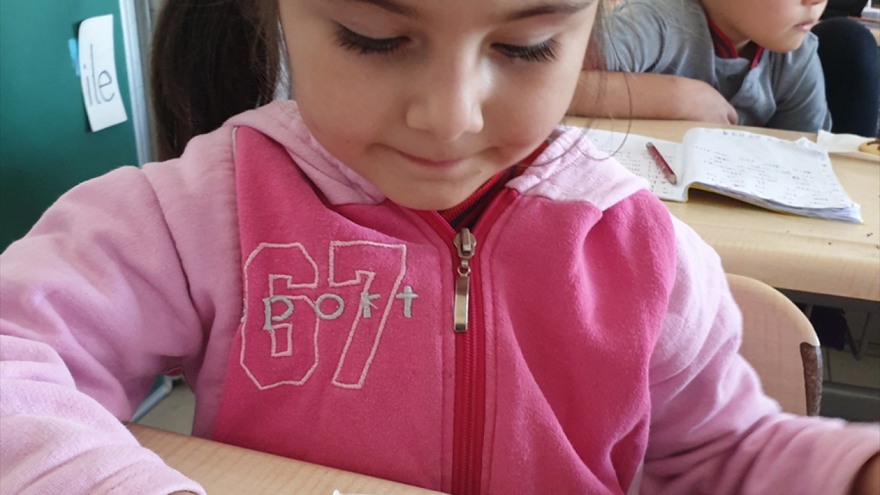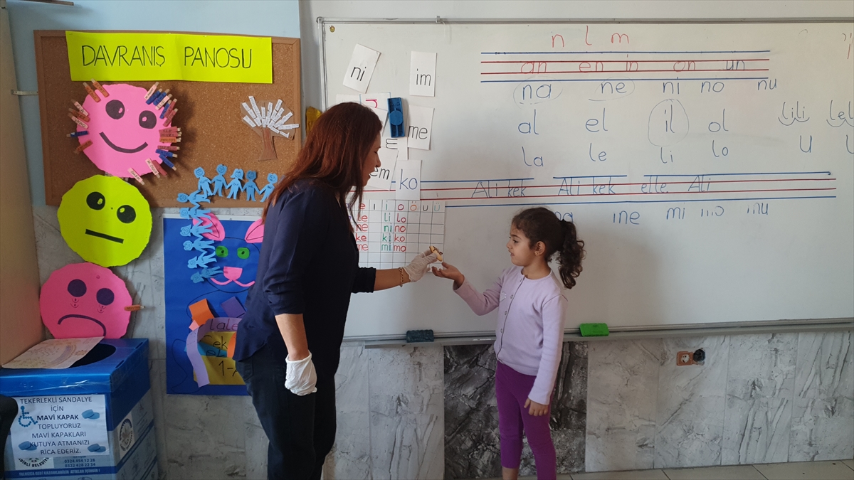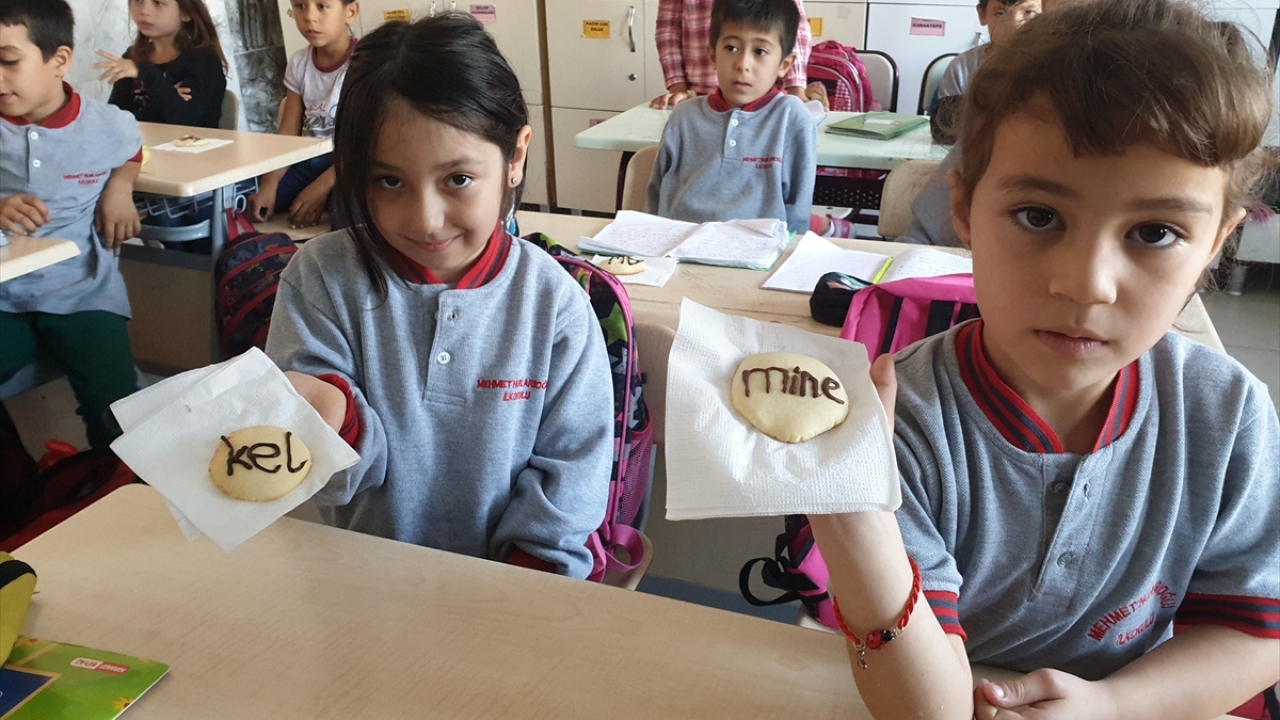 Osmaniye'de, öğrenciler üzerinde hece ve kelimelerin bulunduğu kurabiyelerle okuma yazmayı öğreniyor.