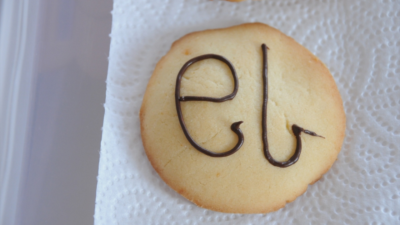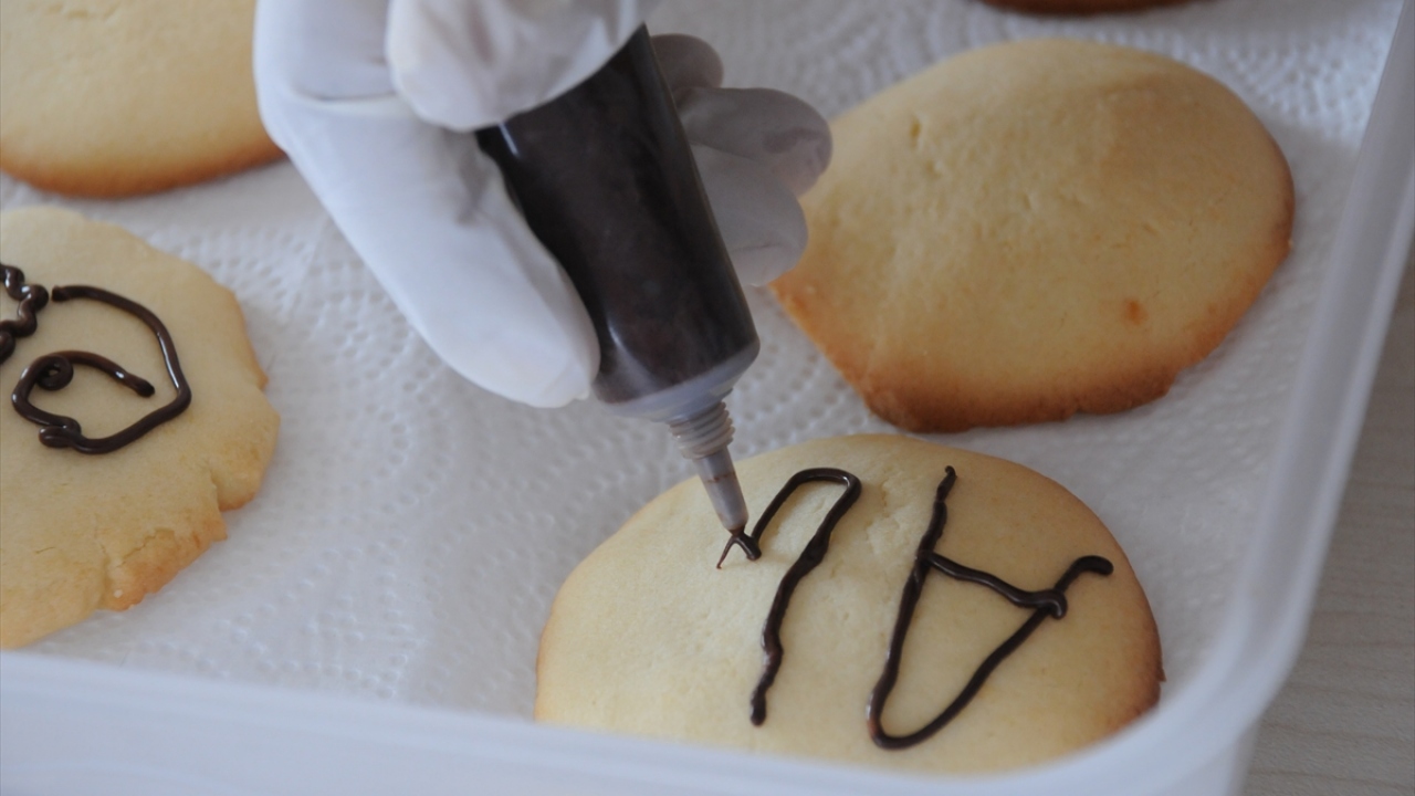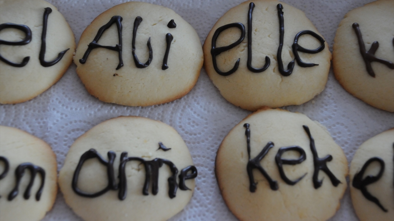 Öğrenciler, kendilerine dağıtılan kurabiyelerin üzerindeki yazıları okuyup, yazmasının ardından yiyebiliyor.