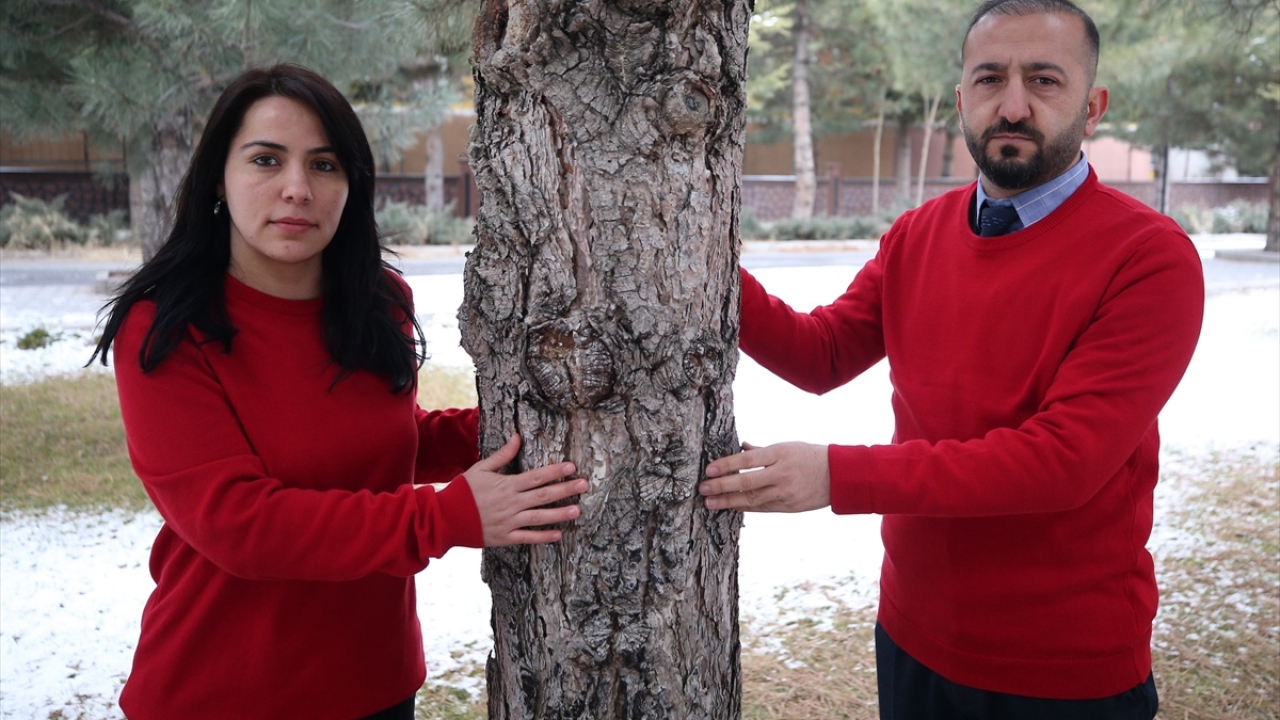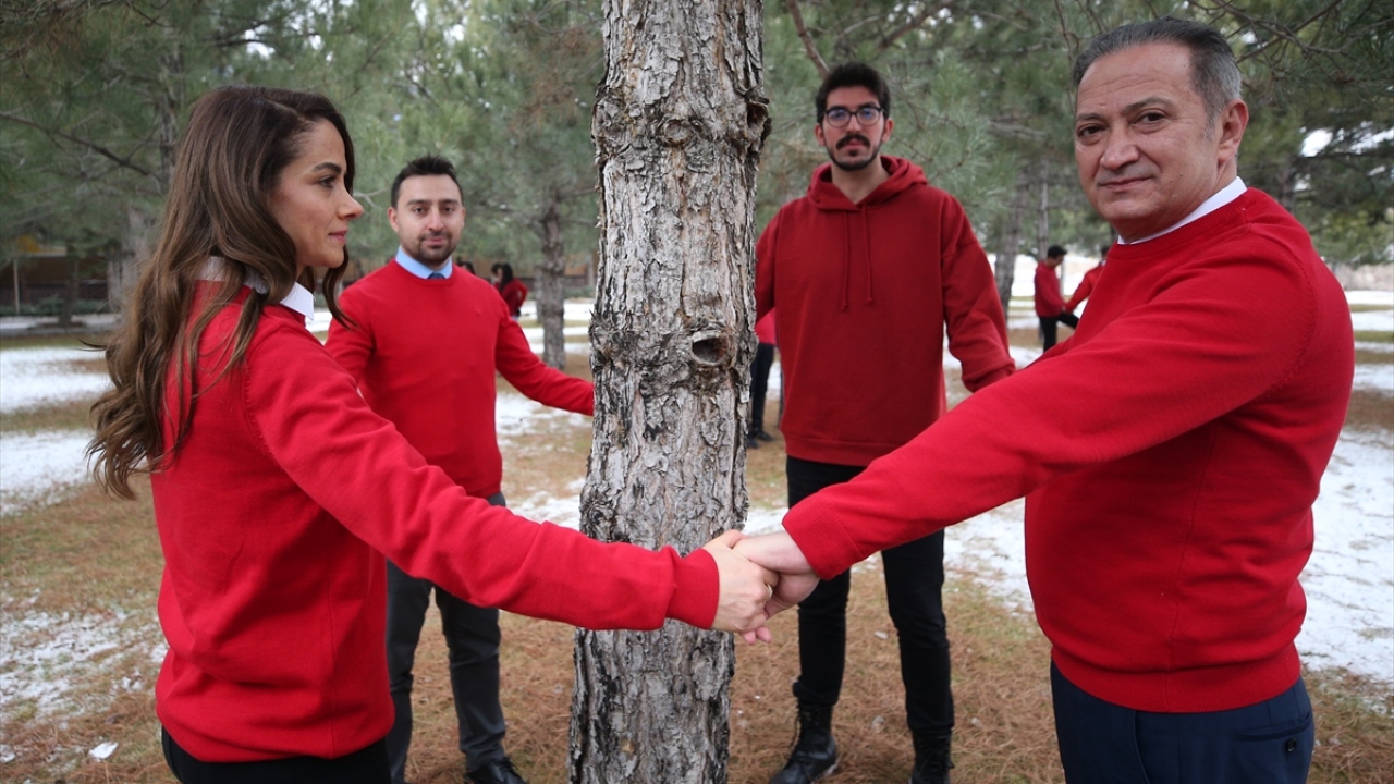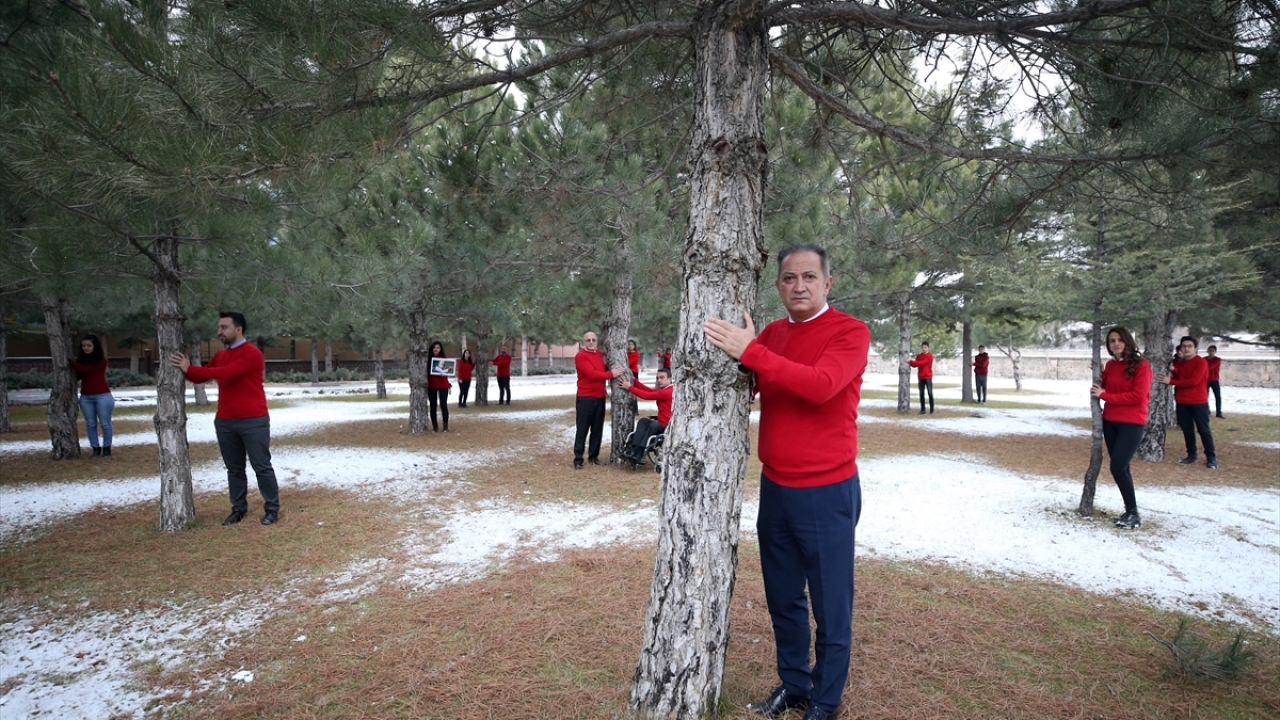 Etkinlikte kırmızı kazak giyen Celalettin Ekinci ve öğrenciler, Hayrettin Karaca`nın bir ağaca sarılmış haldeki fotoğrafına atfen okulun bahçesindeki çam ağaçlarına sarıldı.