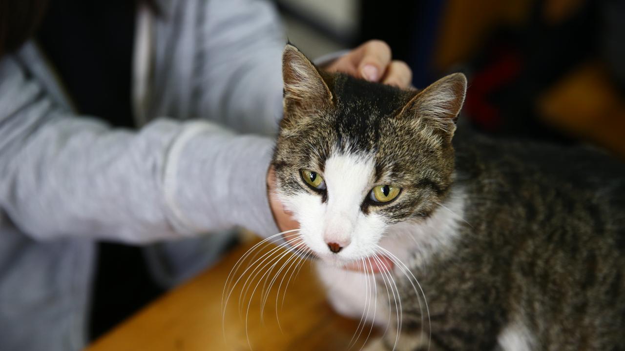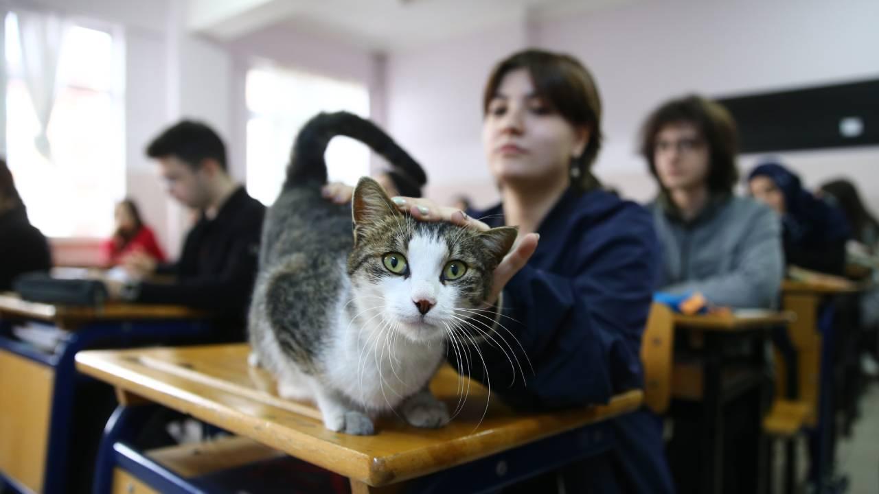 Gençlerin sahiplenerek `Sempatik` adını verdiği kedi yaklaşık iki aydır okulda kalıyor.